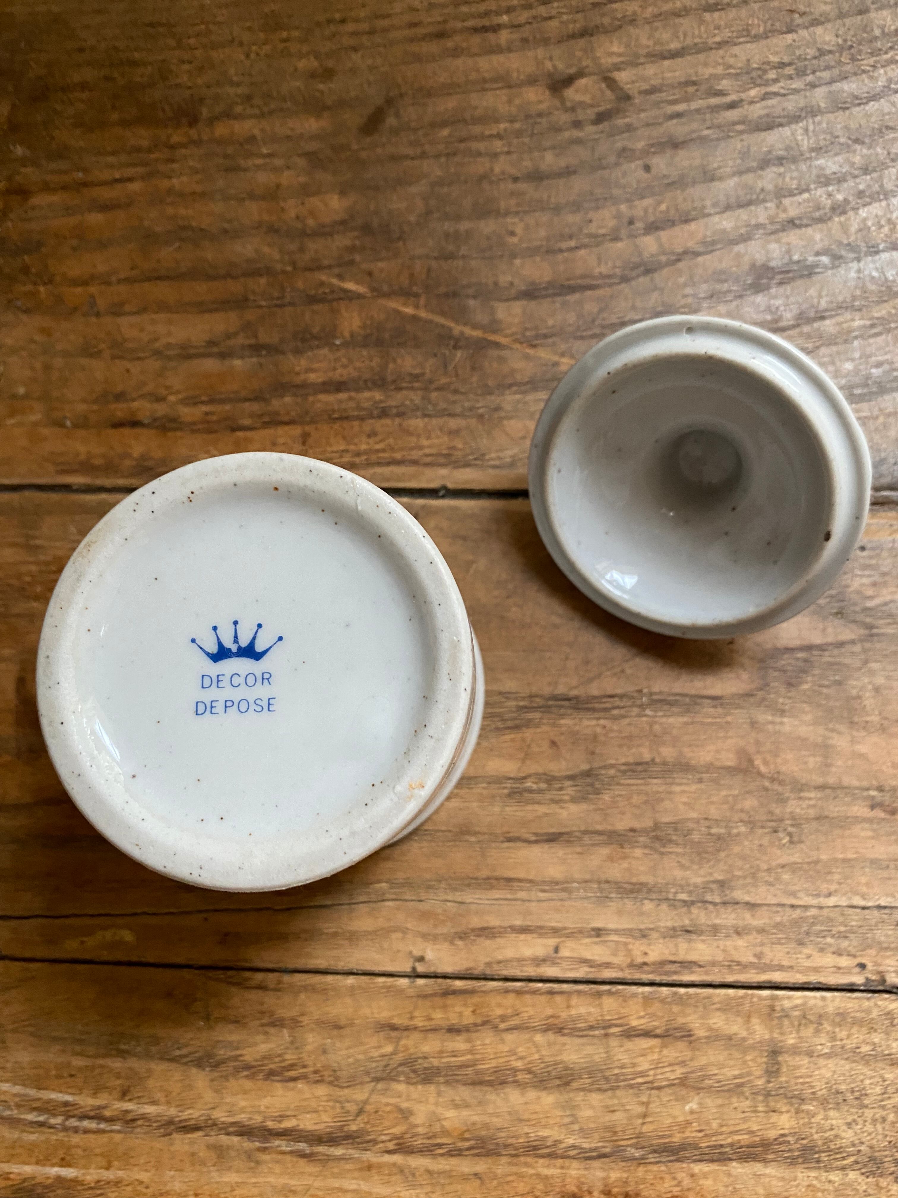 春のお花が可愛らしい蓋付きのヴィンテージ品となります。2つの絵柄を眺めると微妙に違ったタッチで描かれているのがわかります。
