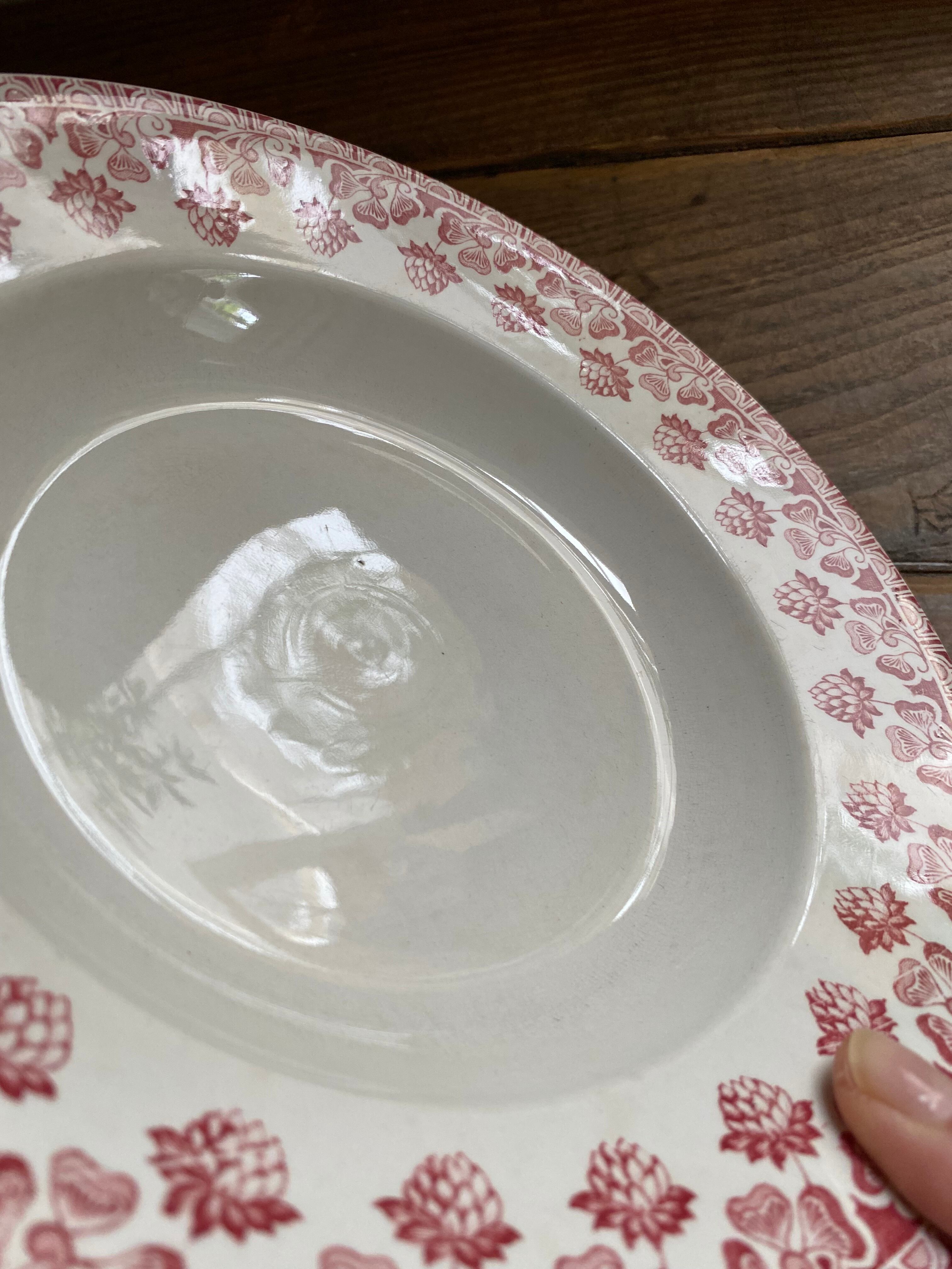 シロツメクサとクローバーの自然豊かな柄がリムを囲み、フランスのプレートはグリーンやブルーなどが多い中、赤のタイプは珍しくもあります。