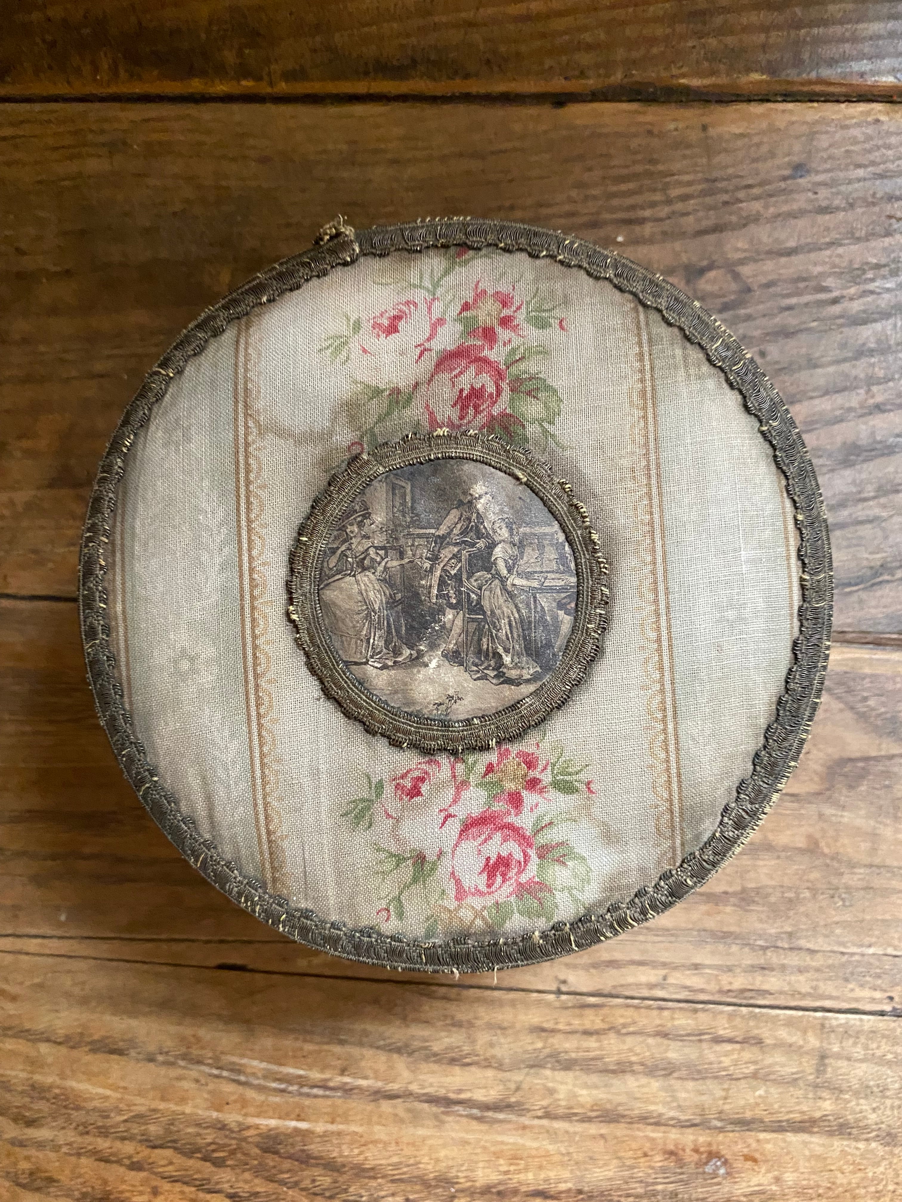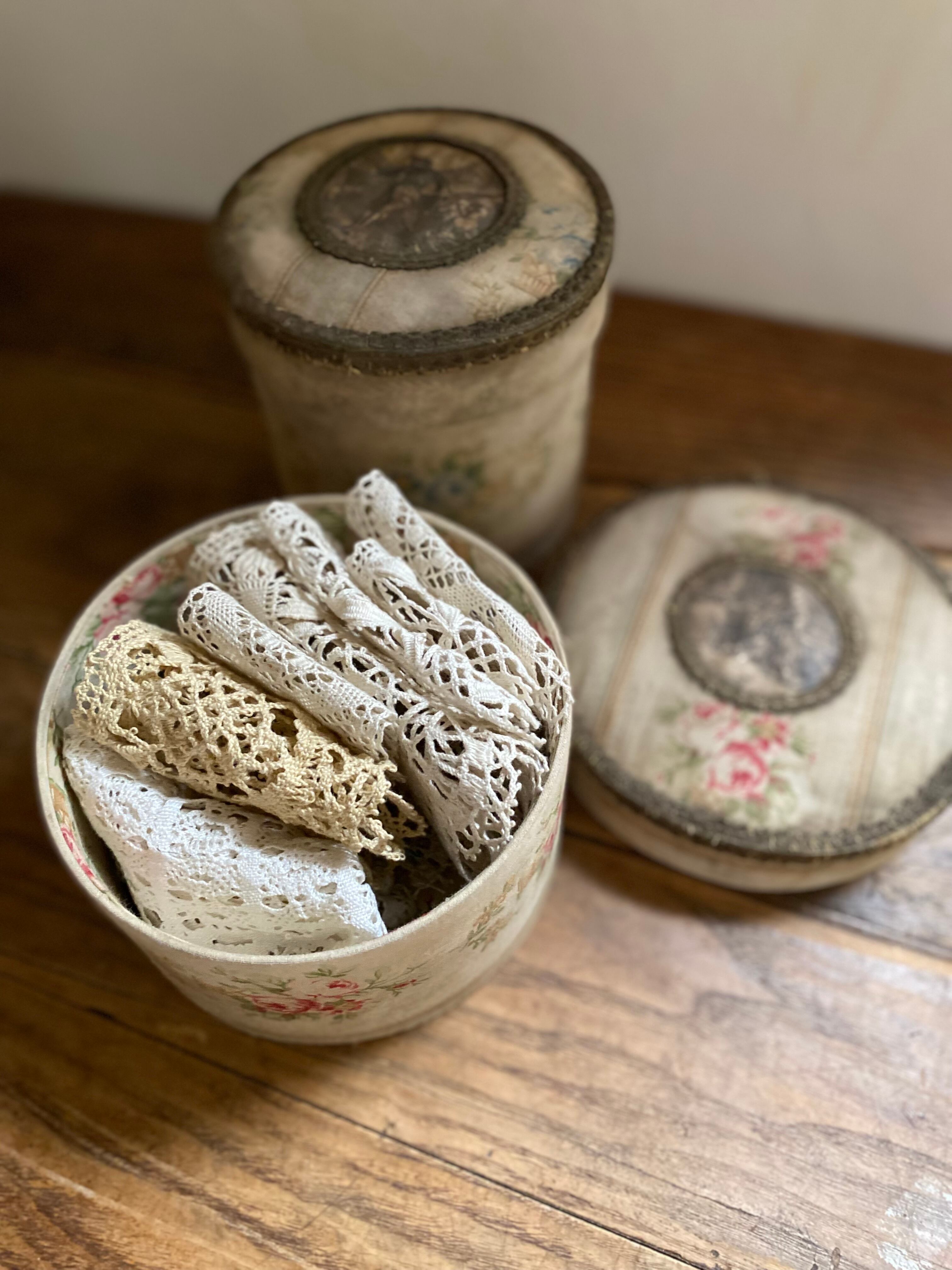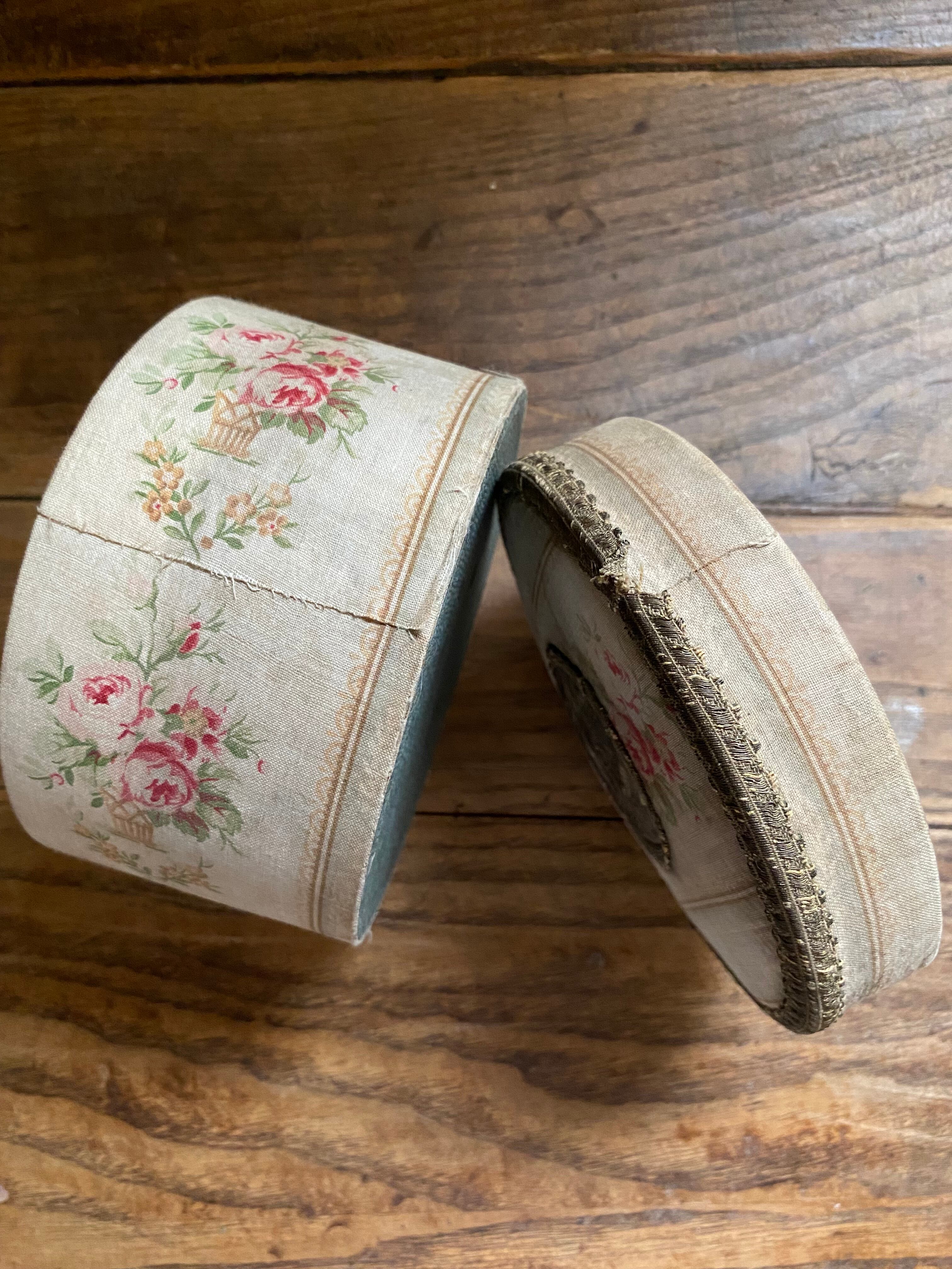 古く色褪せたカルトナージュ、ローズ柄の布が貼られ、内と外の色味の違いに時代の流れを感じます。蓋にはアクセントに金糸のレースが縁取られ、貴婦人のモチーフが丁寧にコラージュされております。