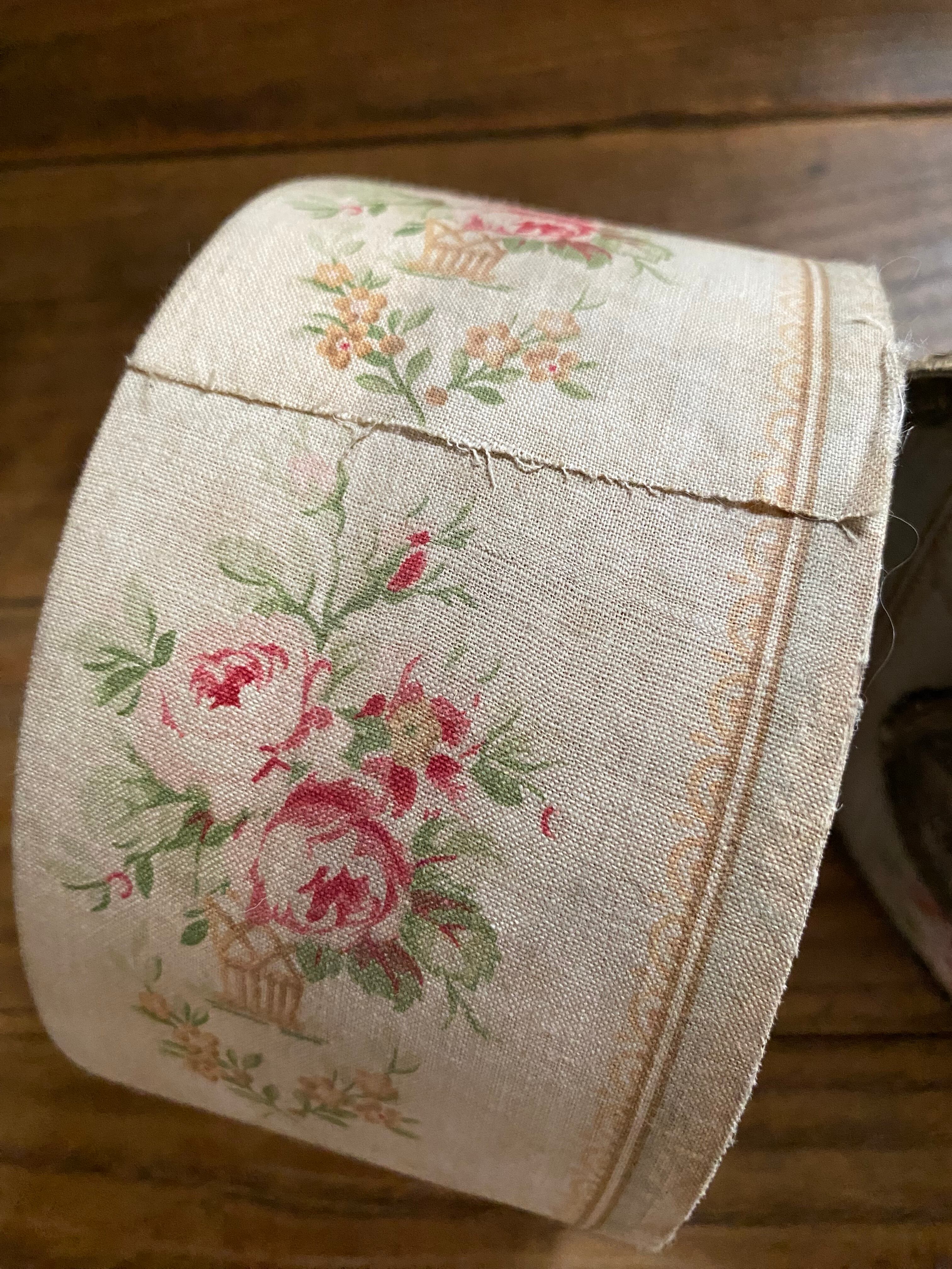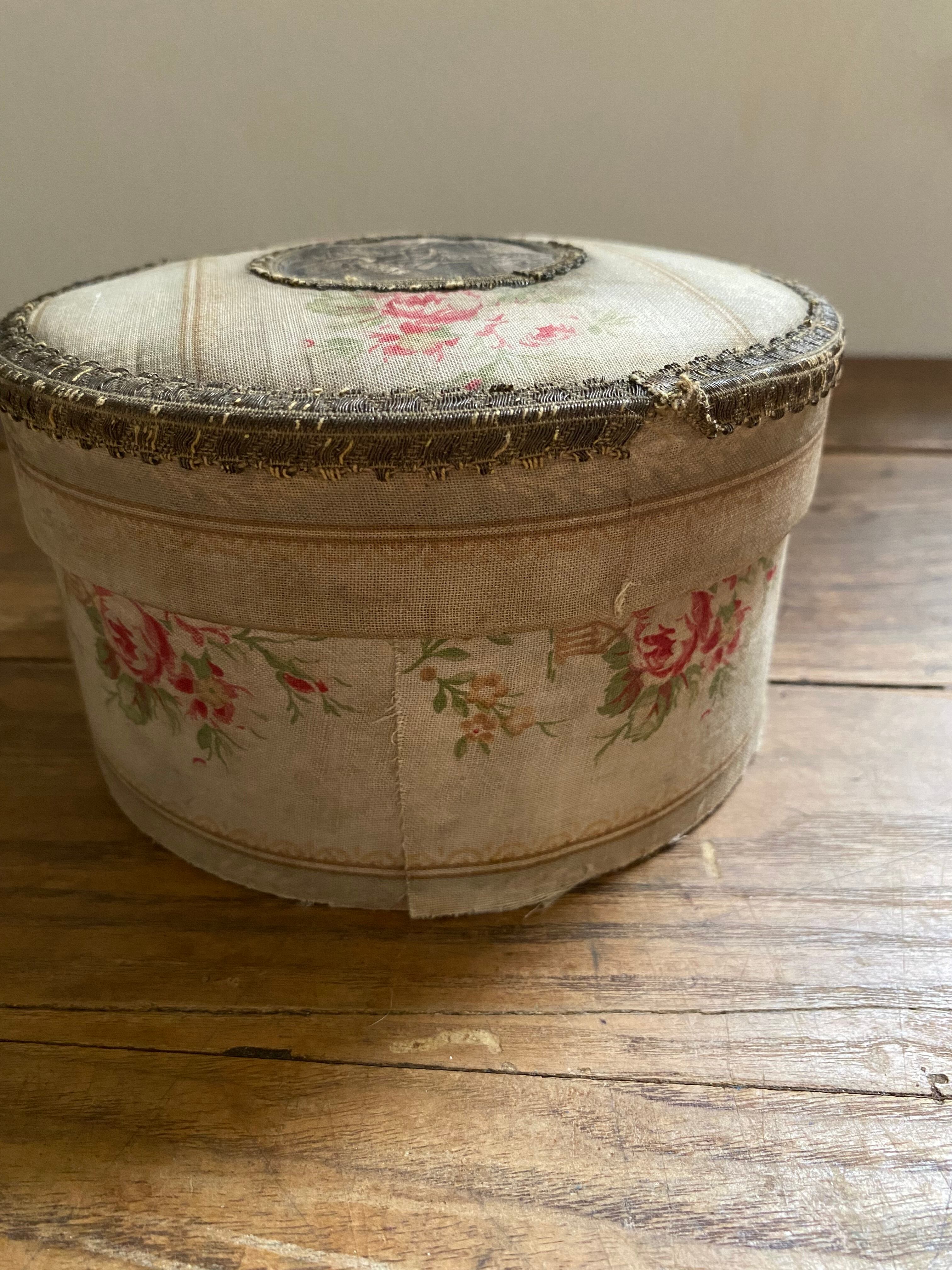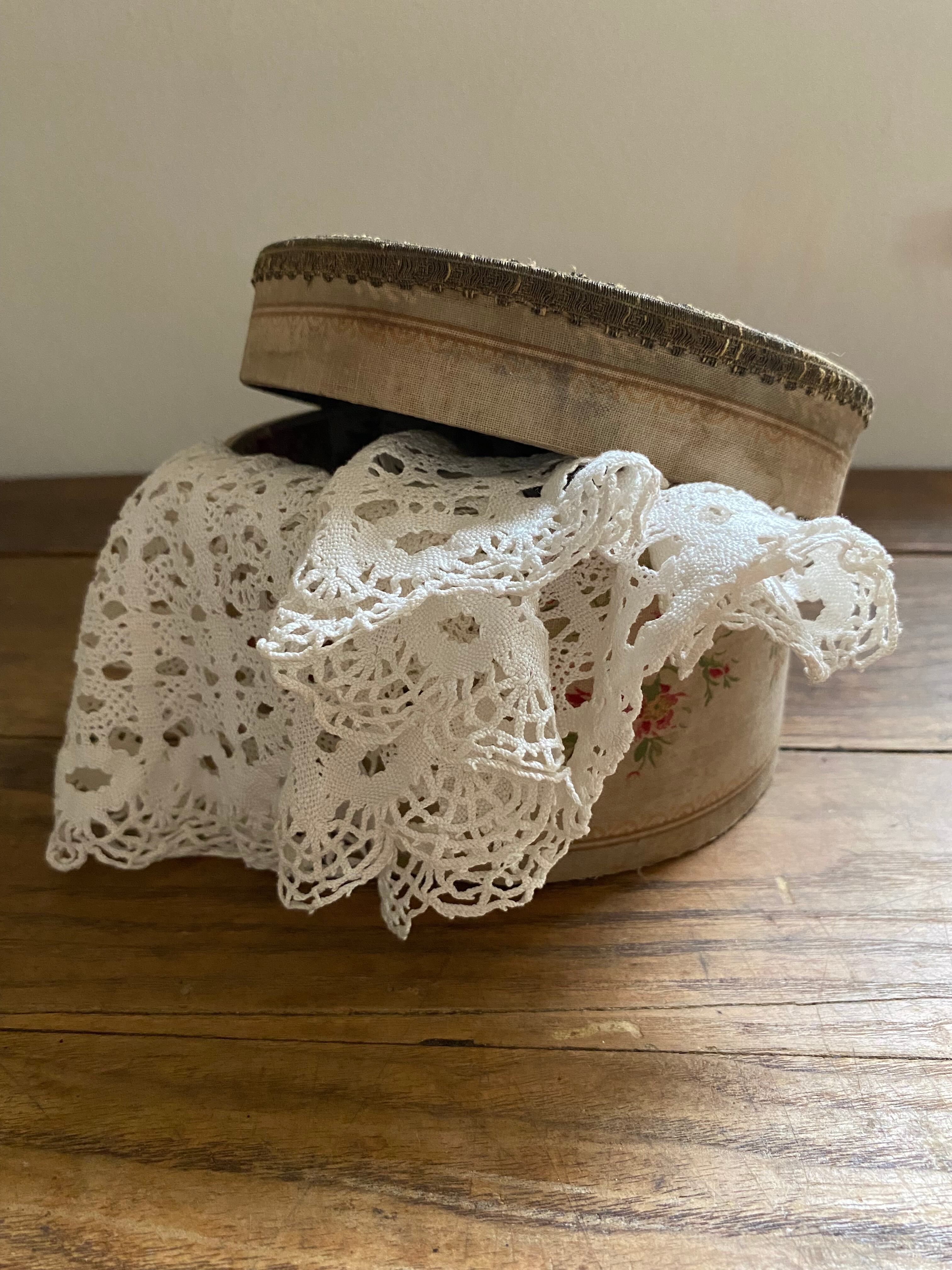 古く色褪せたカルトナージュ、ローズ柄の布が貼られ、内と外の色味の違いに時代の流れを感じます。蓋にはアクセントに金糸のレースが縁取られ、貴婦人のモチーフが丁寧にコラージュされております。