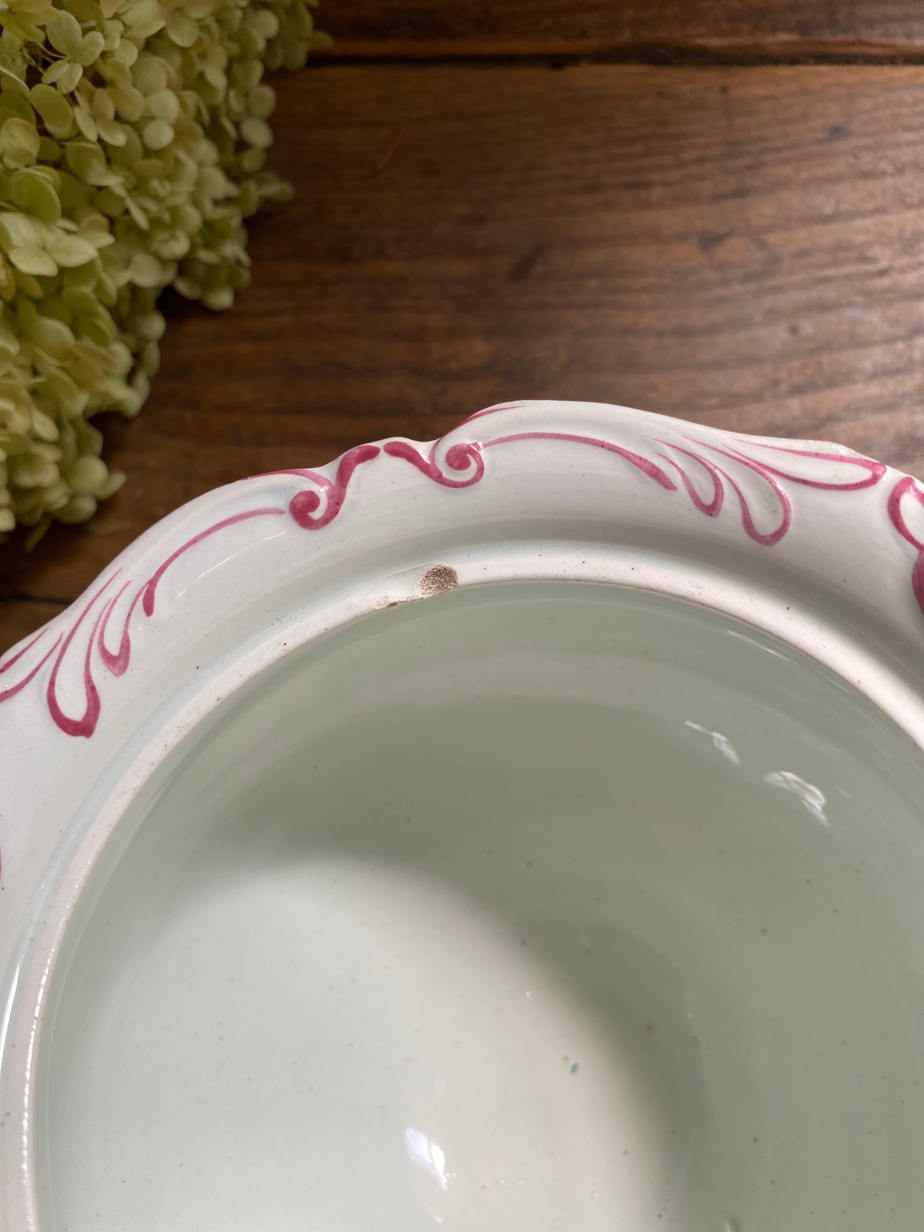 縁を彩るモーヴピンクの優しいラインが美しく、マリーアントワネットが愛したリュネヴィル窯の気品漂う器となっております。