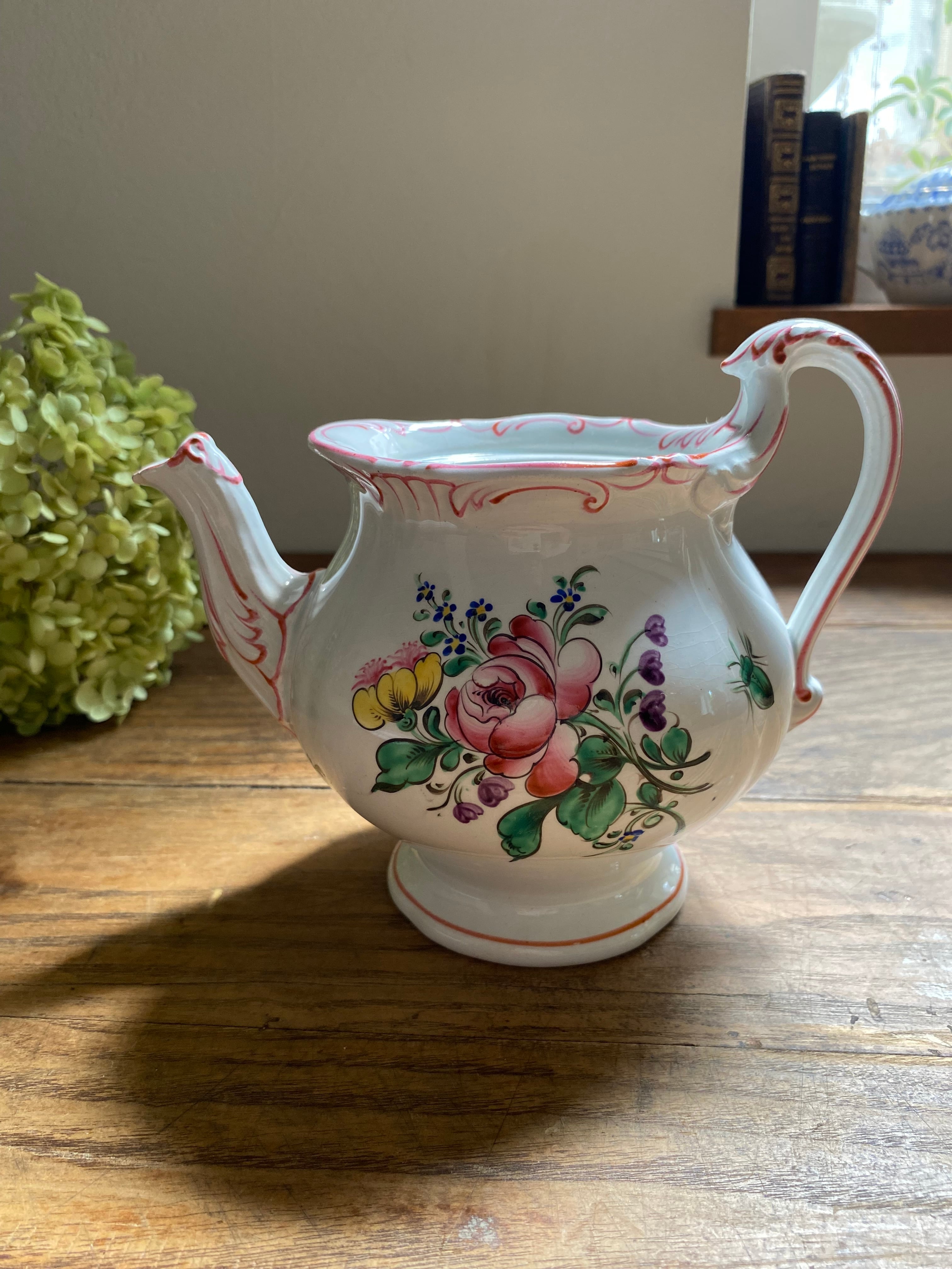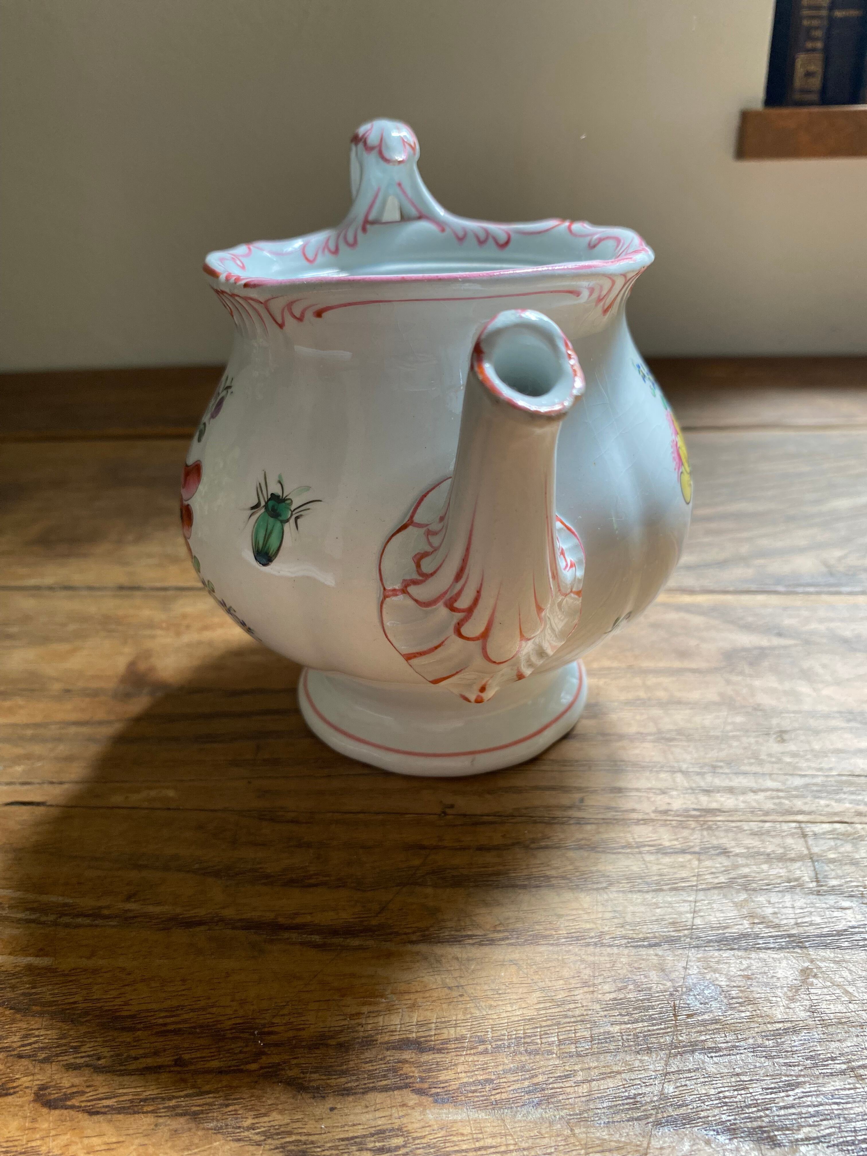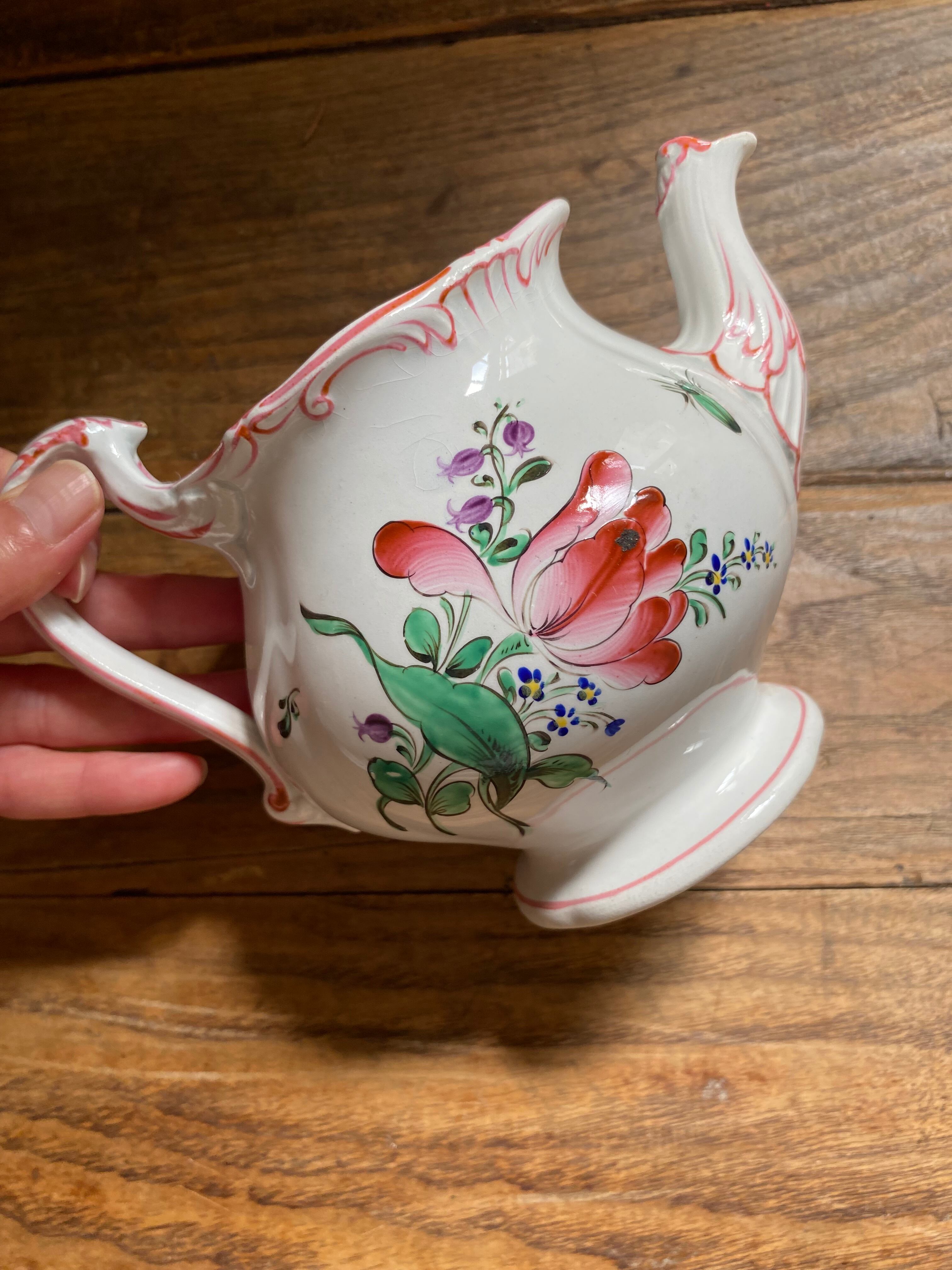 ハンドペイントでローズやチューリップのブーケが両サイドに描かれております。よく見ると玉虫色のような虫も両サイドに描かれていて、フランスの物らしい遊び心を感じます。