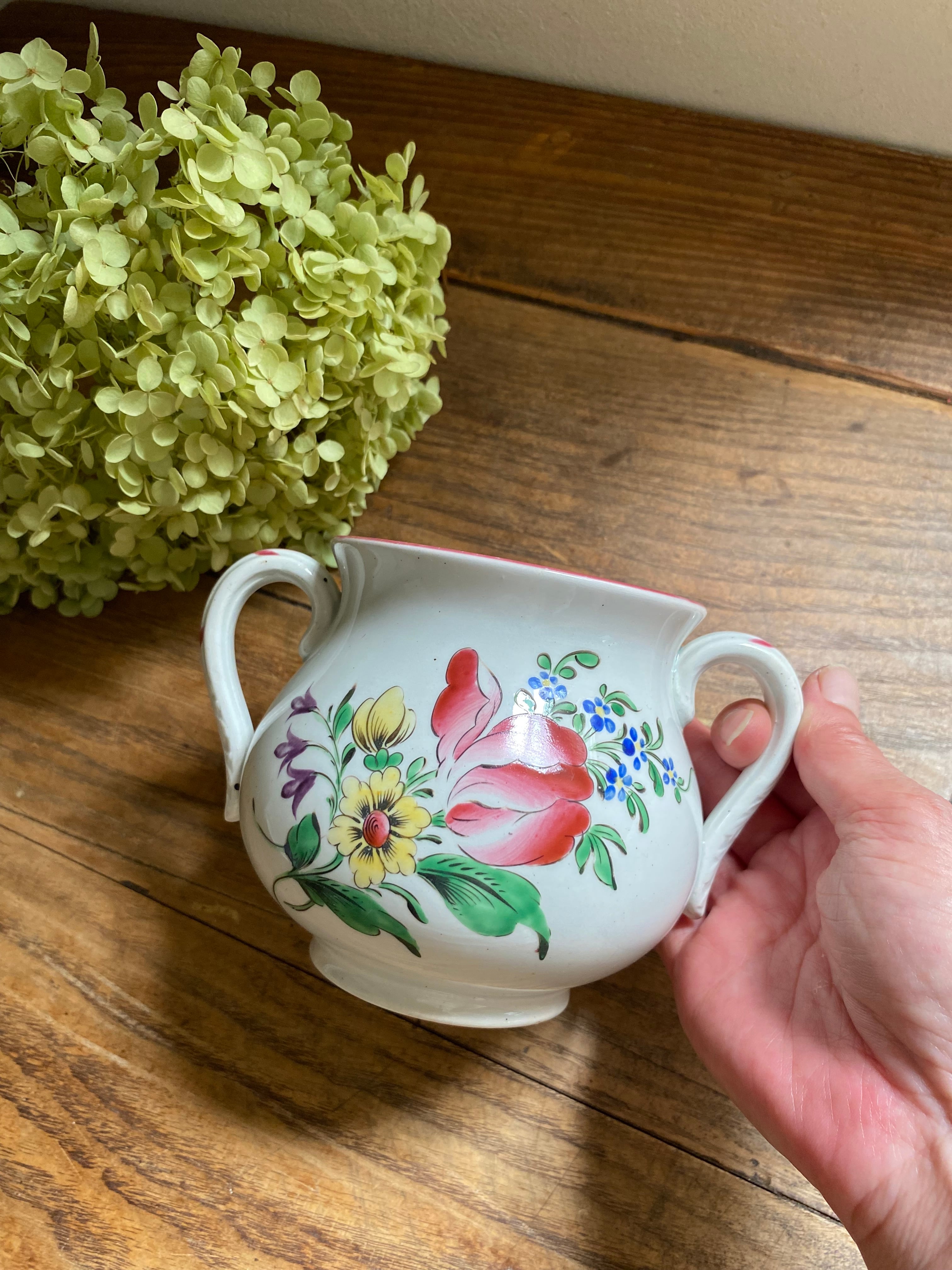 ハンドペイントで描かれた花々のブーケが両サイドでお楽しみ頂けるシュクリエポット。