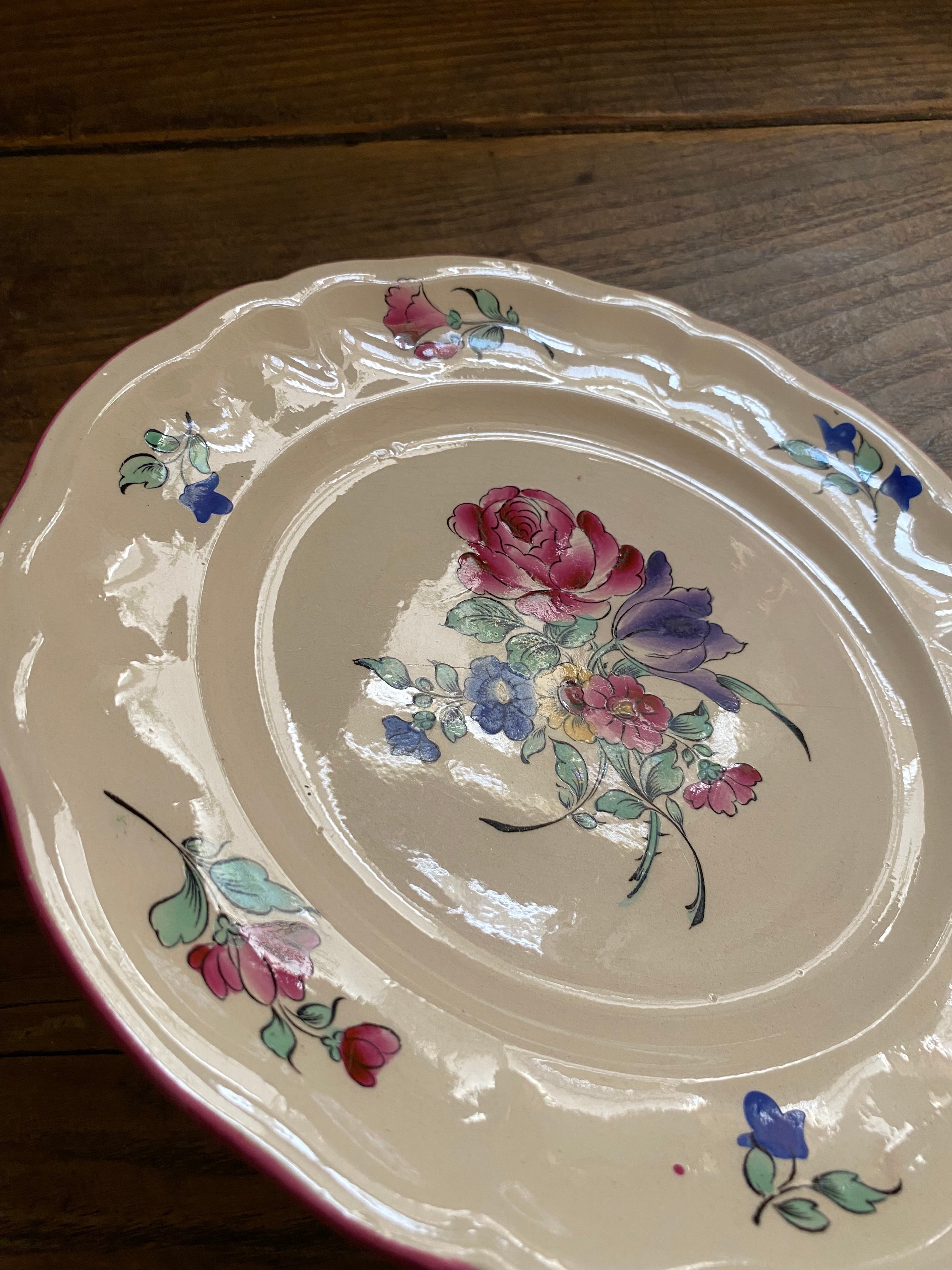 ハンドペイントで描かれた薔薇のブーケが中央に、リムにもバランスよく小さなお花が添えられております。