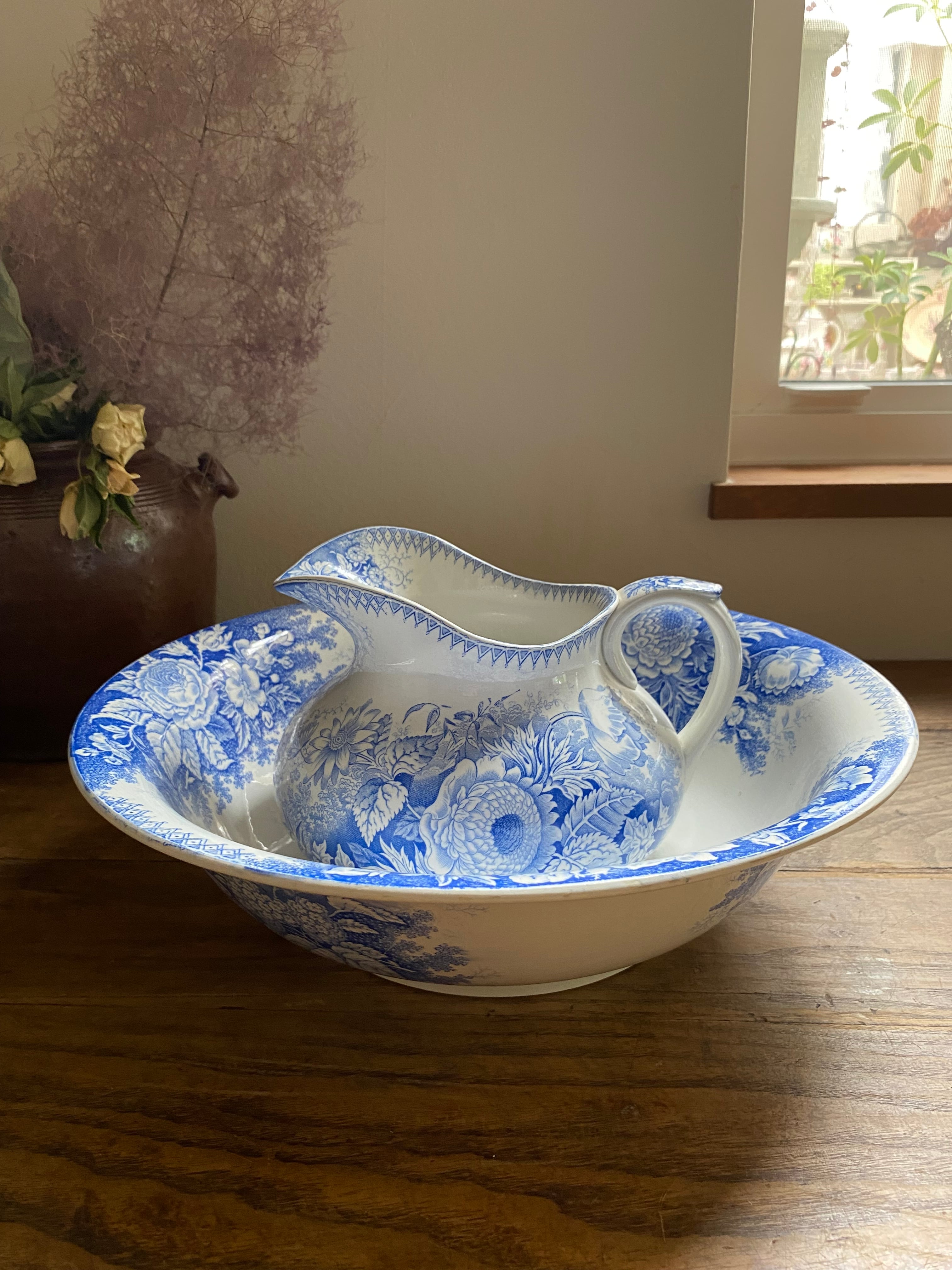 洗面用具として使われてるいたピシェとベイスン、目が覚めるような色鮮やかな花模様の描きが美しいです。