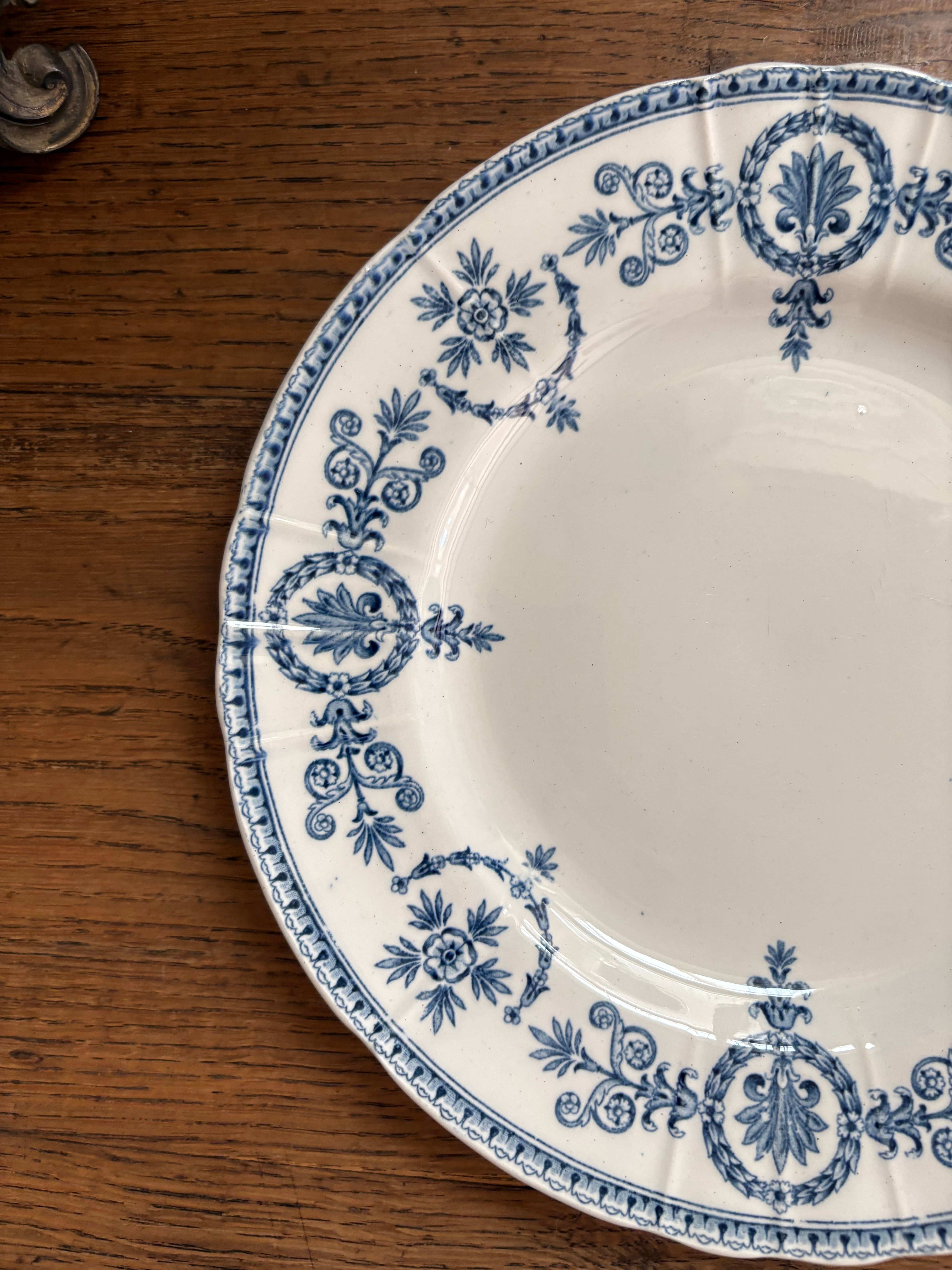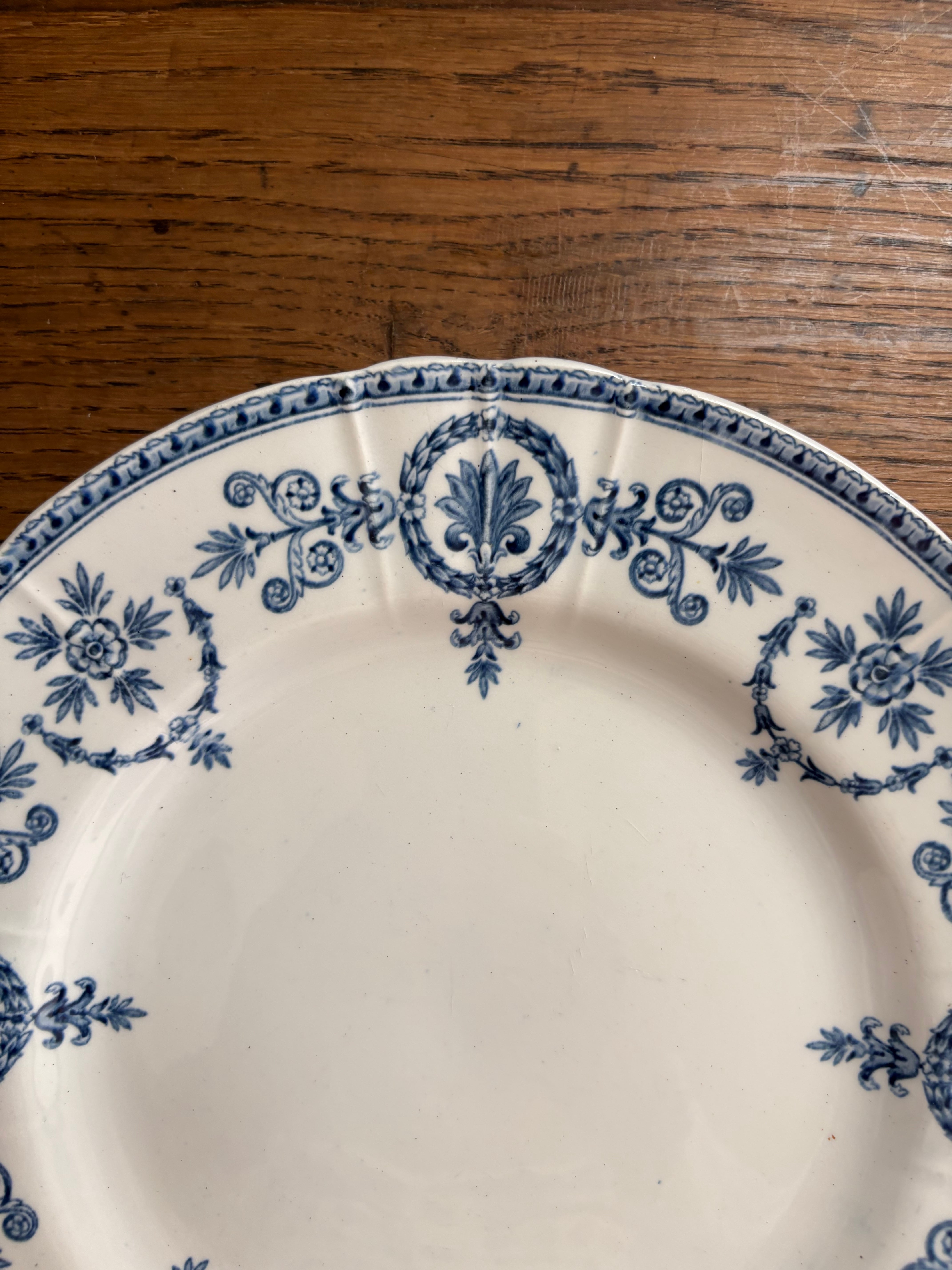 白地にブルーの装飾模様はアールヌーボーを感じる美しさ、リムは緩やかな花リムにレリーフも施されております。