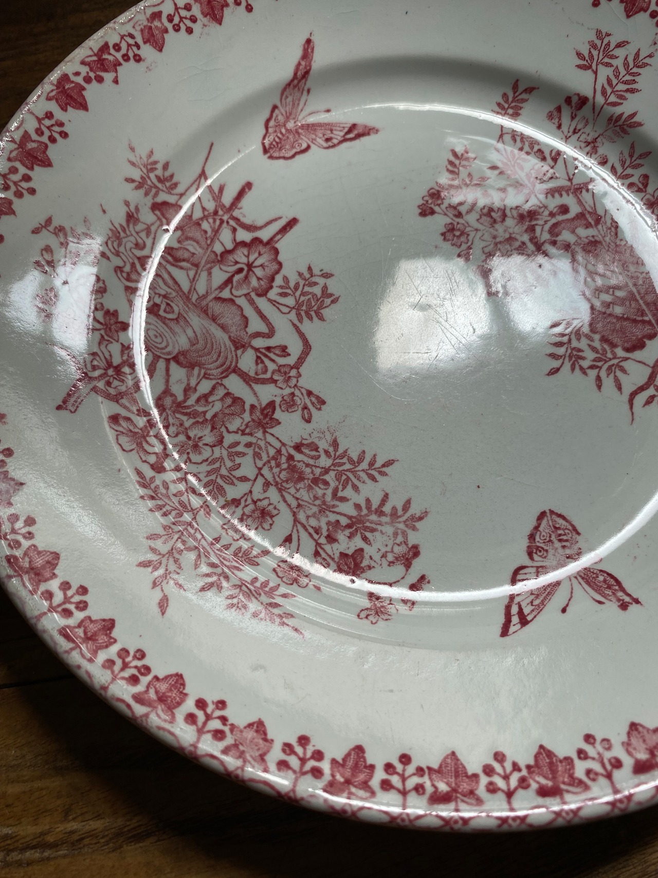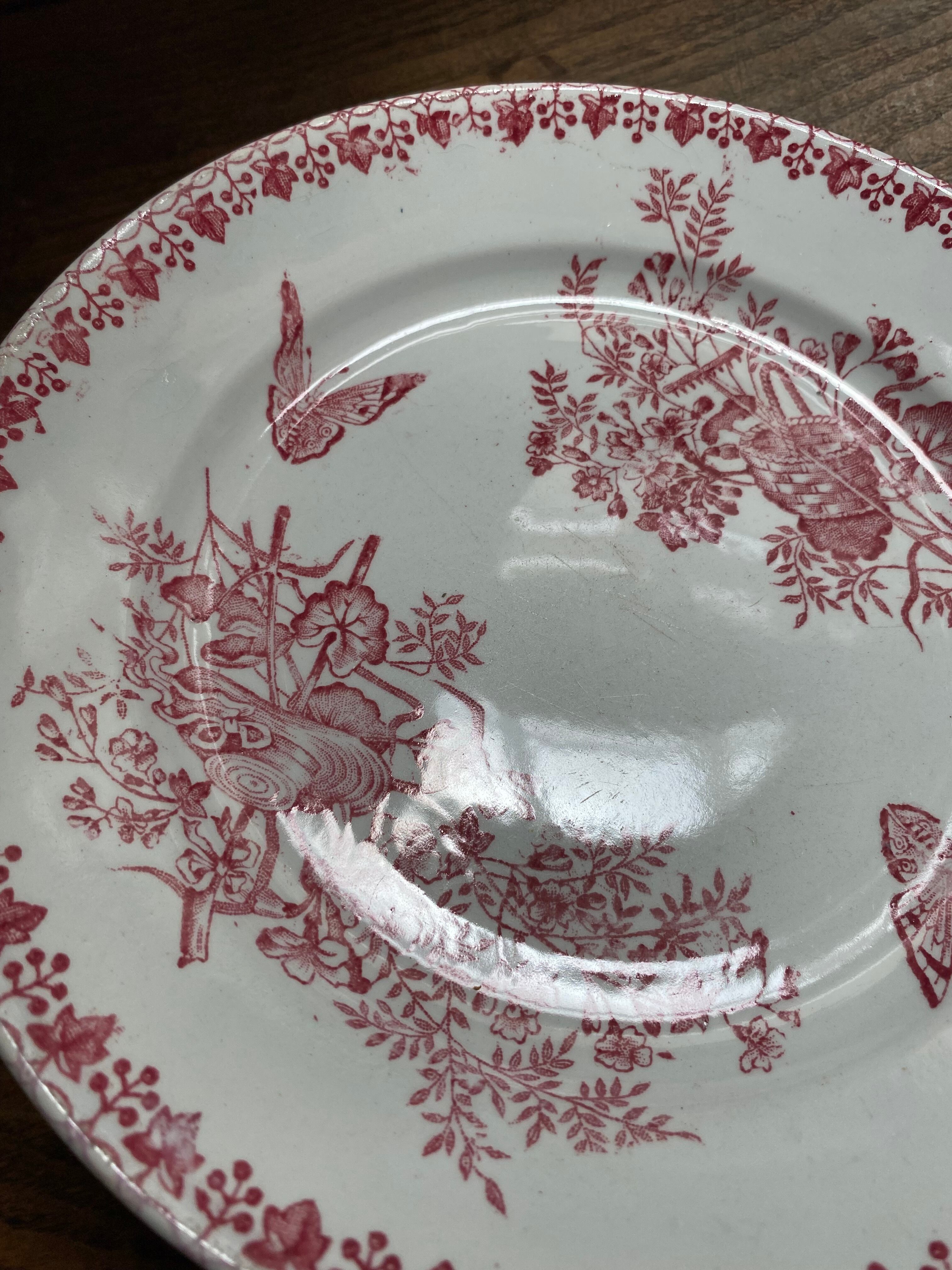 こちらのプレート、リムにはフランボワーズの葉が規則正しく並んでる可愛さと、2匹の愉しく飛び回る蝶、農具や帽子、パニエなど、花々と一緒に描かれております。