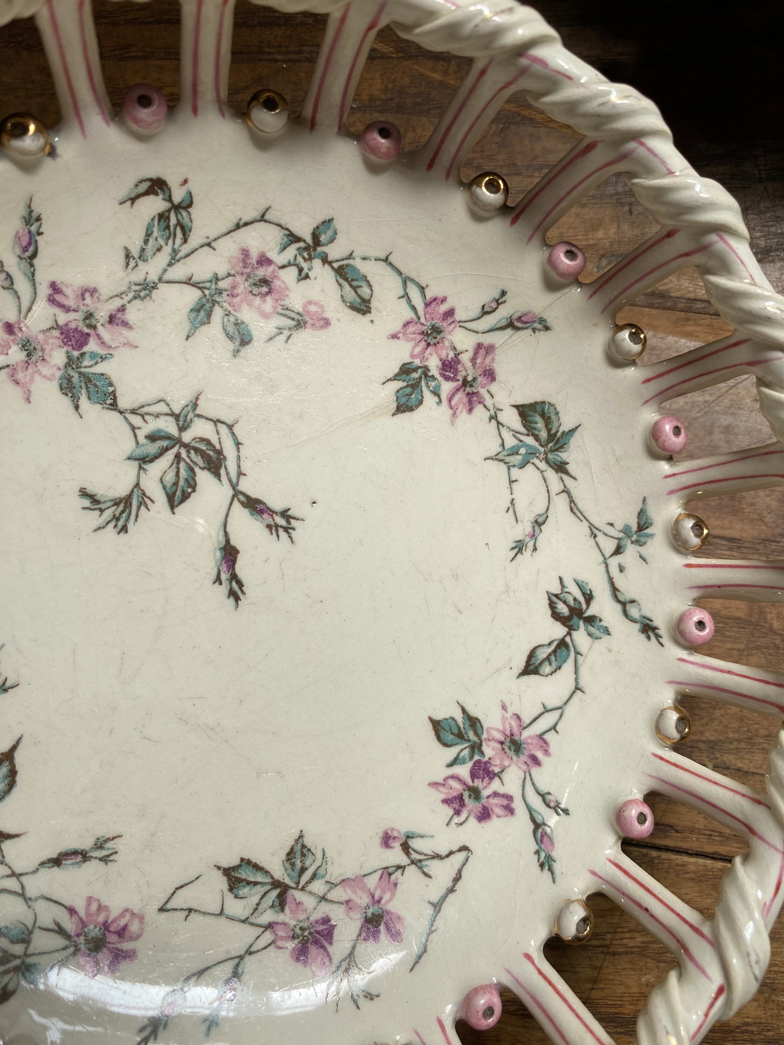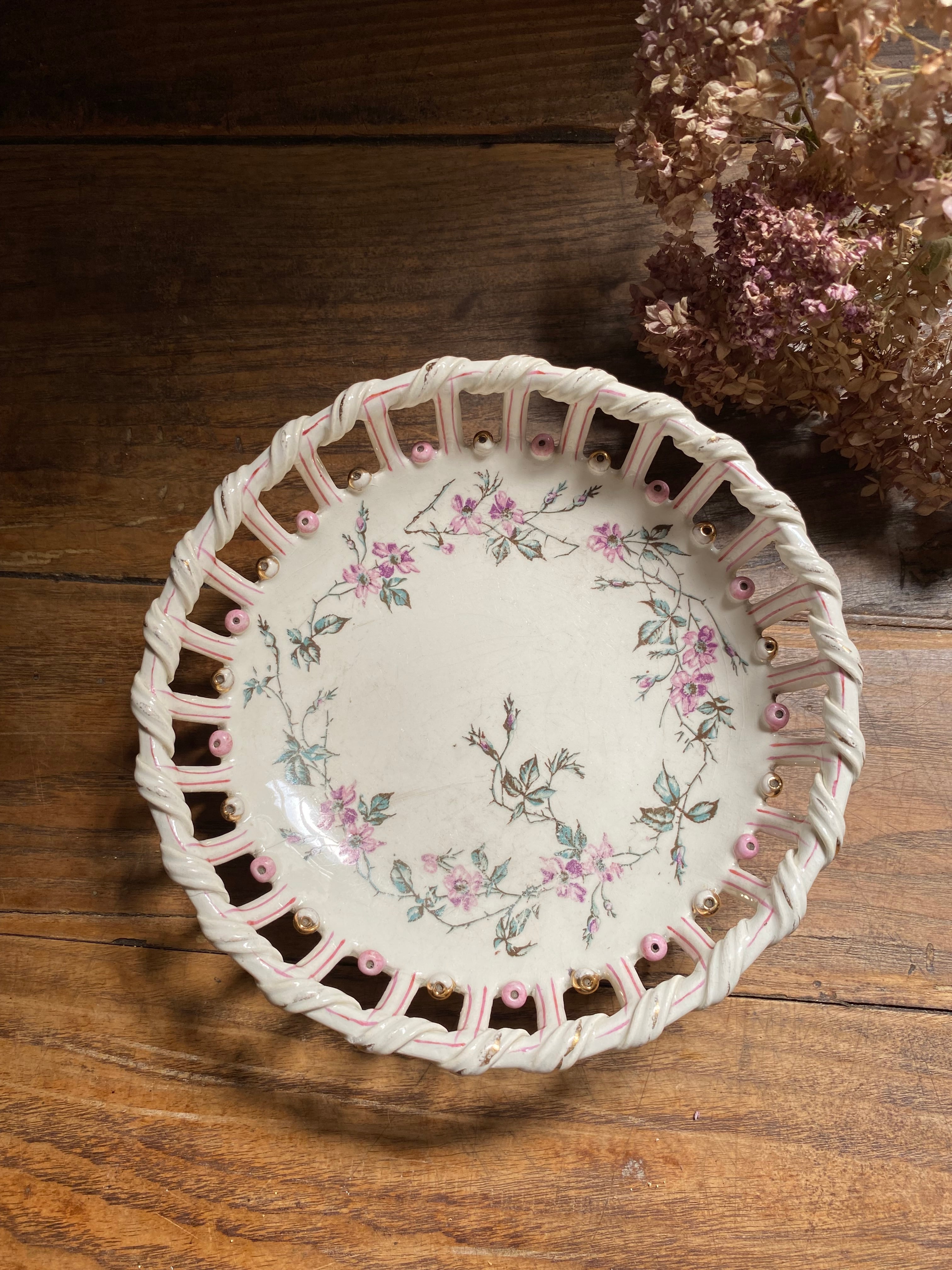 リムの透かしのデザインはパニエのように編まれ、金彩部分は所々擦れてなくなっている箇所も見られます