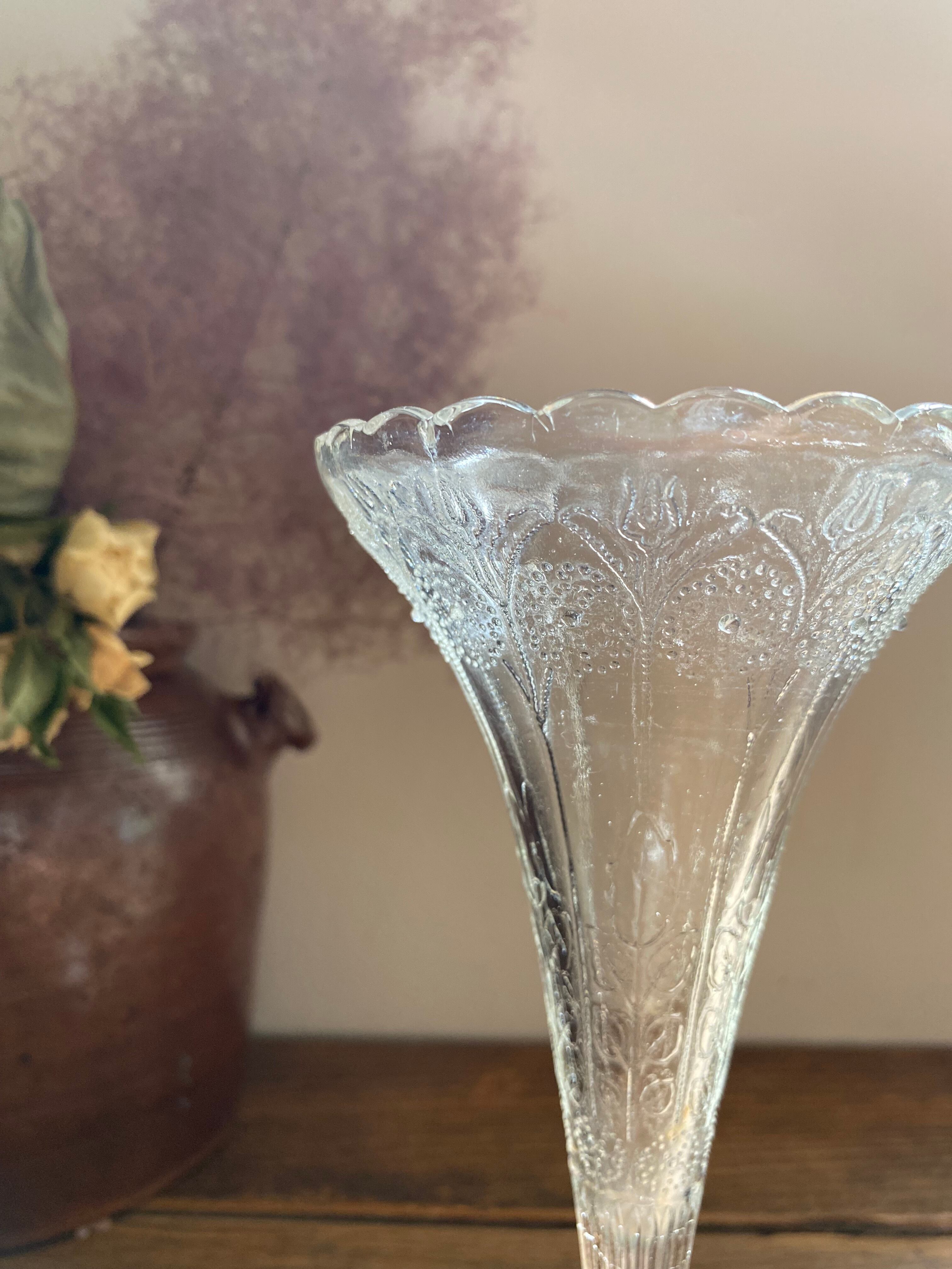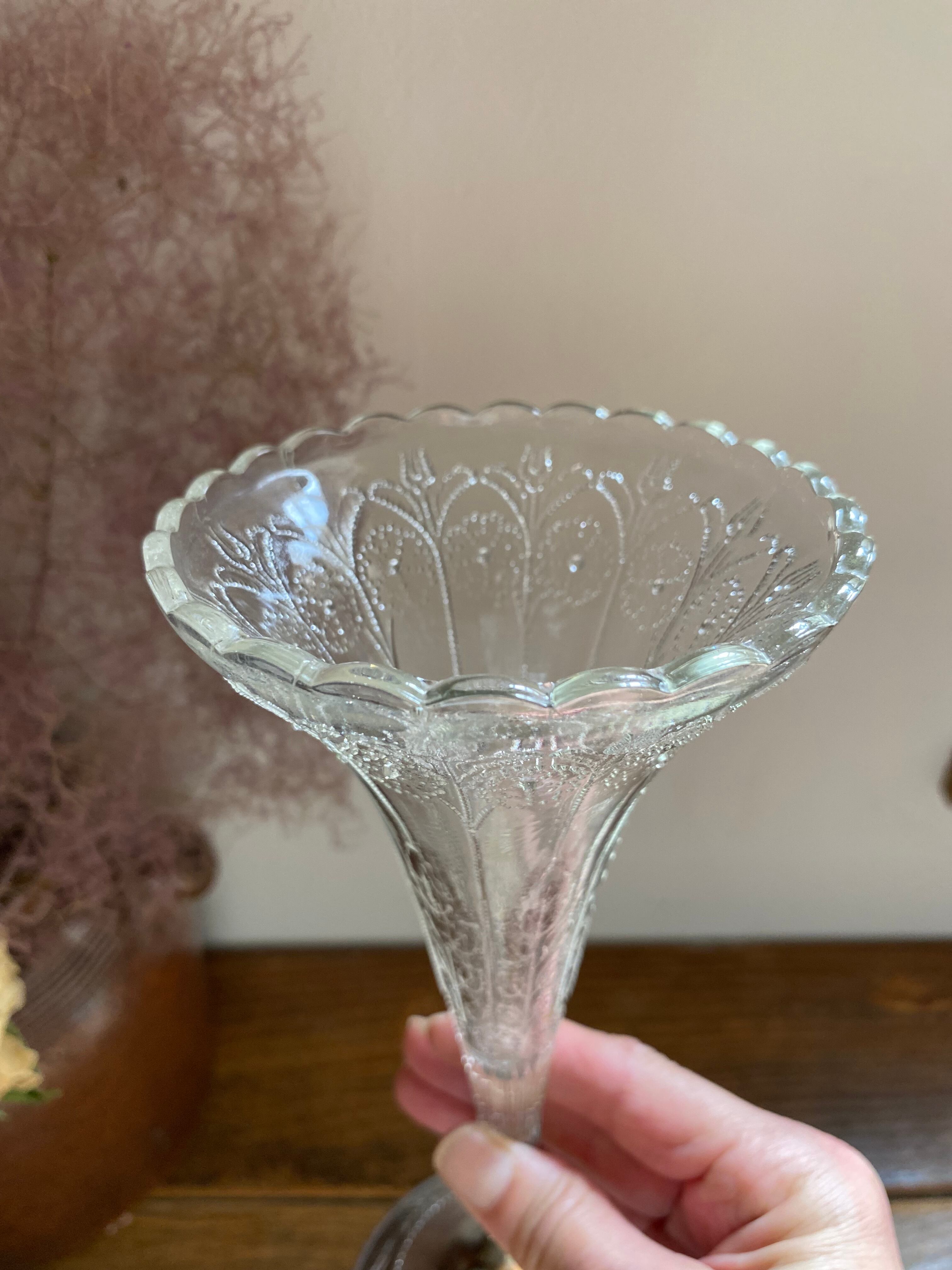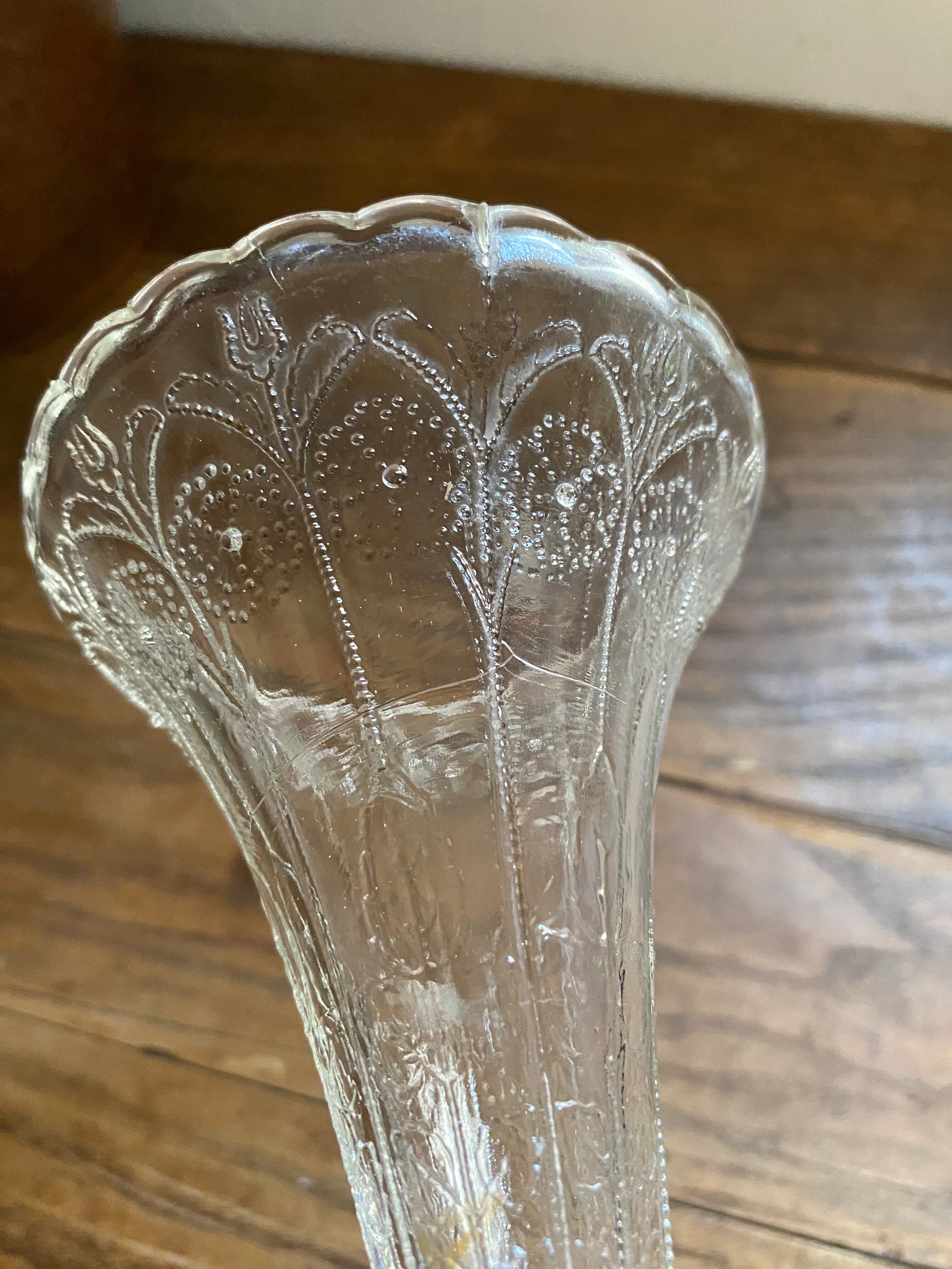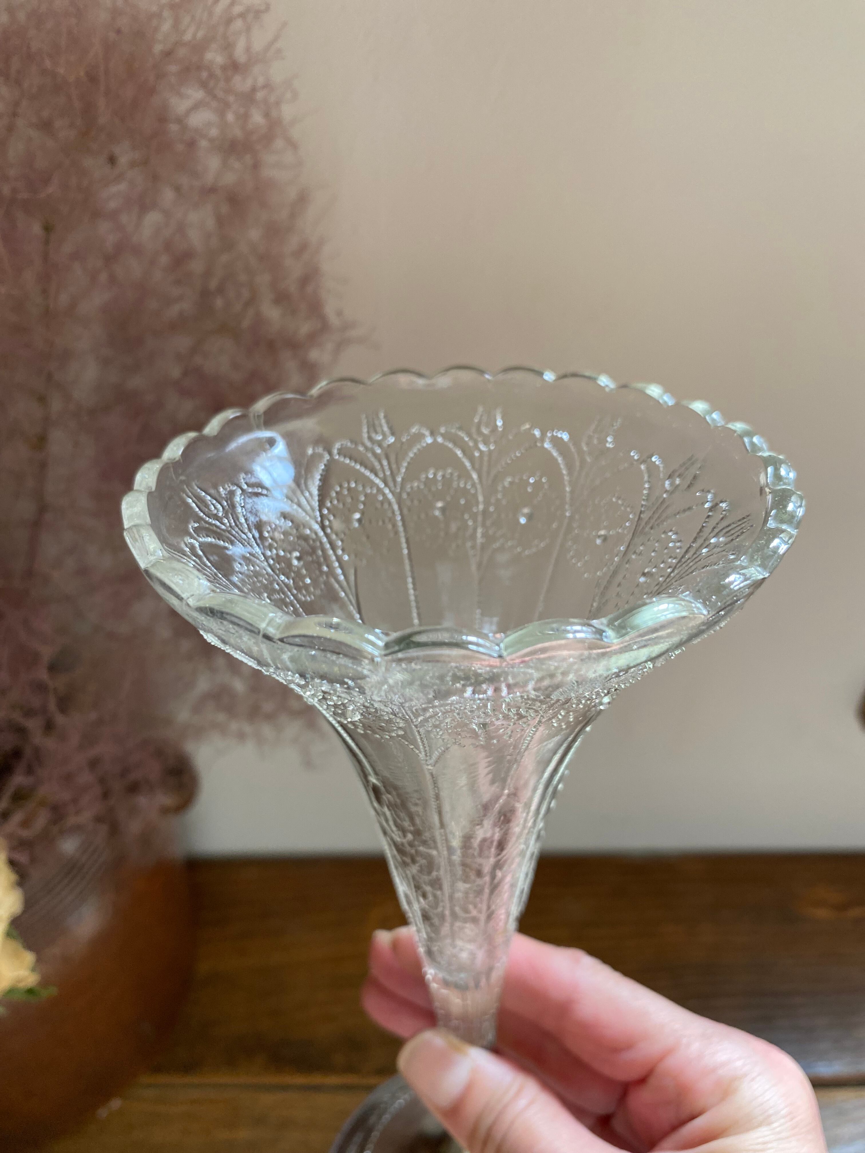 ガラス製のフラワーベース、花模様の装飾が可愛く施されております。外側に凹凸を感じる装飾となってます。足下はシルバーカラーで引き締まった作りになっていて、立ち姿がなんとも美しいフラワーベースとなっております。