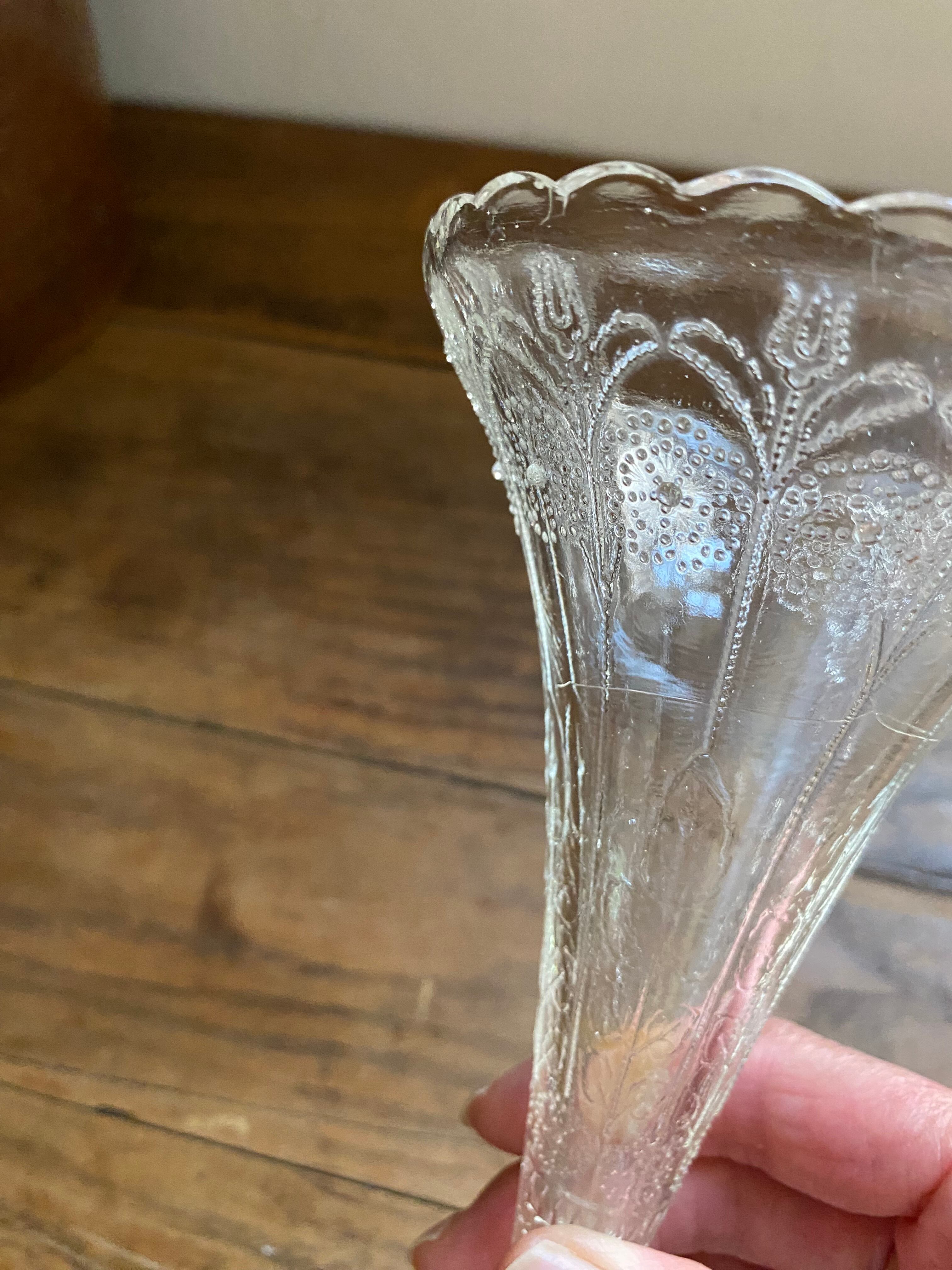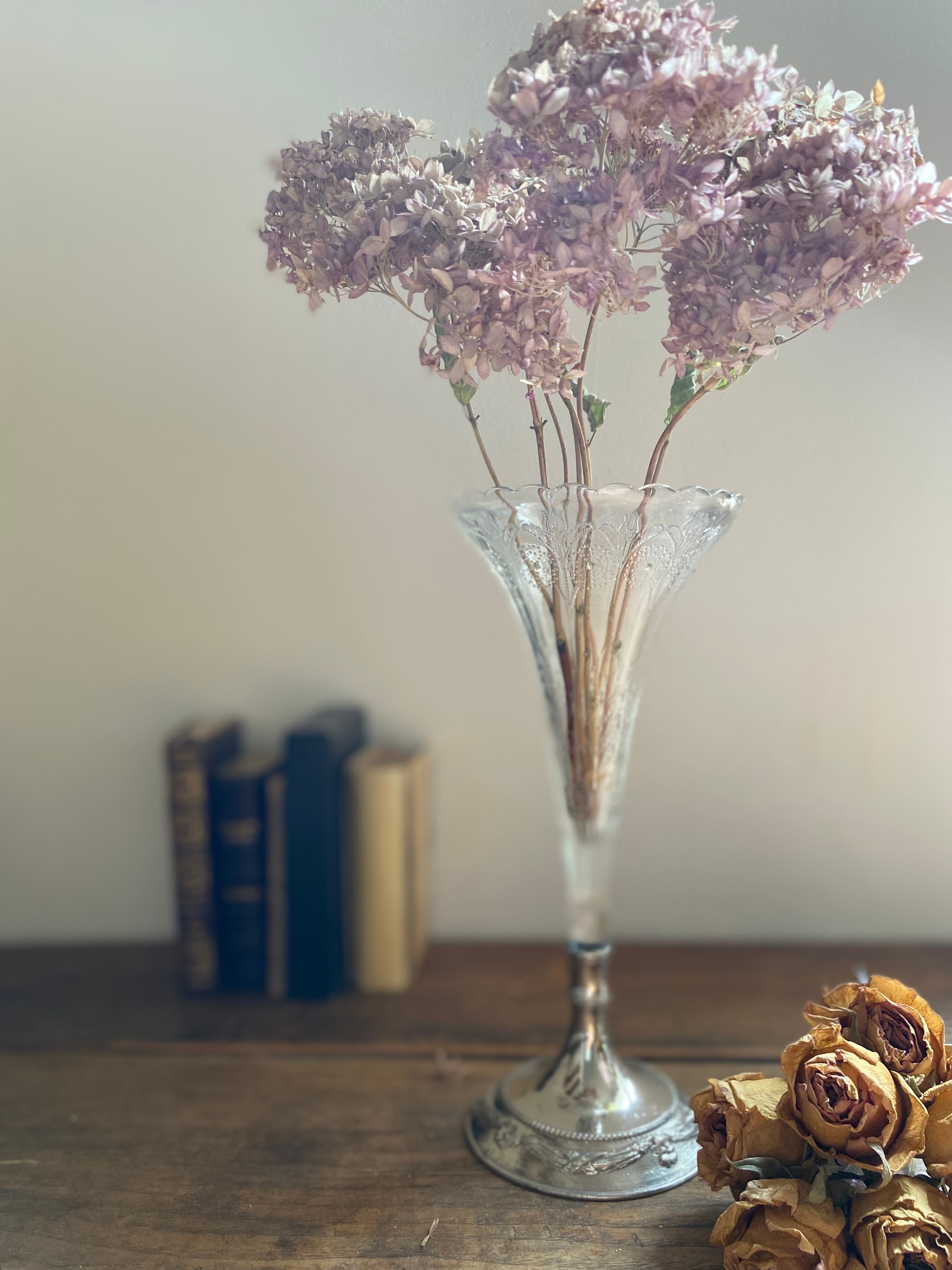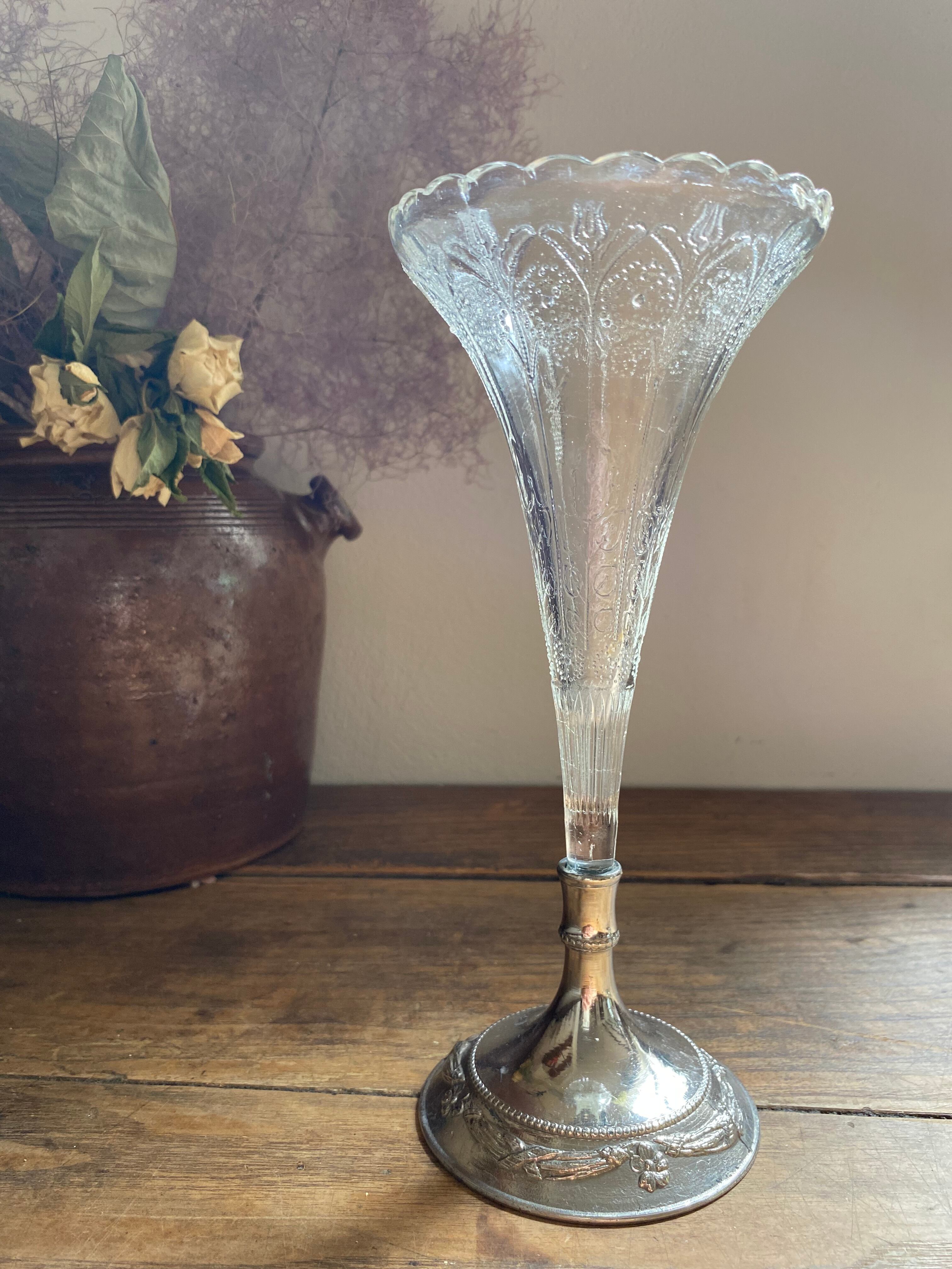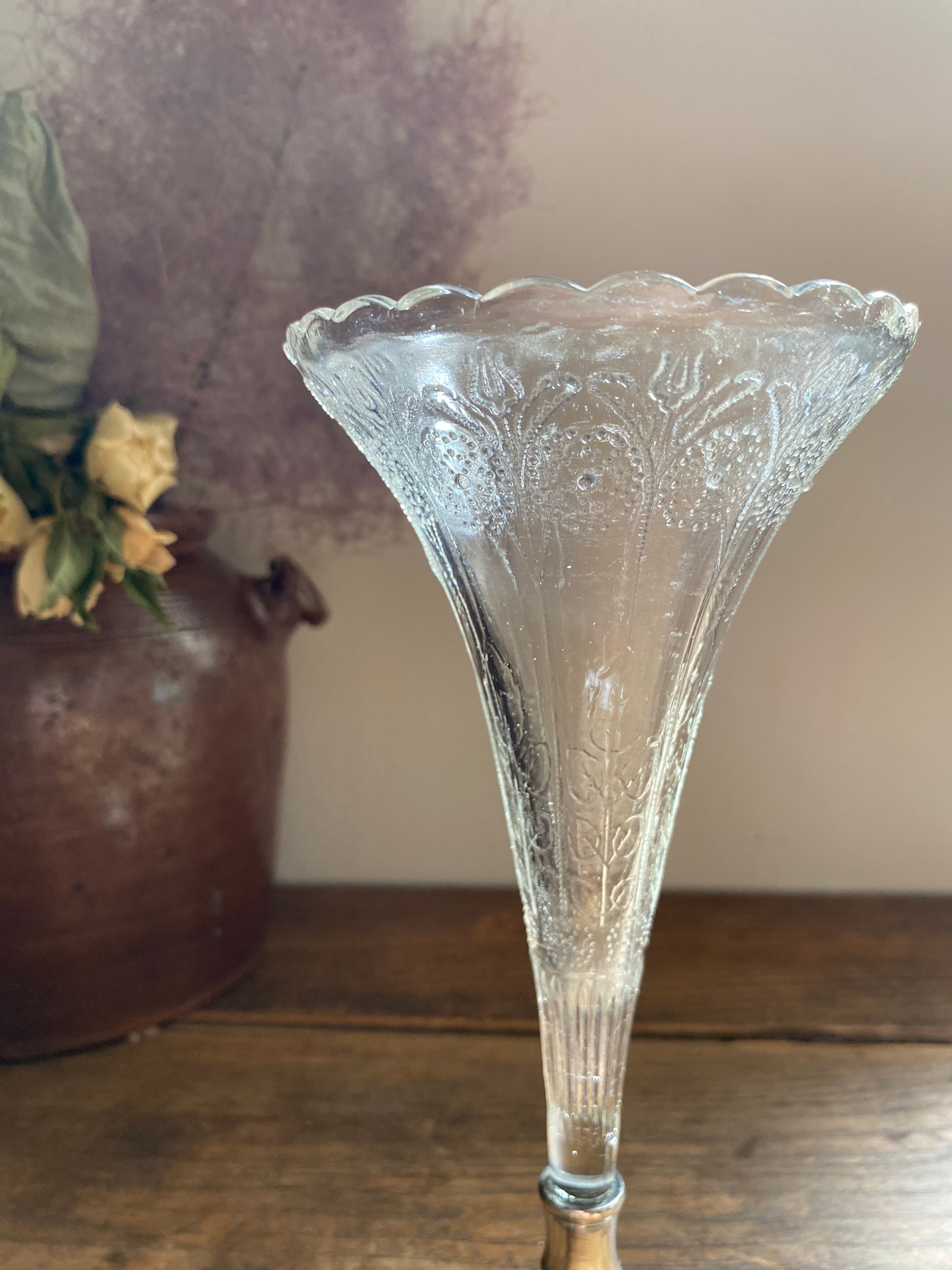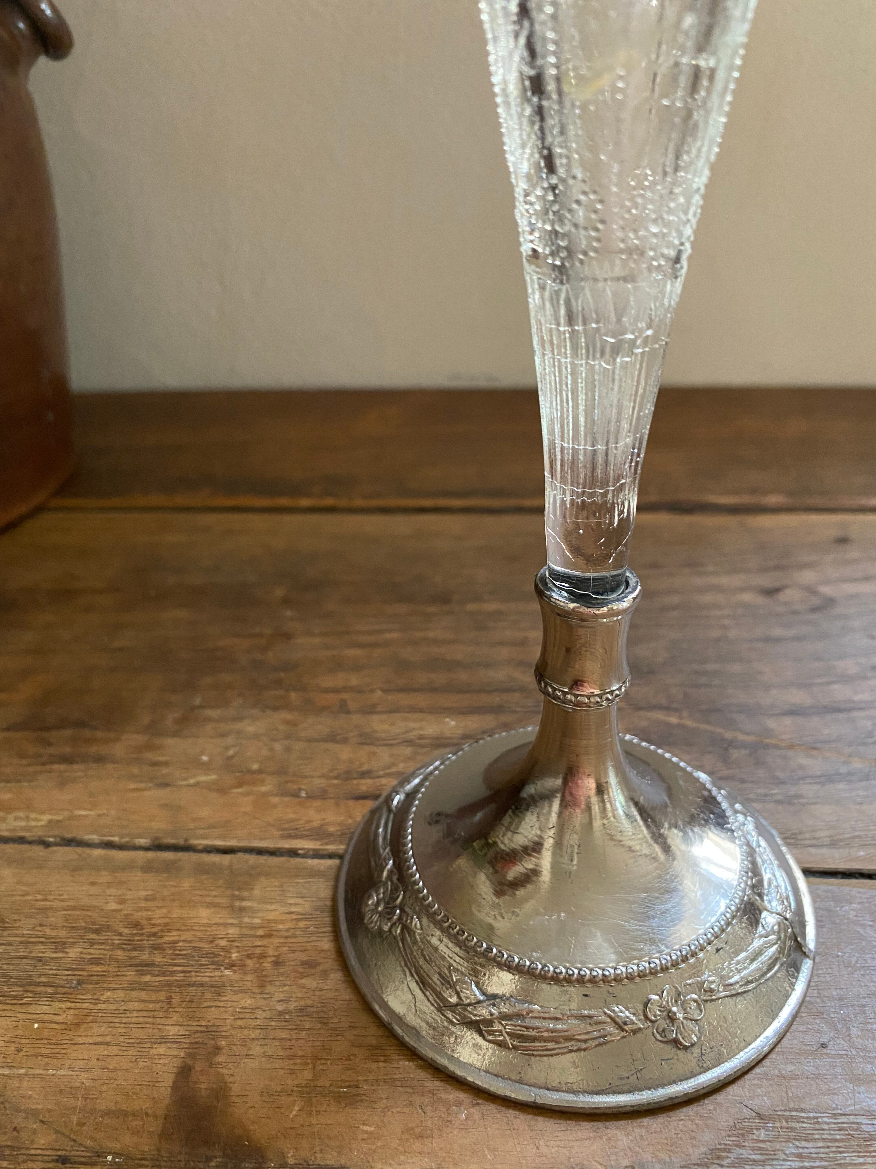 ガラス製のフラワーベース、花模様の装飾が可愛く施されております。外側に凹凸を感じる装飾となってます。足下はシルバーカラーで引き締まった作りになっていて、立ち姿がなんとも美しいフラワーベースとなっております。