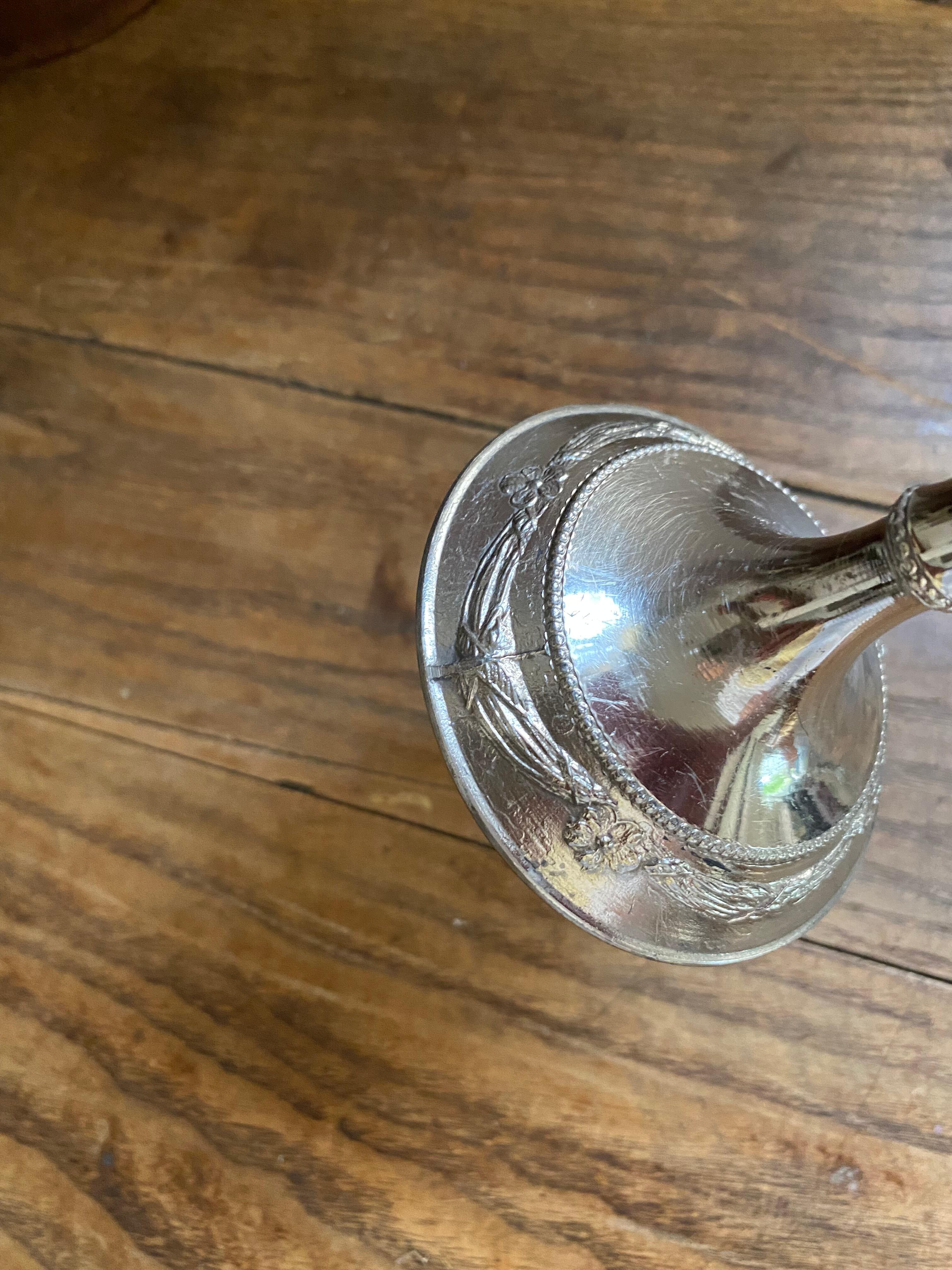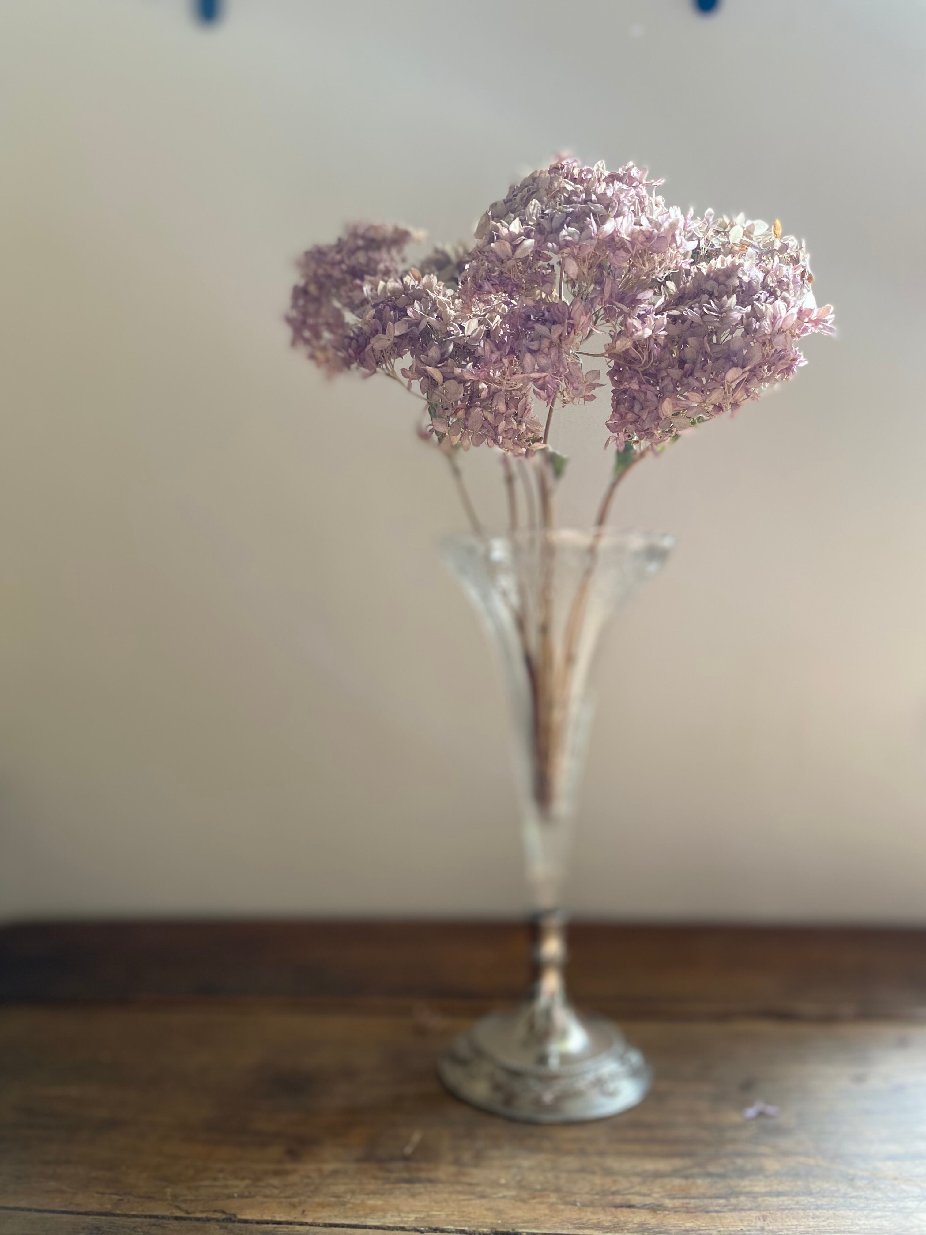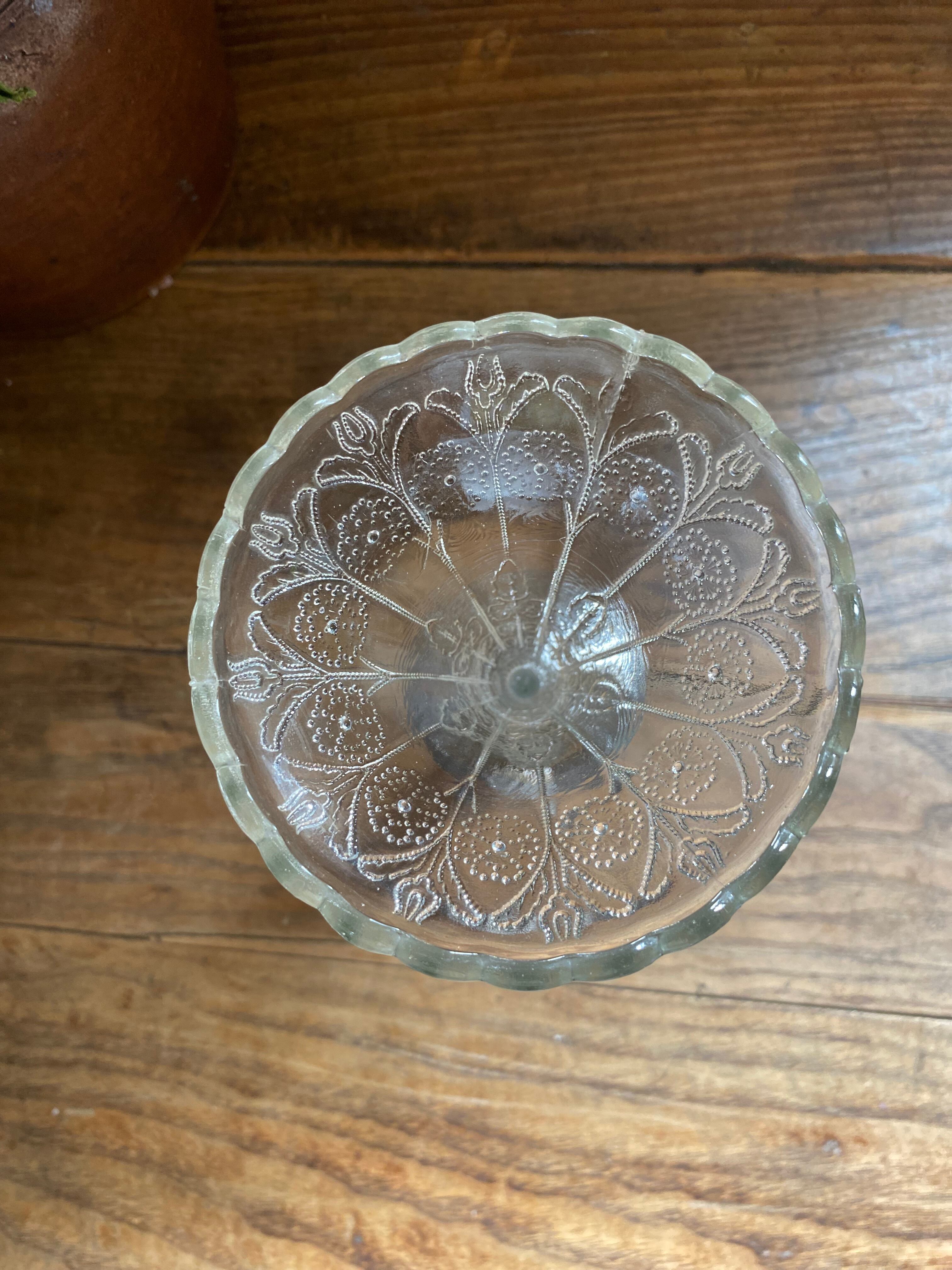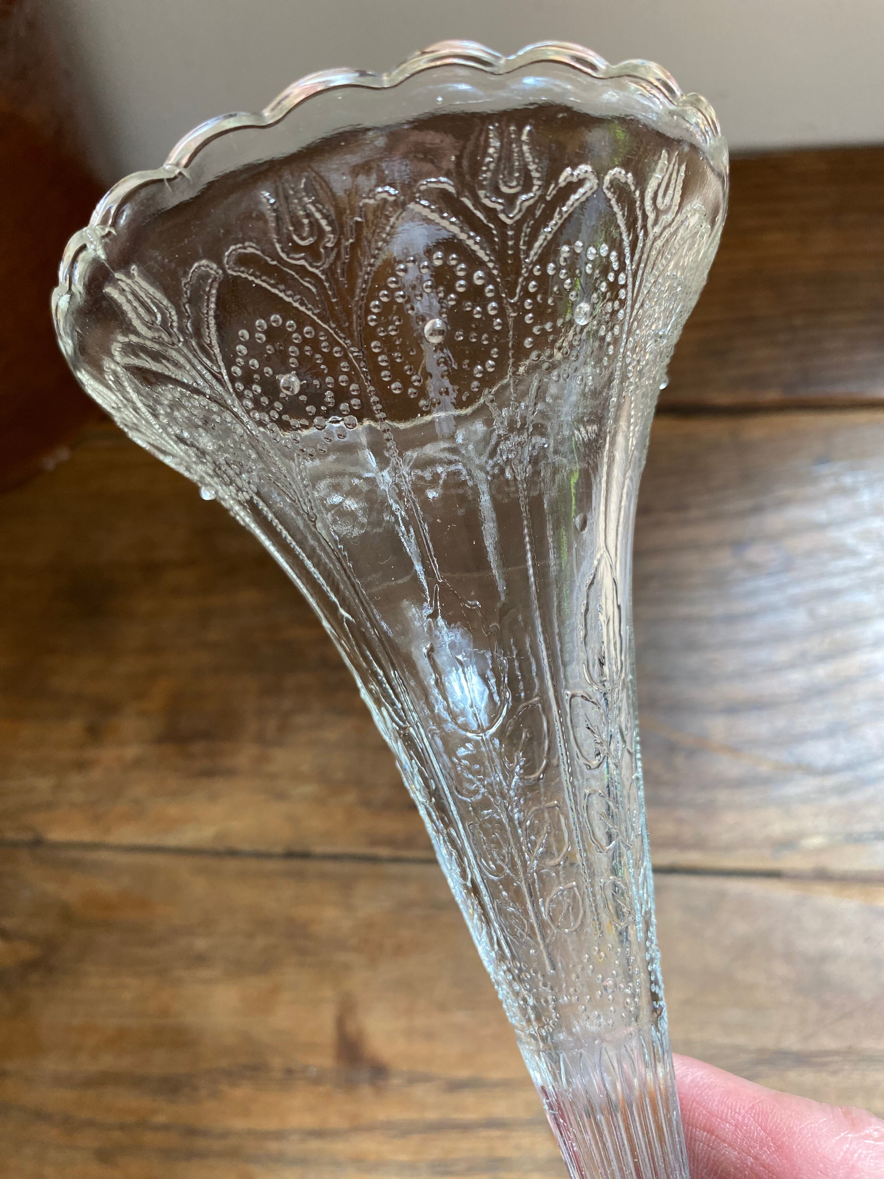 ガラス製のフラワーベース、花模様の装飾が可愛く施されております。外側に凹凸を感じる装飾となってます。足下はシルバーカラーで引き締まった作りになっていて、立ち姿がなんとも美しいフラワーベースとなっております。