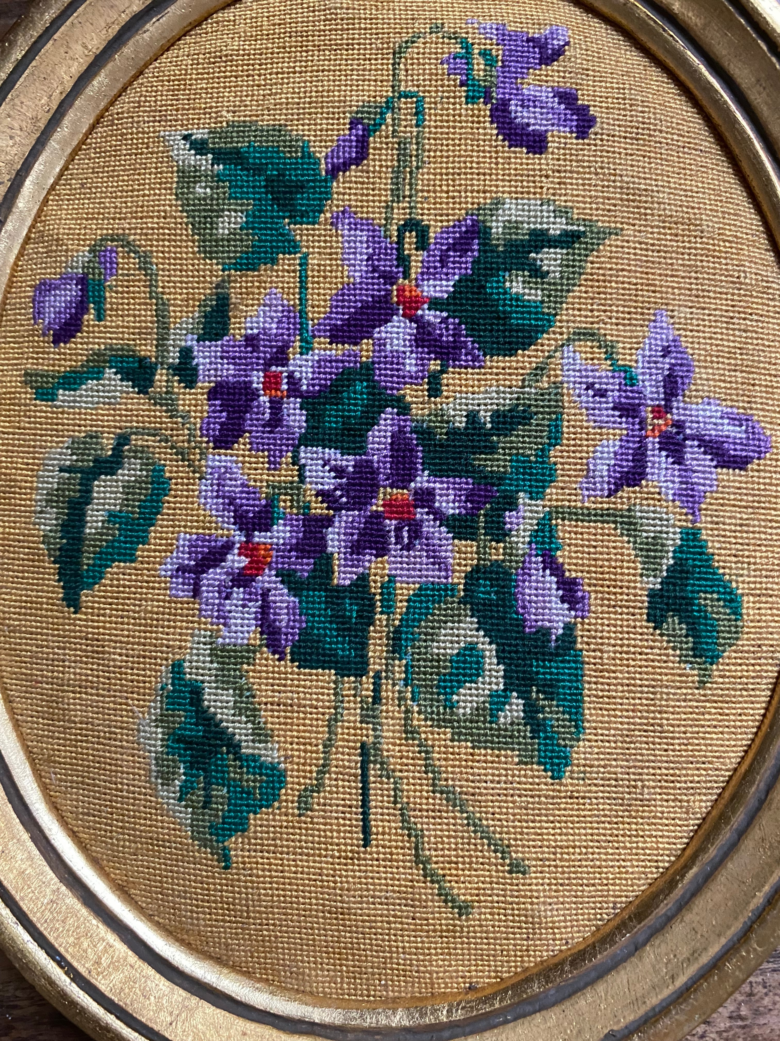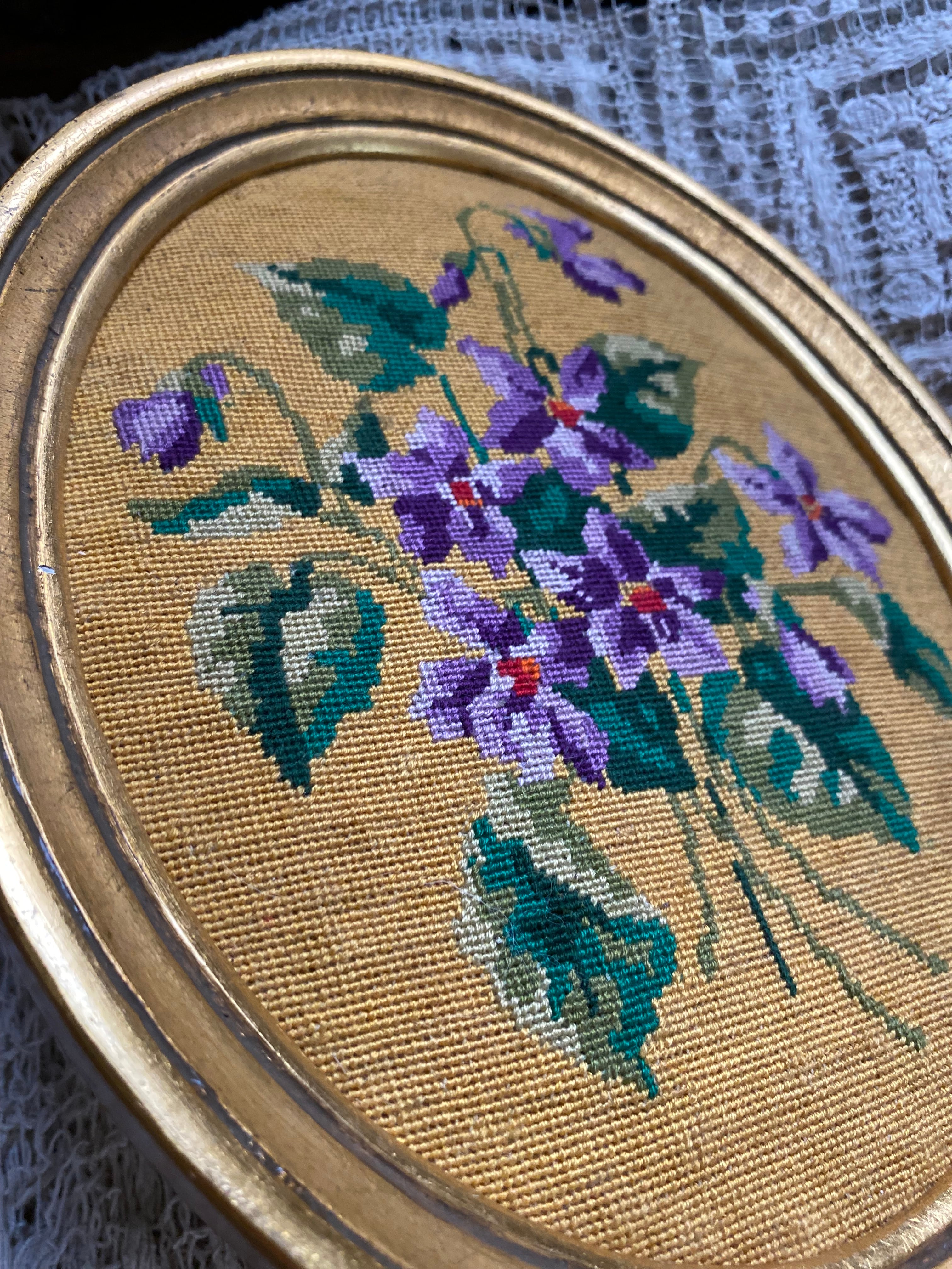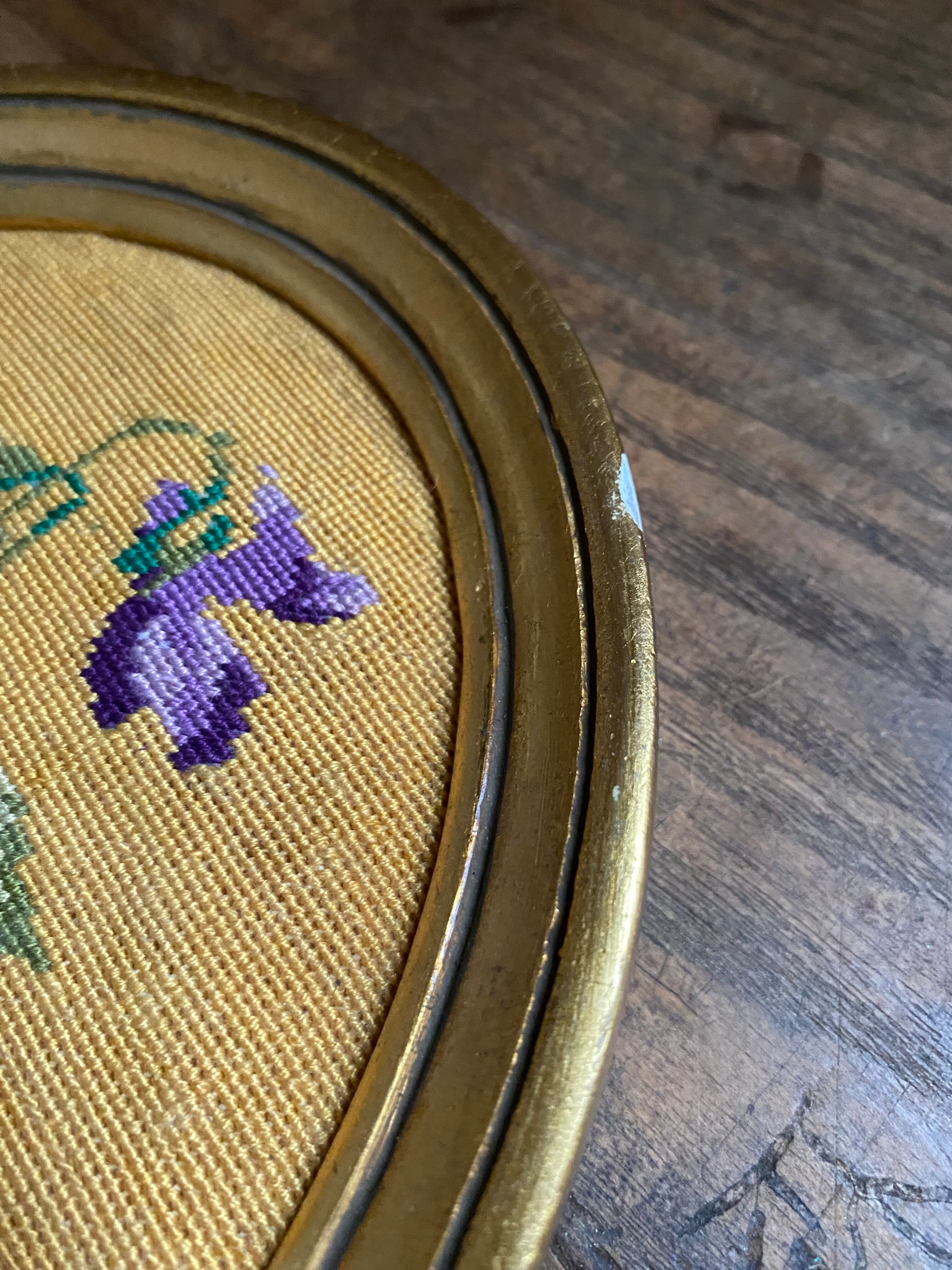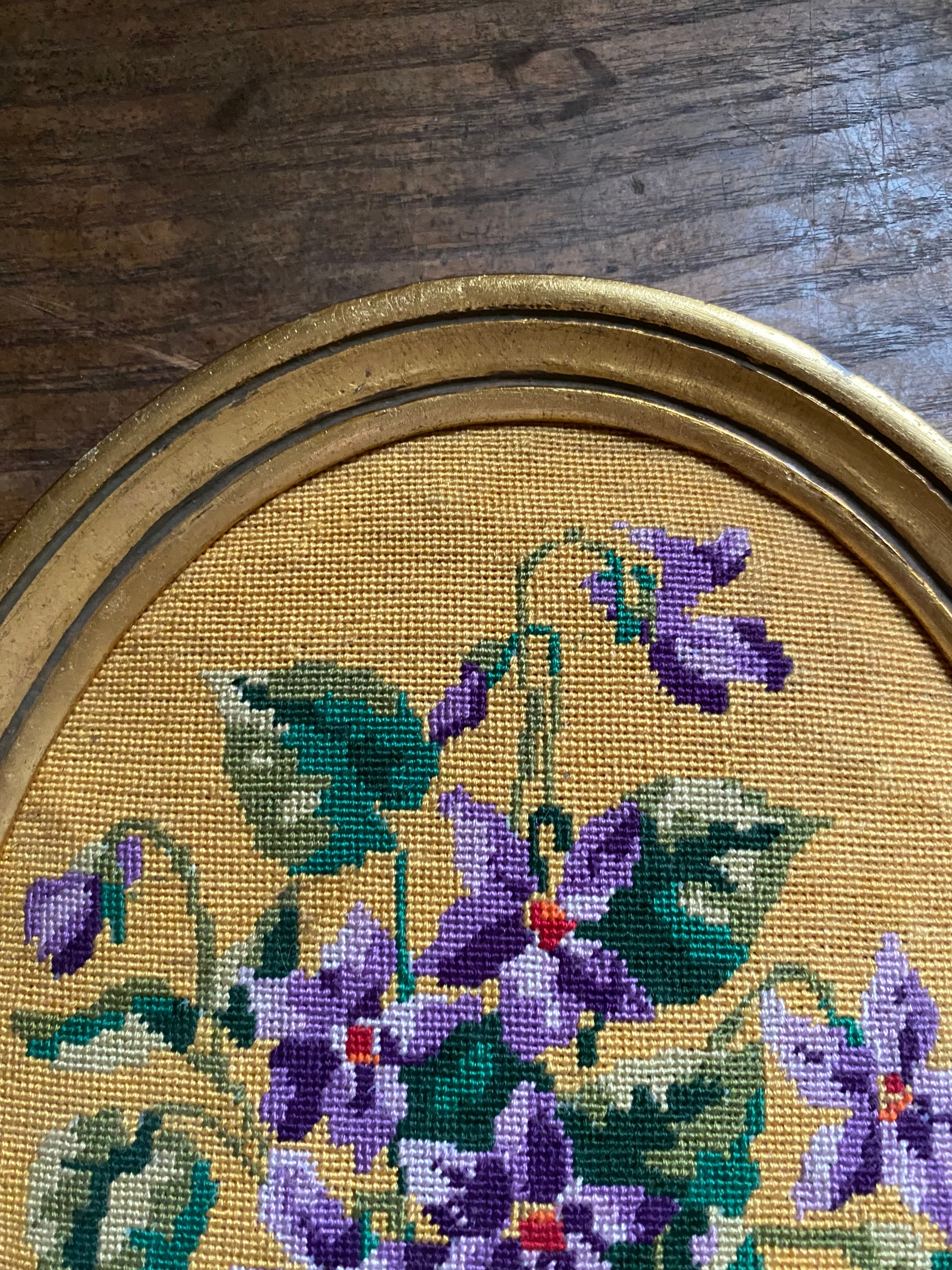 光沢のあるゴールドのフレームに囲まれた、すみれのプチポワン。手仕事の素晴らしさに魅了される一品となっております。まるでイラストのように見えるクロスステッチは1.2ミリの単位です。