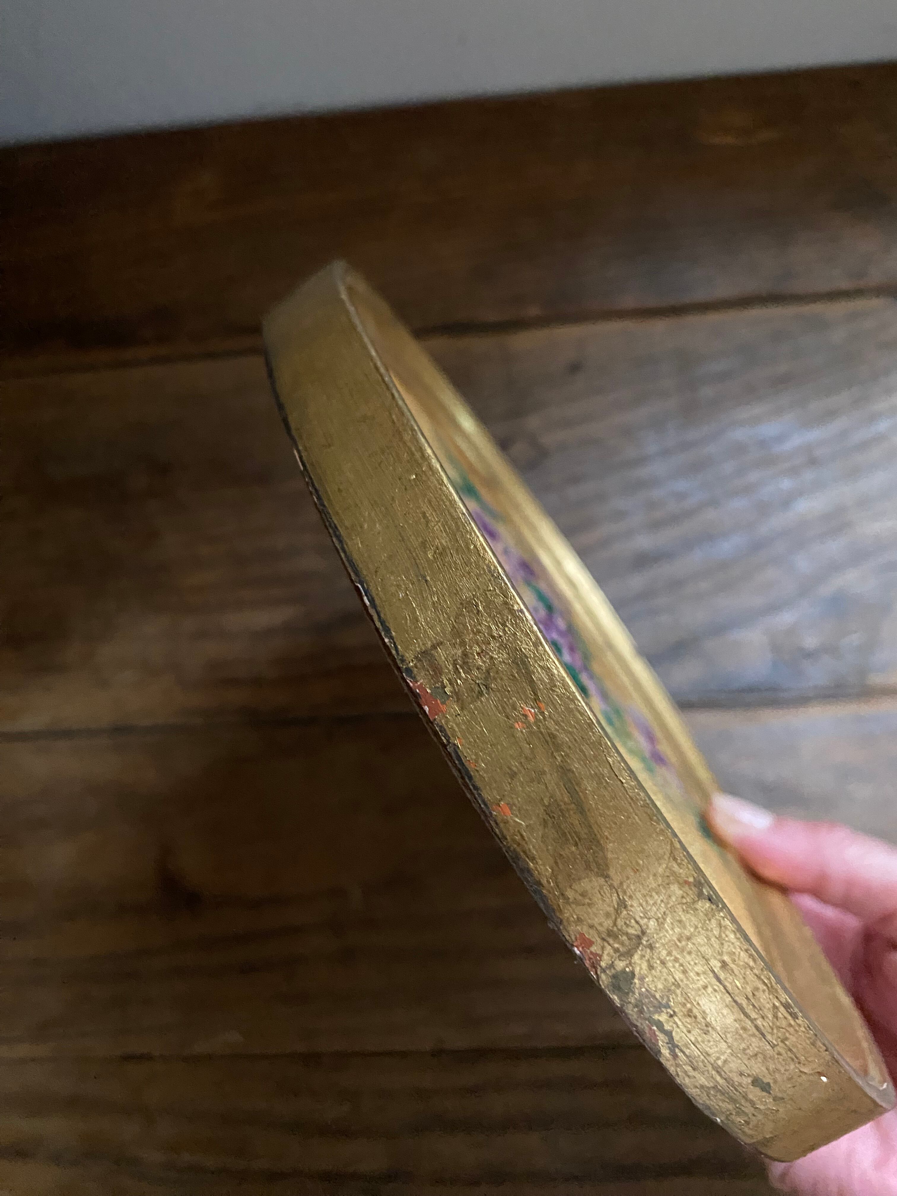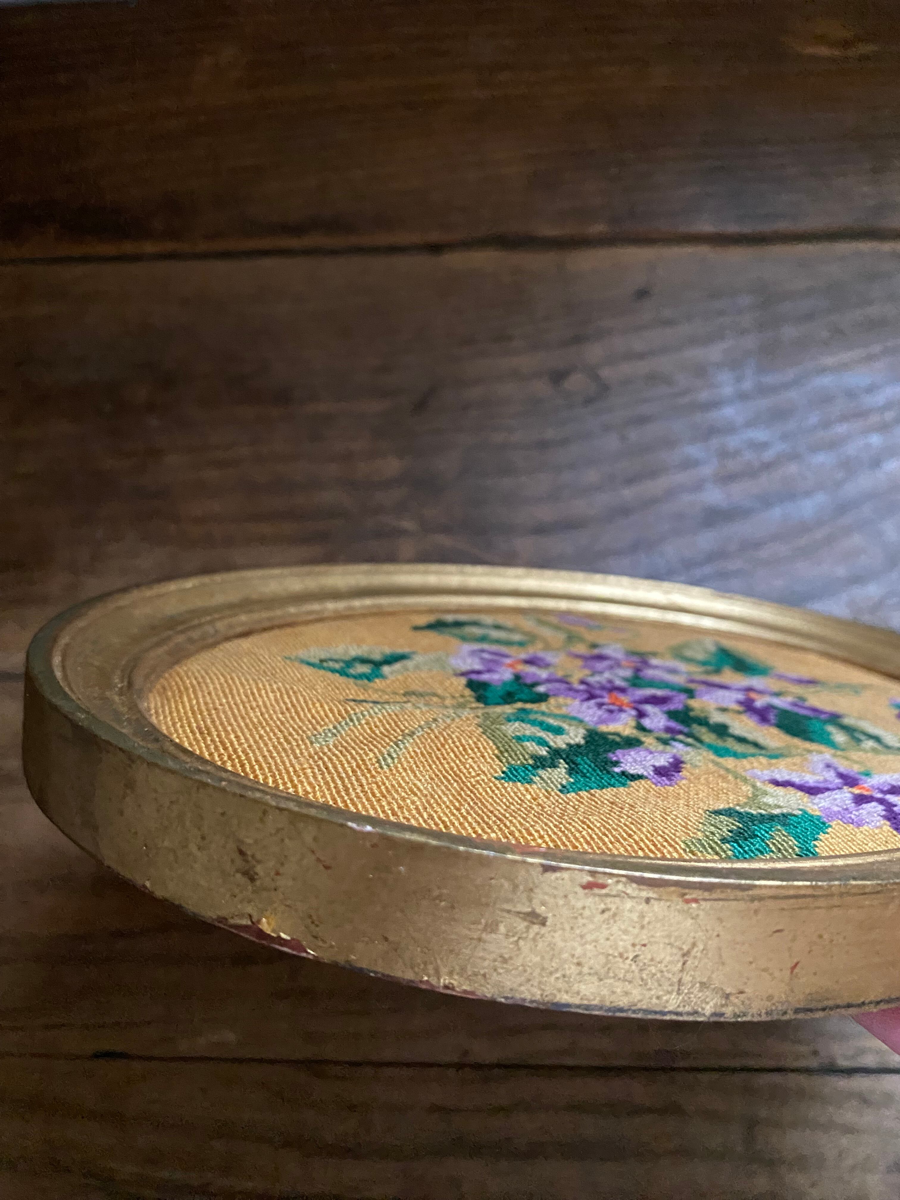 光沢のあるゴールドのフレームに囲まれた、すみれのプチポワン。手仕事の素晴らしさに魅了される一品となっております。まるでイラストのように見えるクロスステッチは1.2ミリの単位です。