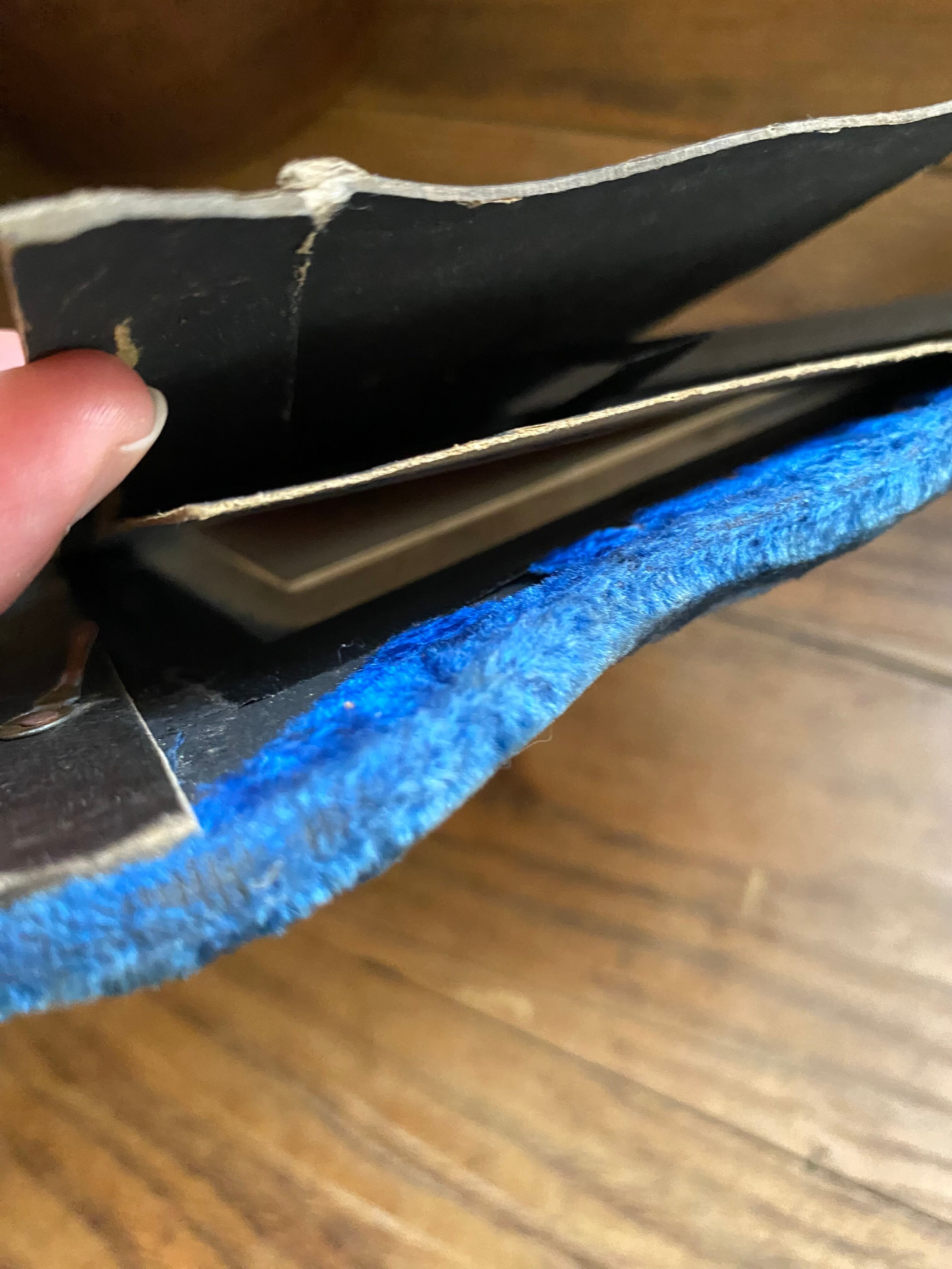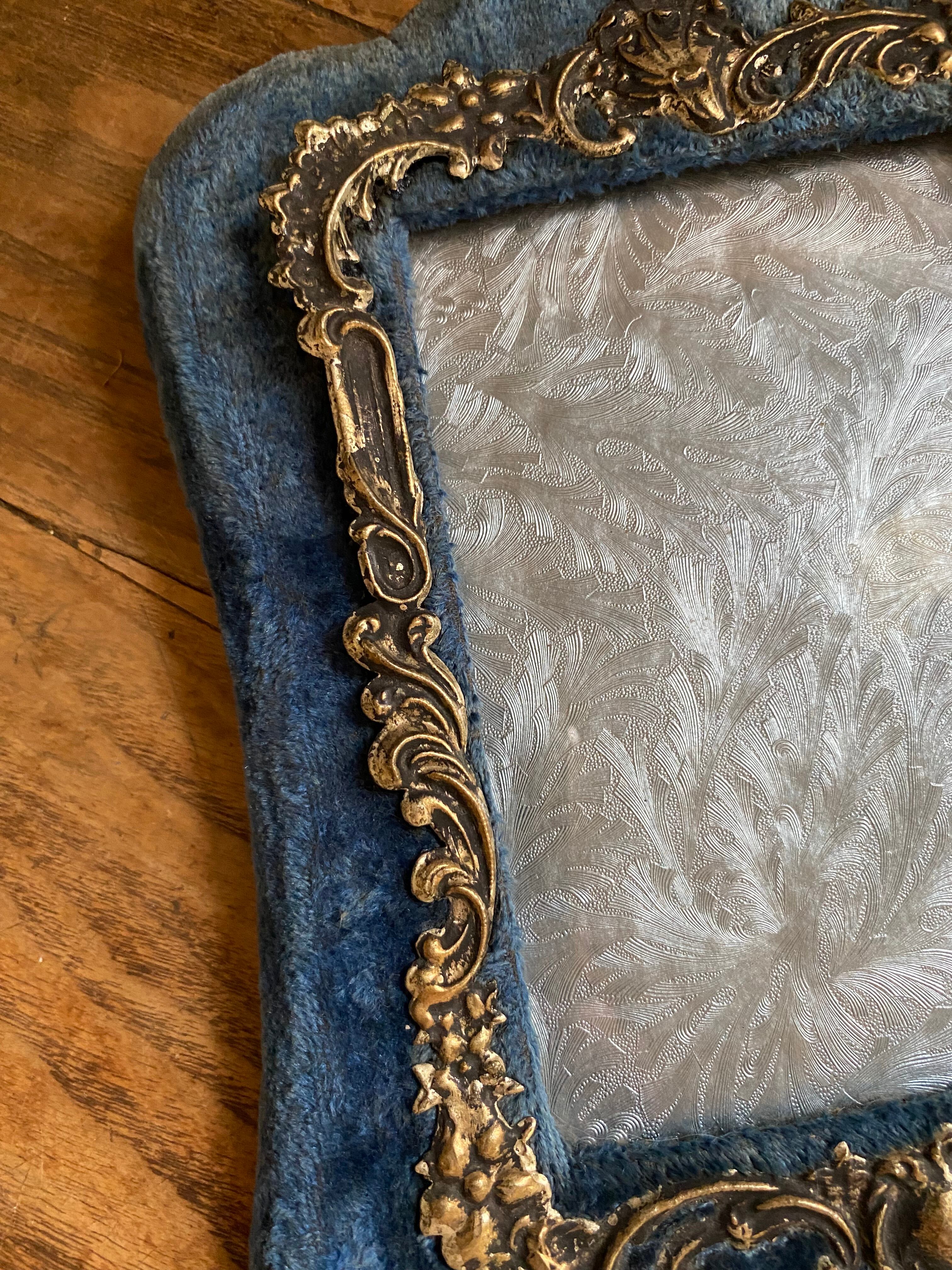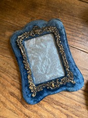 くすんだブルーのベルベット素材でフレームが覆われ、メタル素材の装飾が写真をより引き立たててくれます。