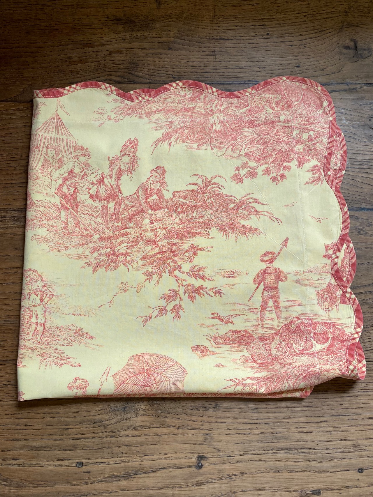 大きめなクッションカバー、縁取りにはタータンチェックの愛らしさ。今にない赤のトワルイジュイの水辺での釣りのシーンや子ども達が遊んでる様子、ヨットや鳥、、どのシーンもほのぼのとしていて癒される絵柄となっております。