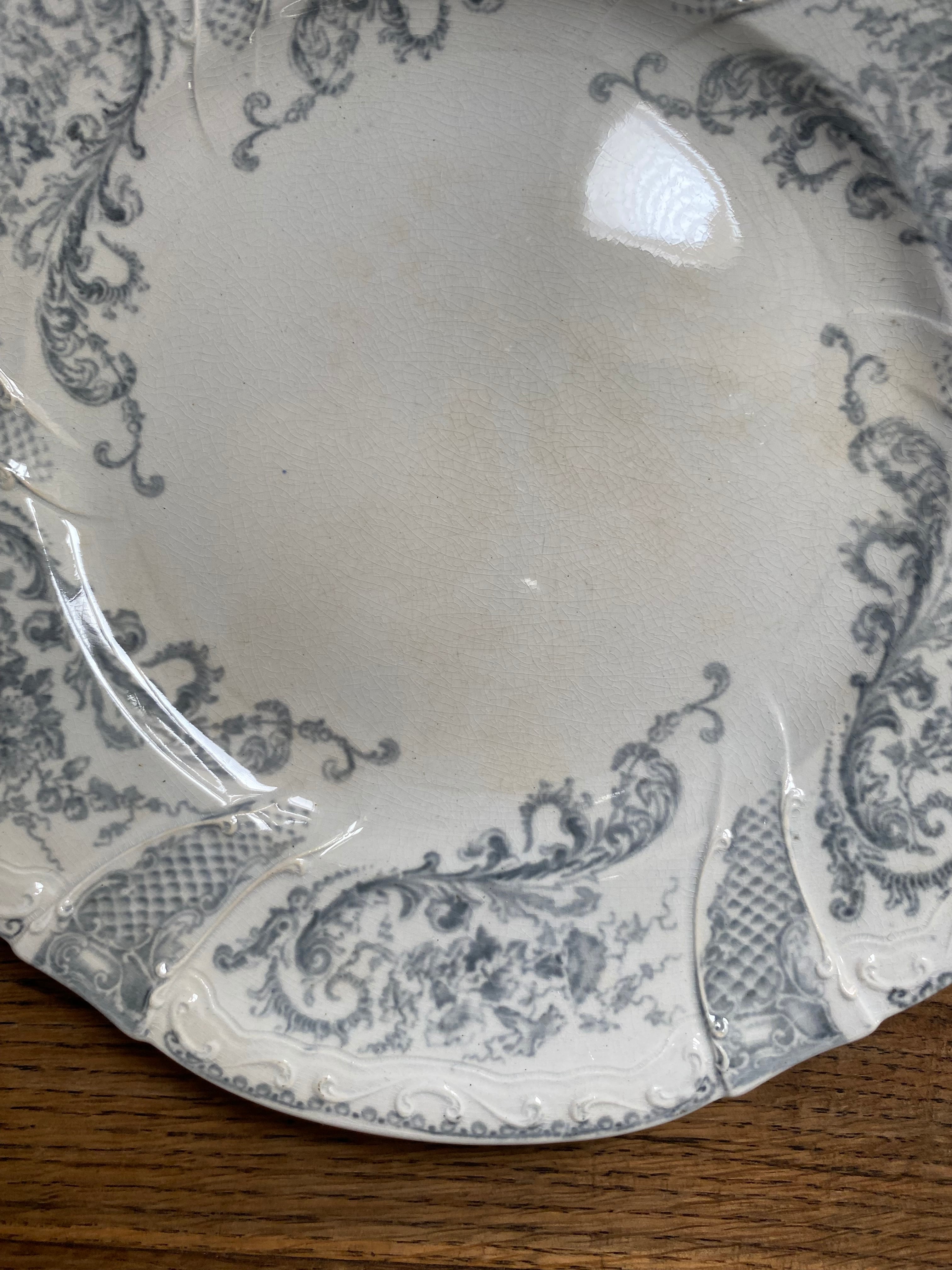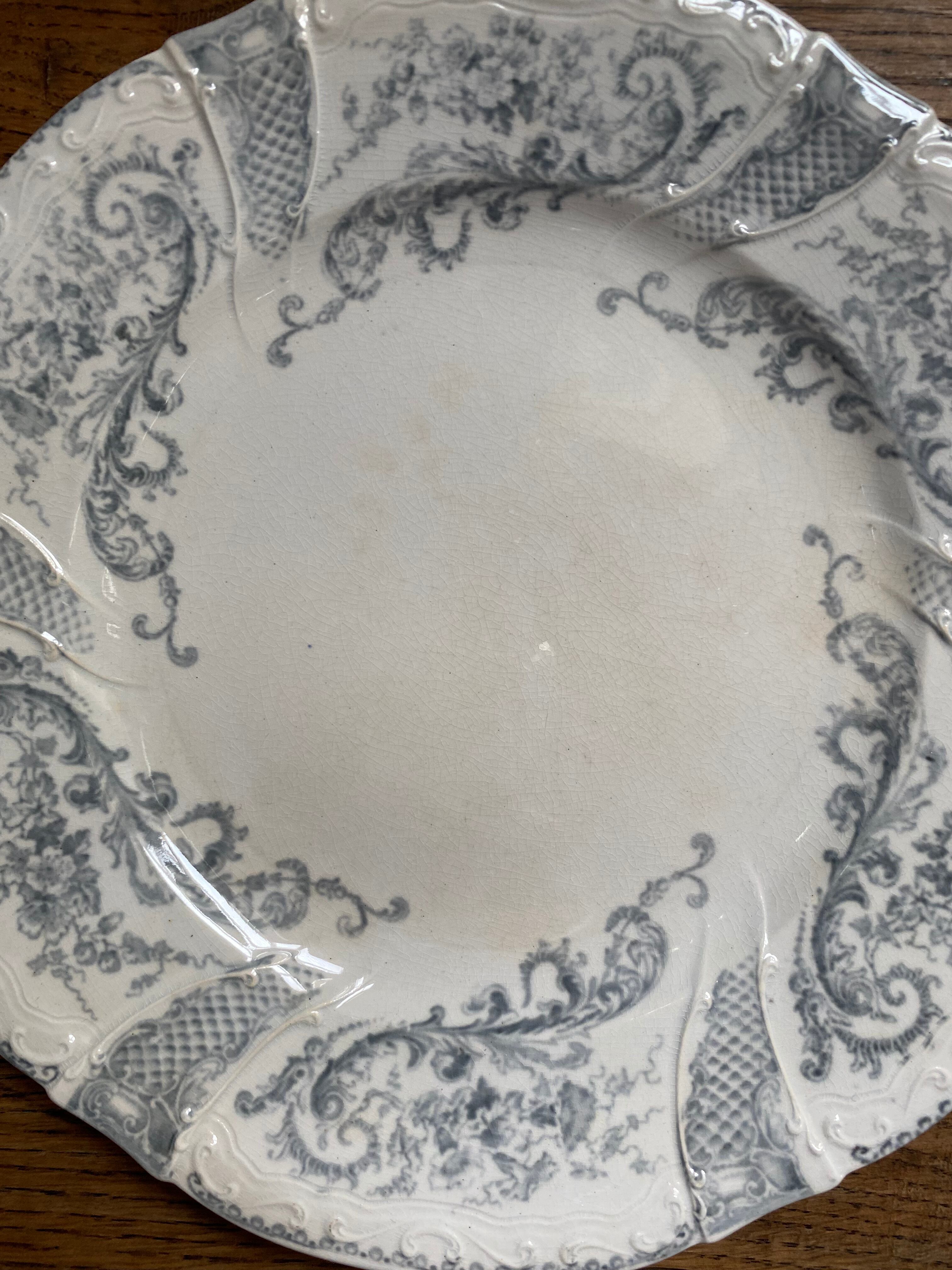 シックなグレーのロカイユ模様、リムはレリーフに合わせて緩やかにカーブされた作り、繊細さが伝わるプレートとなっております。