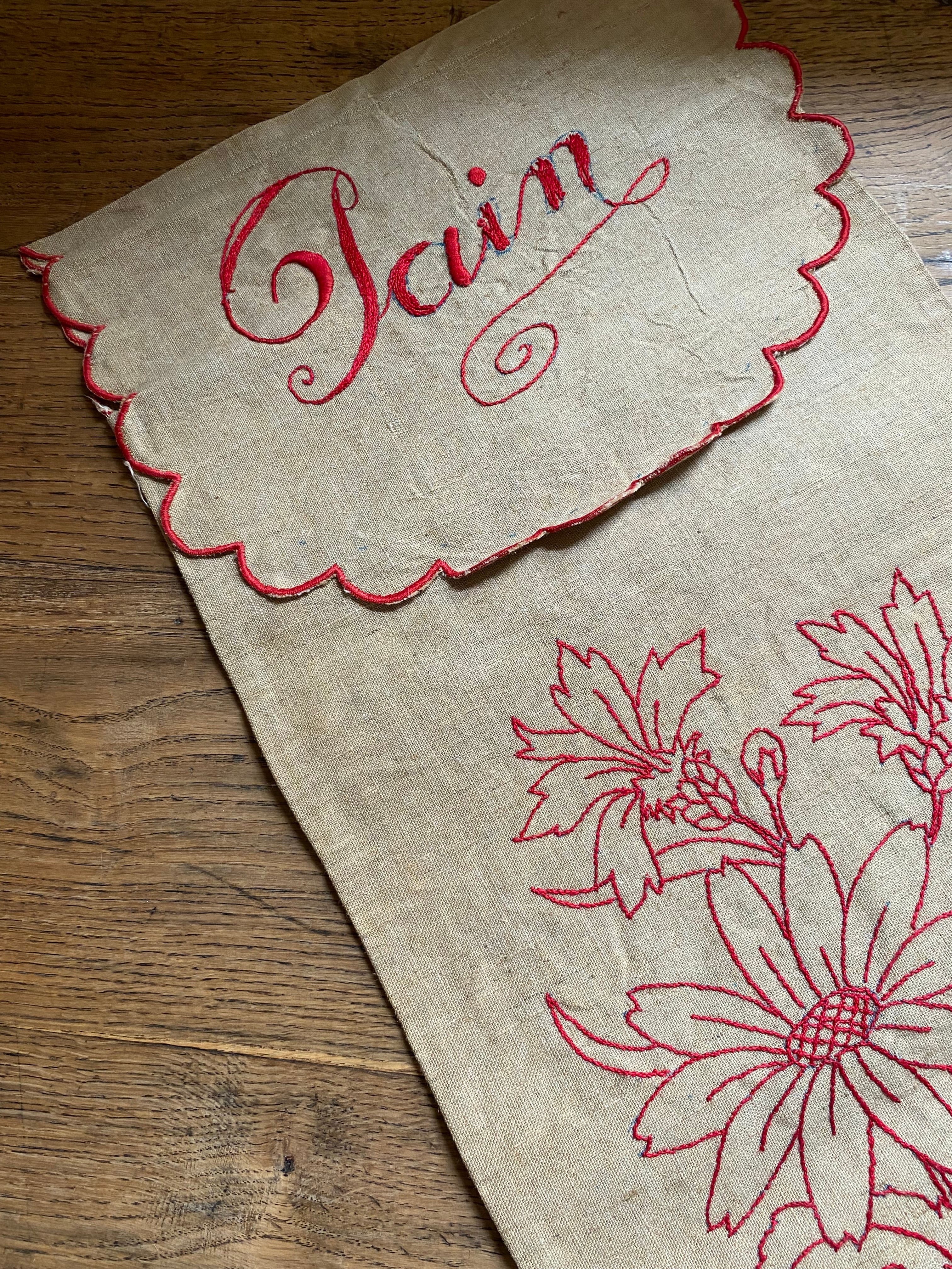 「Pain」と刺繍された麻のパン袋。