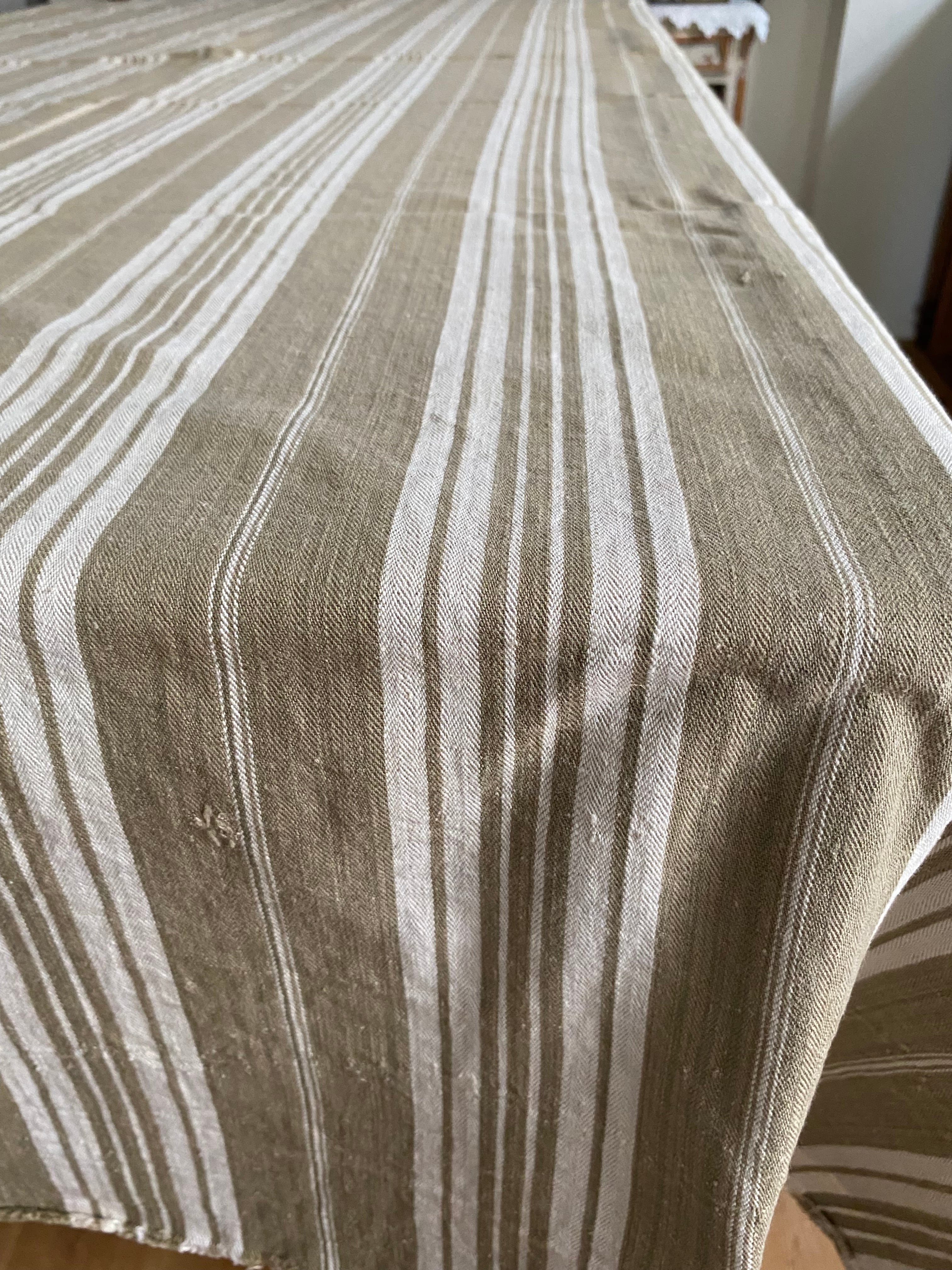 オリーブ×エクリュ色のストライプ、リネンの質感がしっかりとしたヘリンボーン織、元々マットレスカバーとして織られた事もあり、中の藁が飛び出さないように布目がとても細かく織られています。