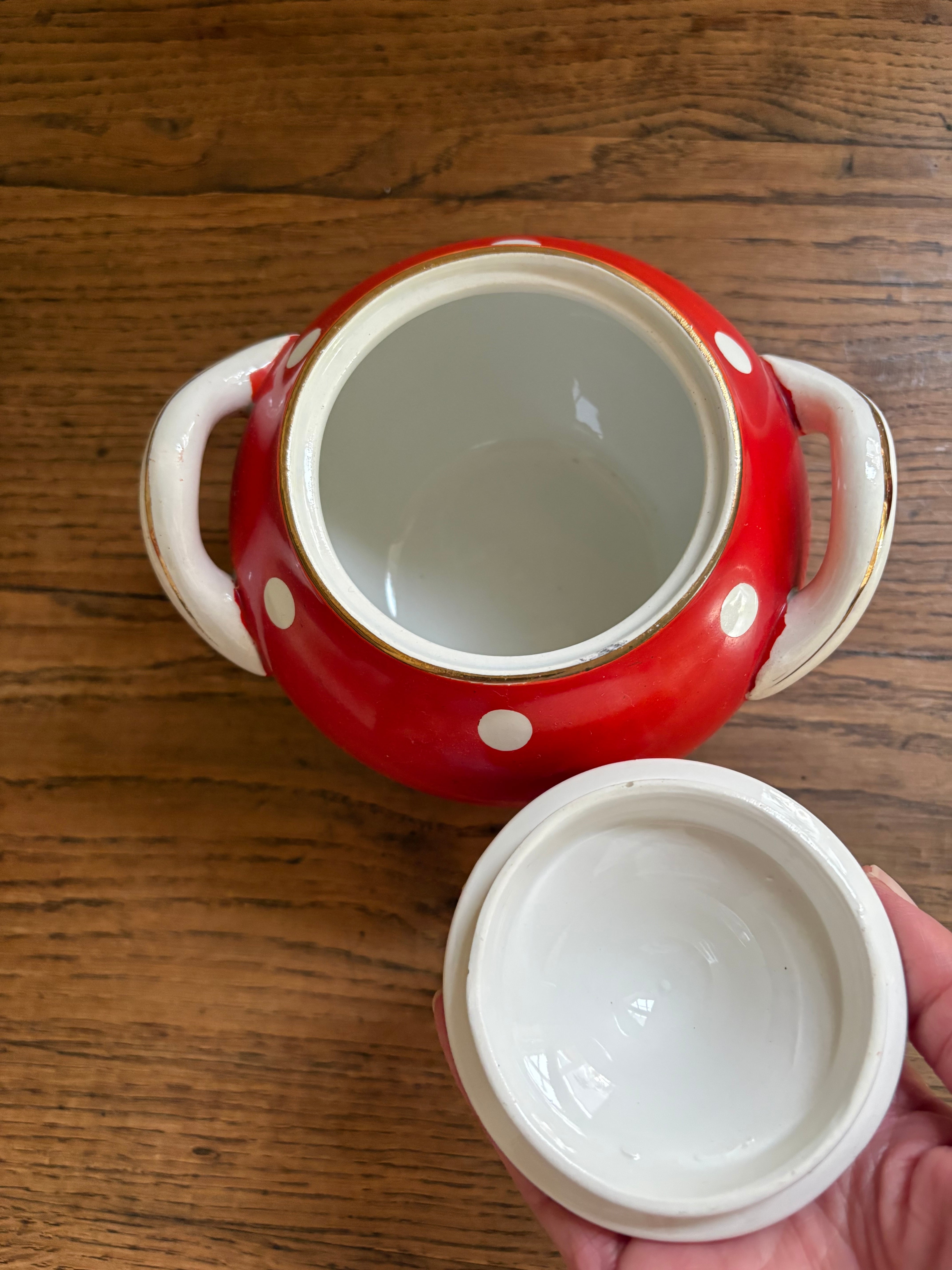 サルグミンヌ窯の色鮮やかな赤に白い水玉の器は陶器製の物になります。