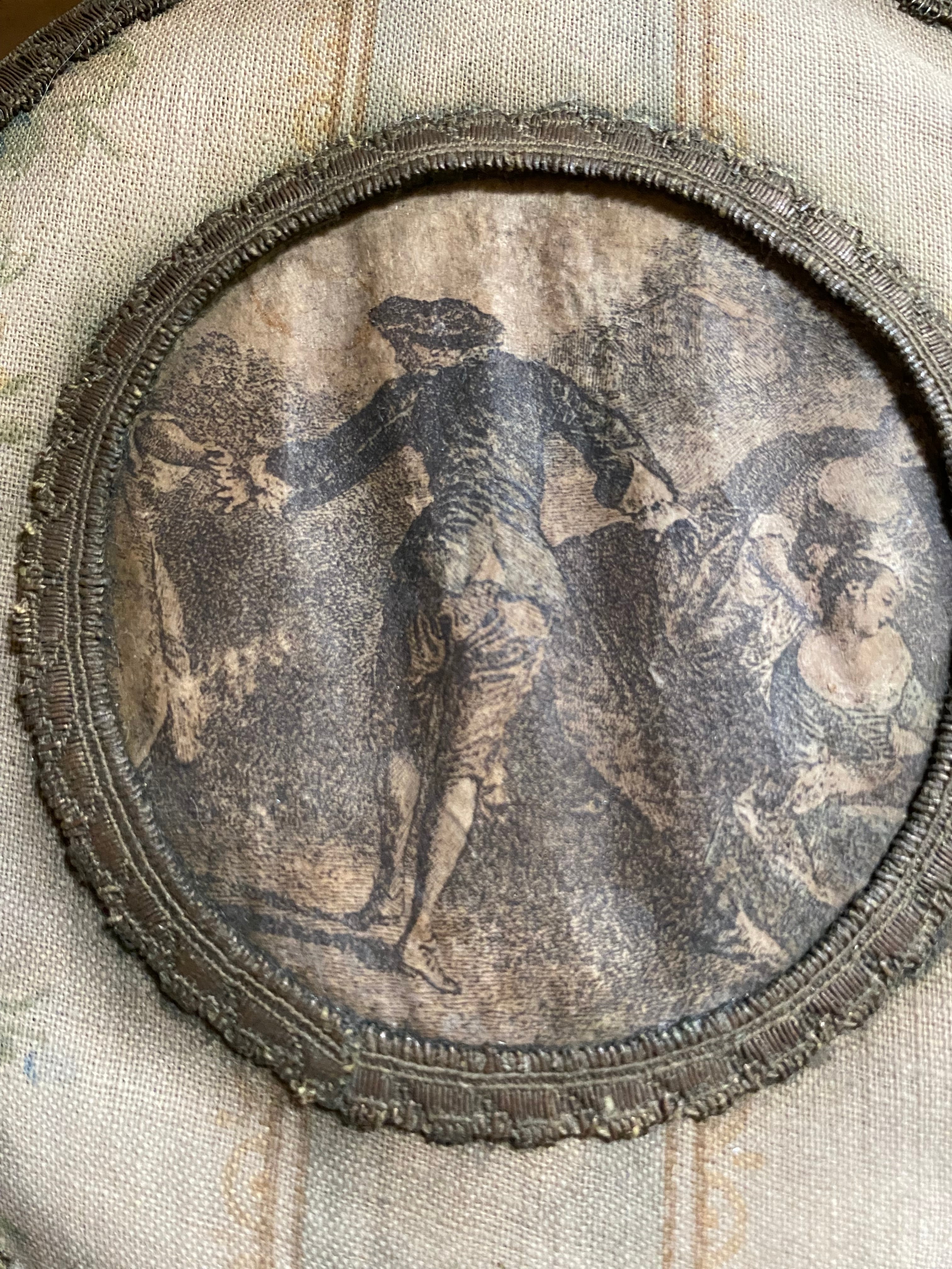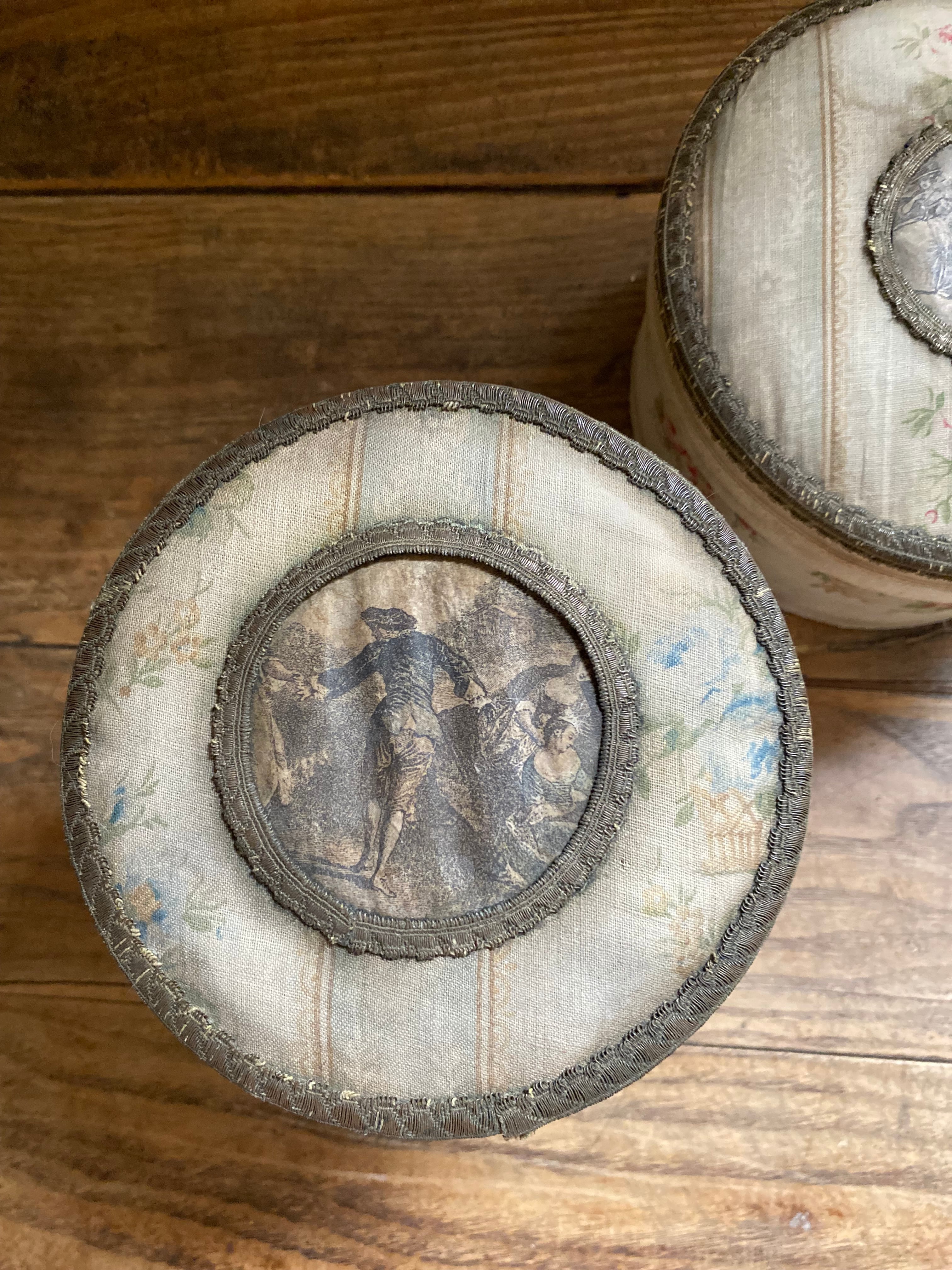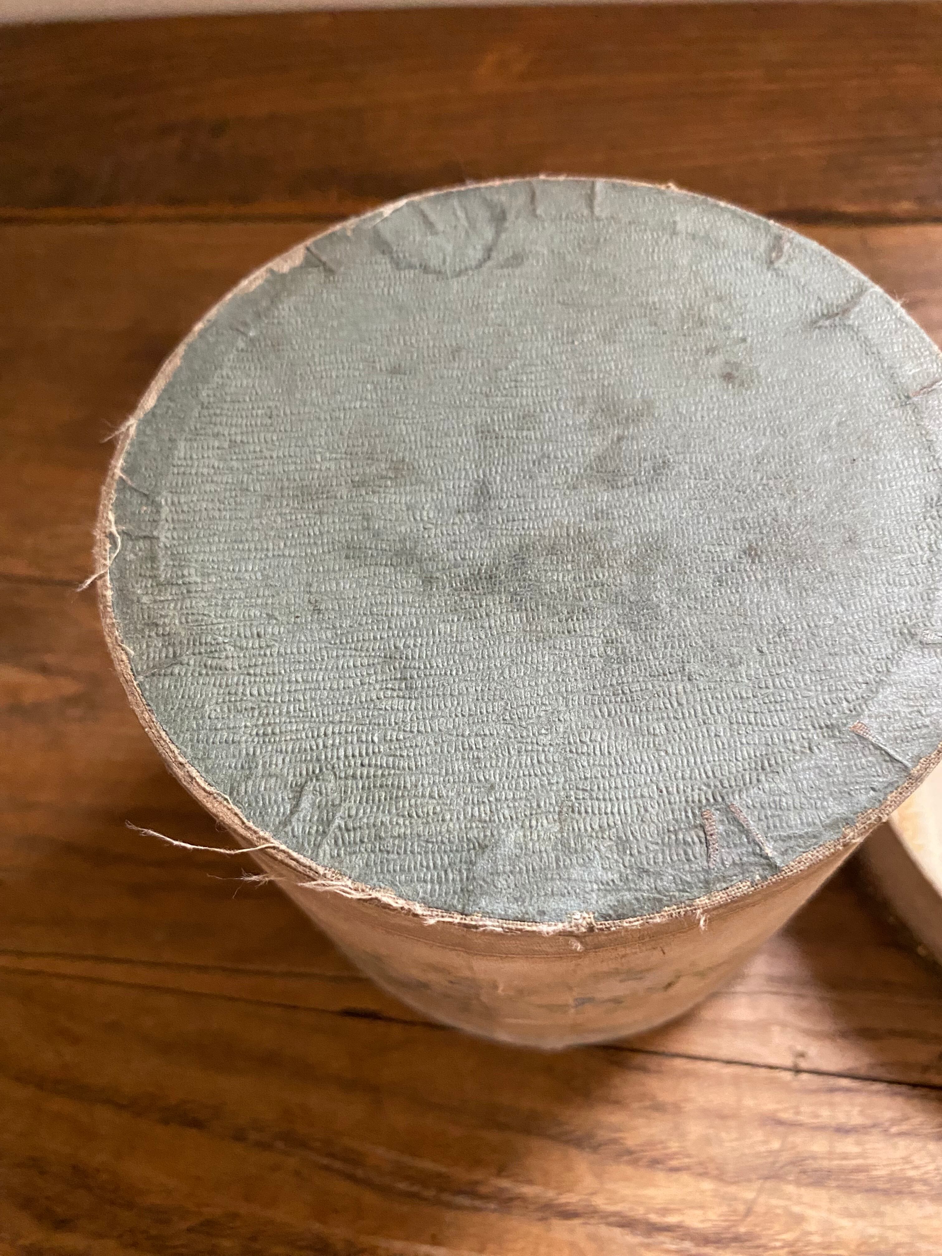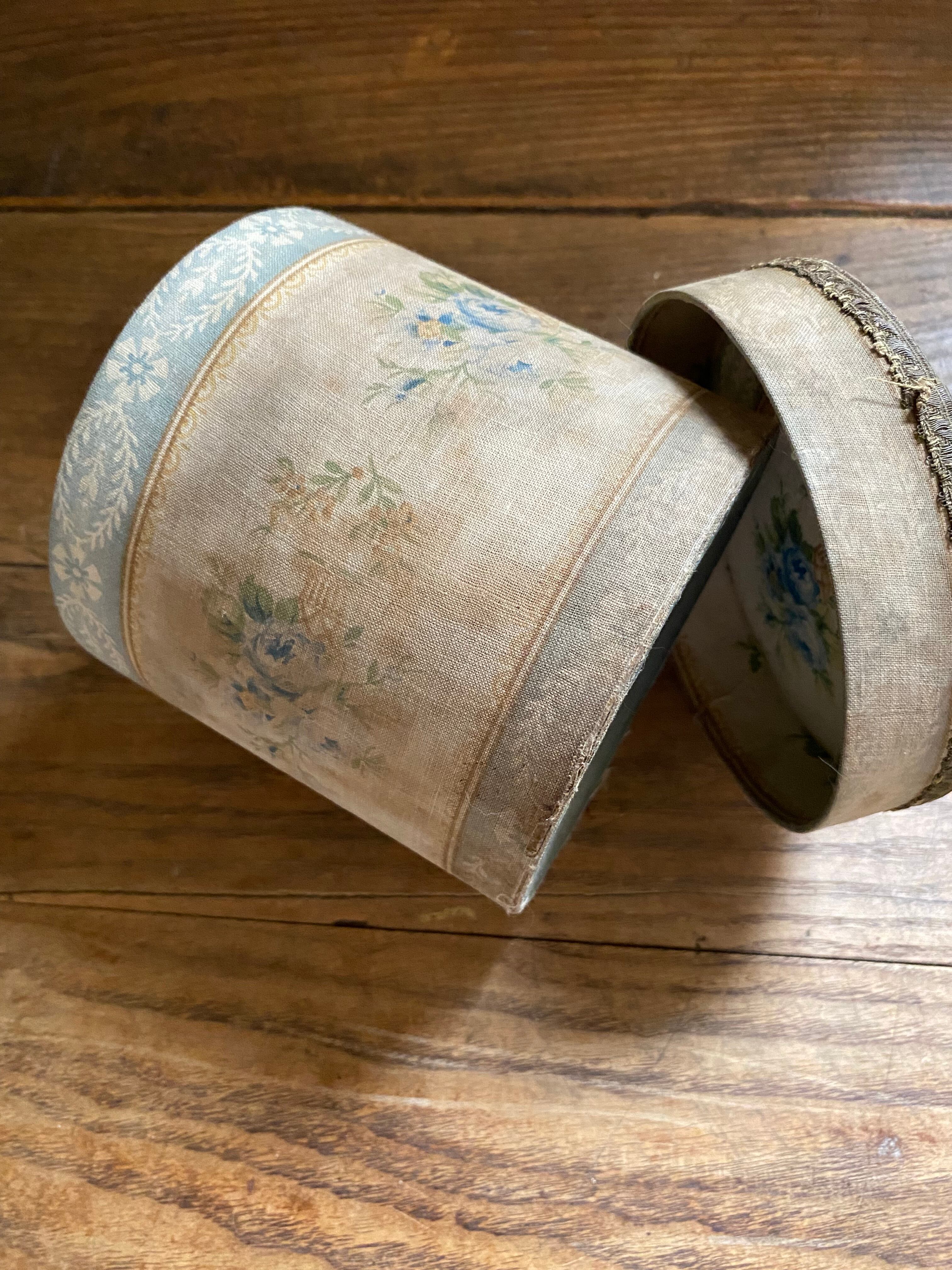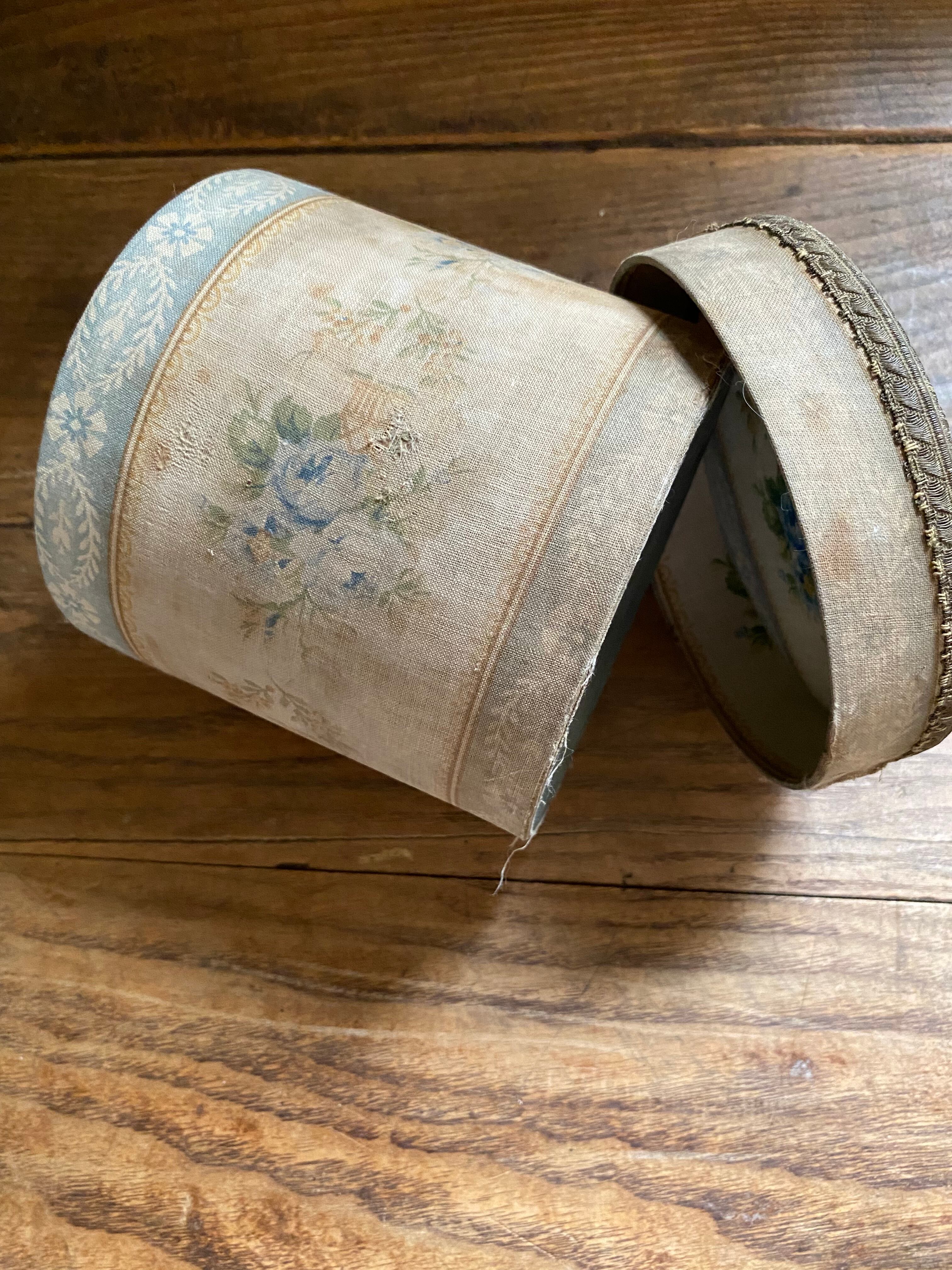古く色褪せたカルトナージュ、ローズ柄の布が貼られ、内と外の色味の違いに時代の流れを感じます。蓋にはアクセントにゴ 金糸のレースが縁取られ、貴族の後ろ姿のモチーフが丁寧にコラージュされております。