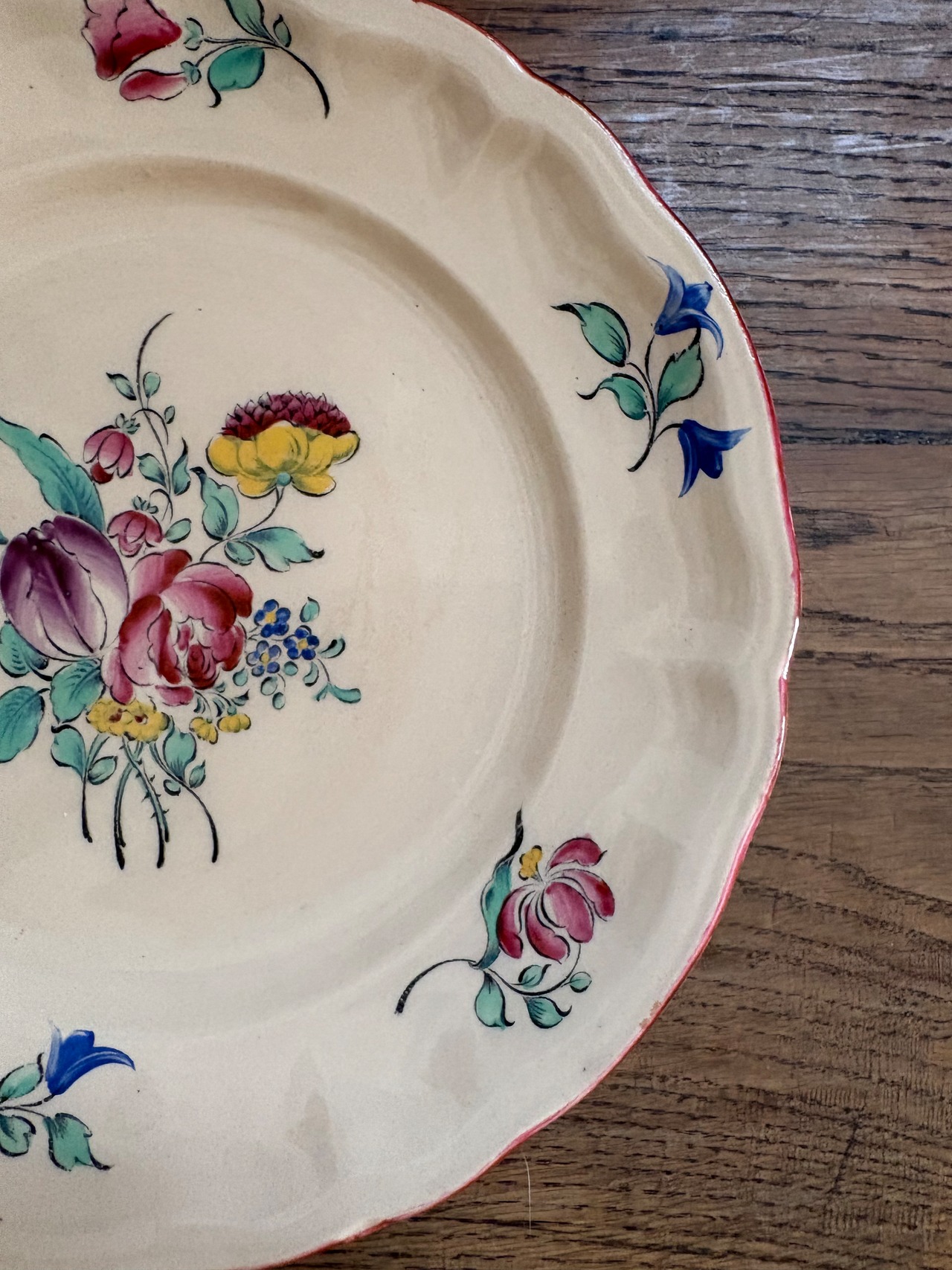 ハンドペイントで描かれた薔薇と花々のブーケが中央に、リムにもバランスよく小さなお花が添えられております。