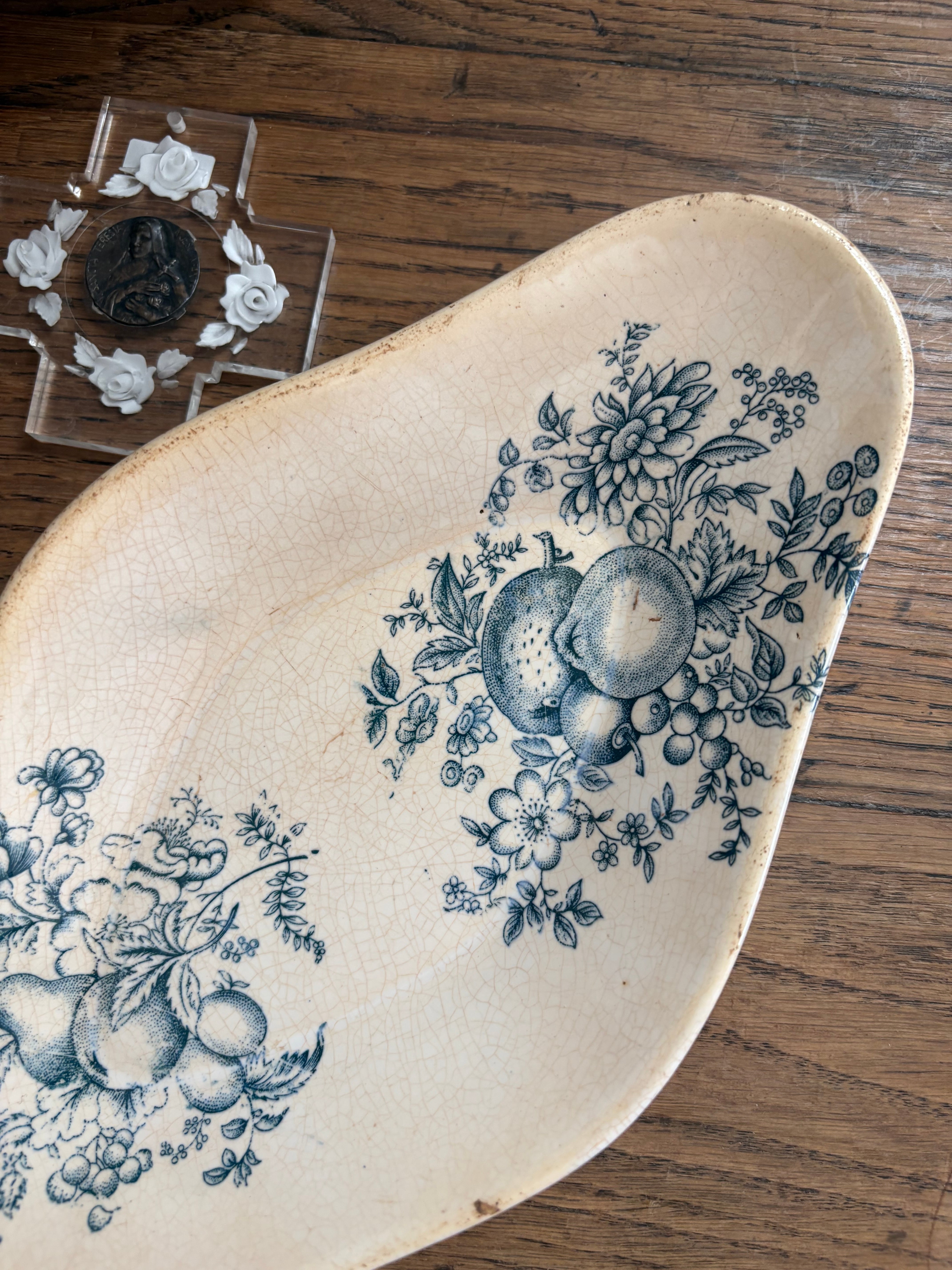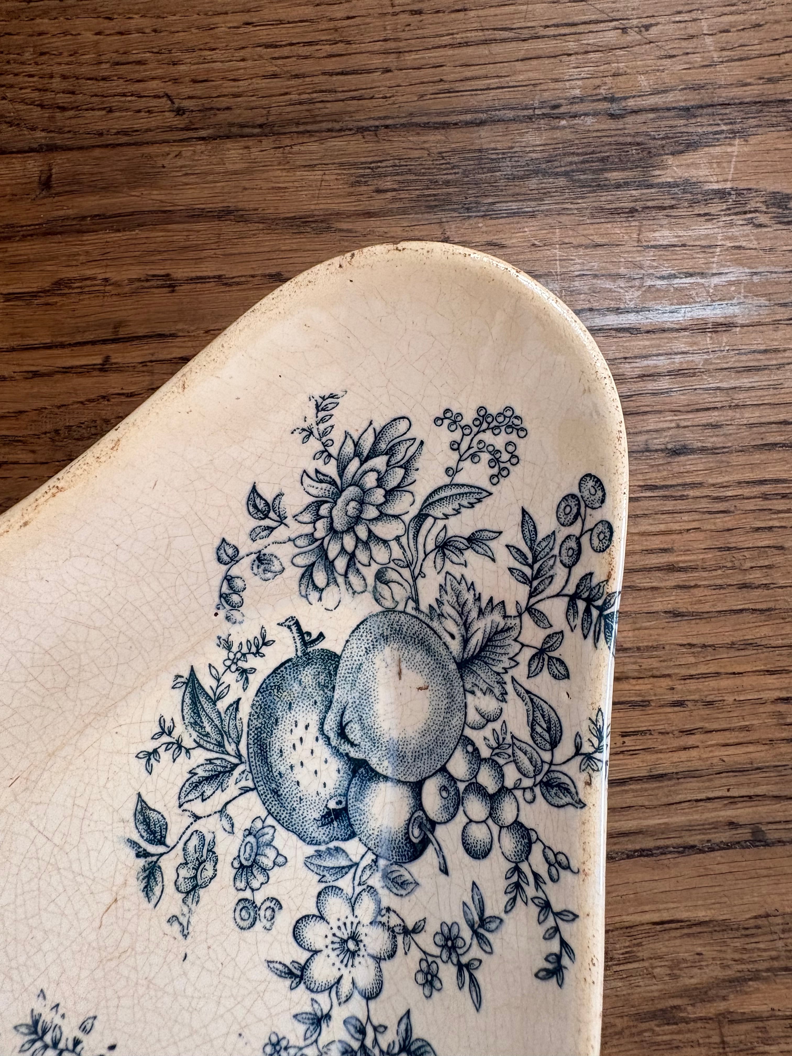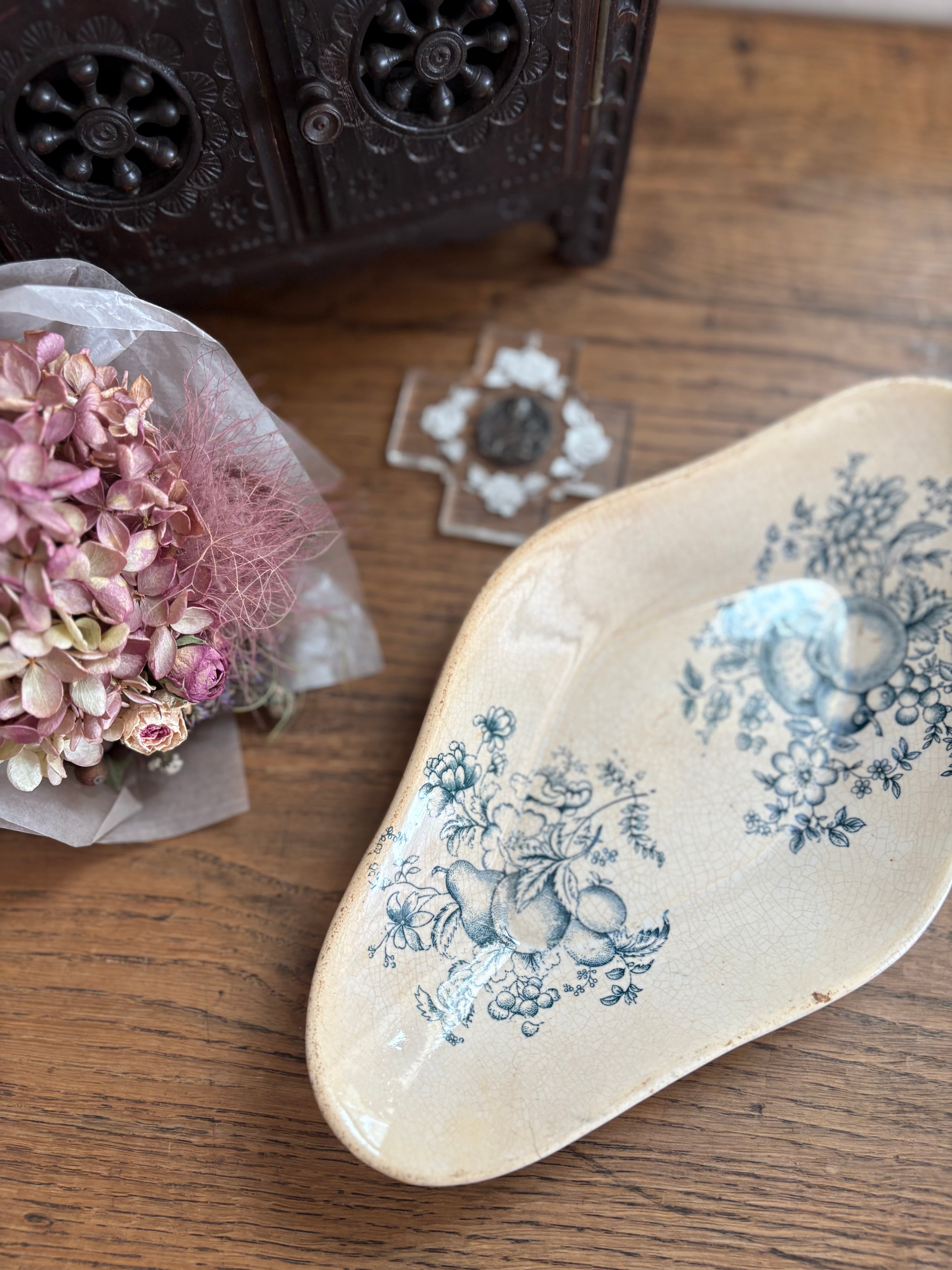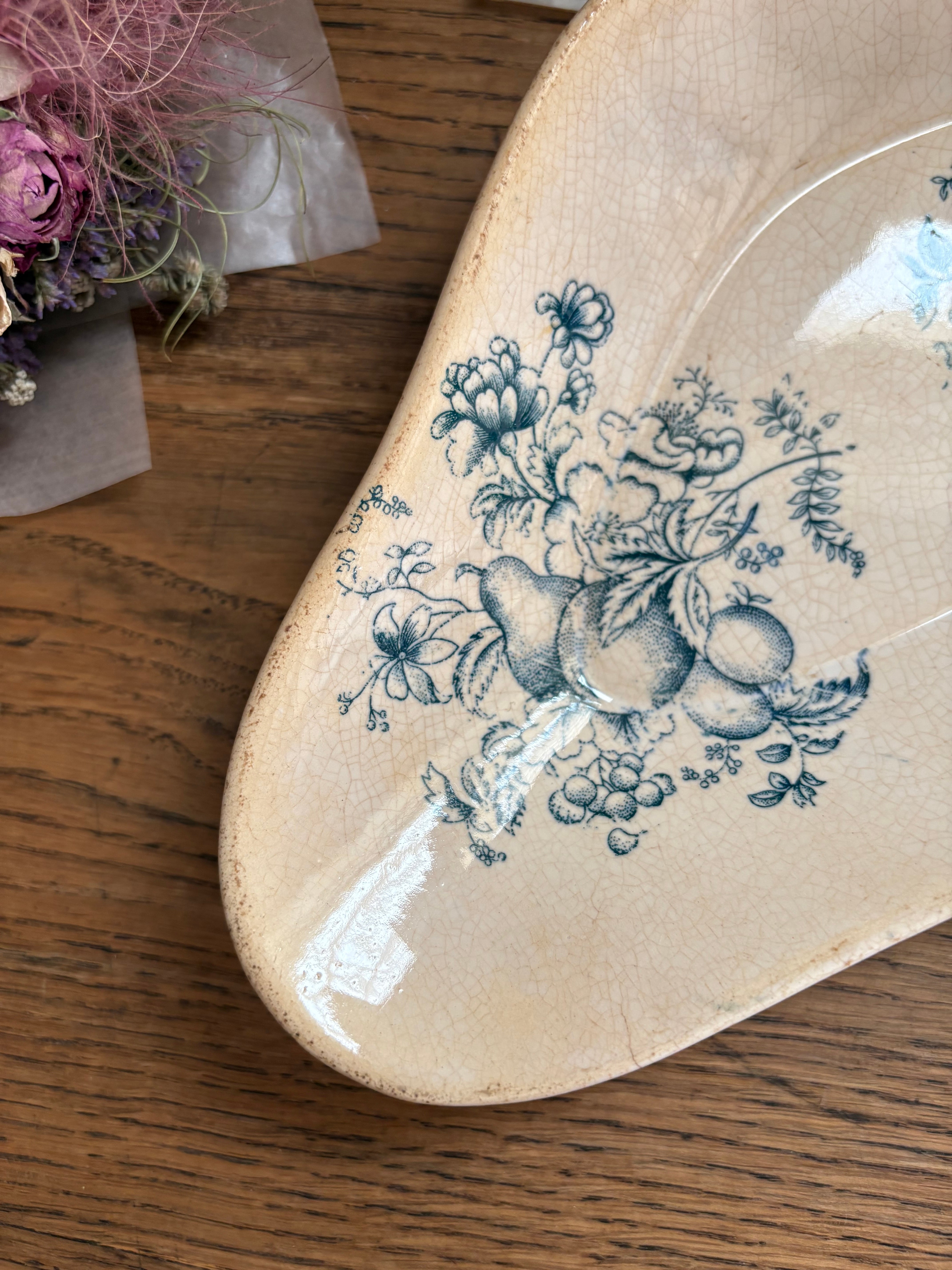 貫入に色付いたアンティークカラーをベースにブルーグレーで描かれてるのはフルーツと花模様、ラ・フランス、マンダリン、ミラベルなどのフランスで採れる果物の姿に目を奪われます。