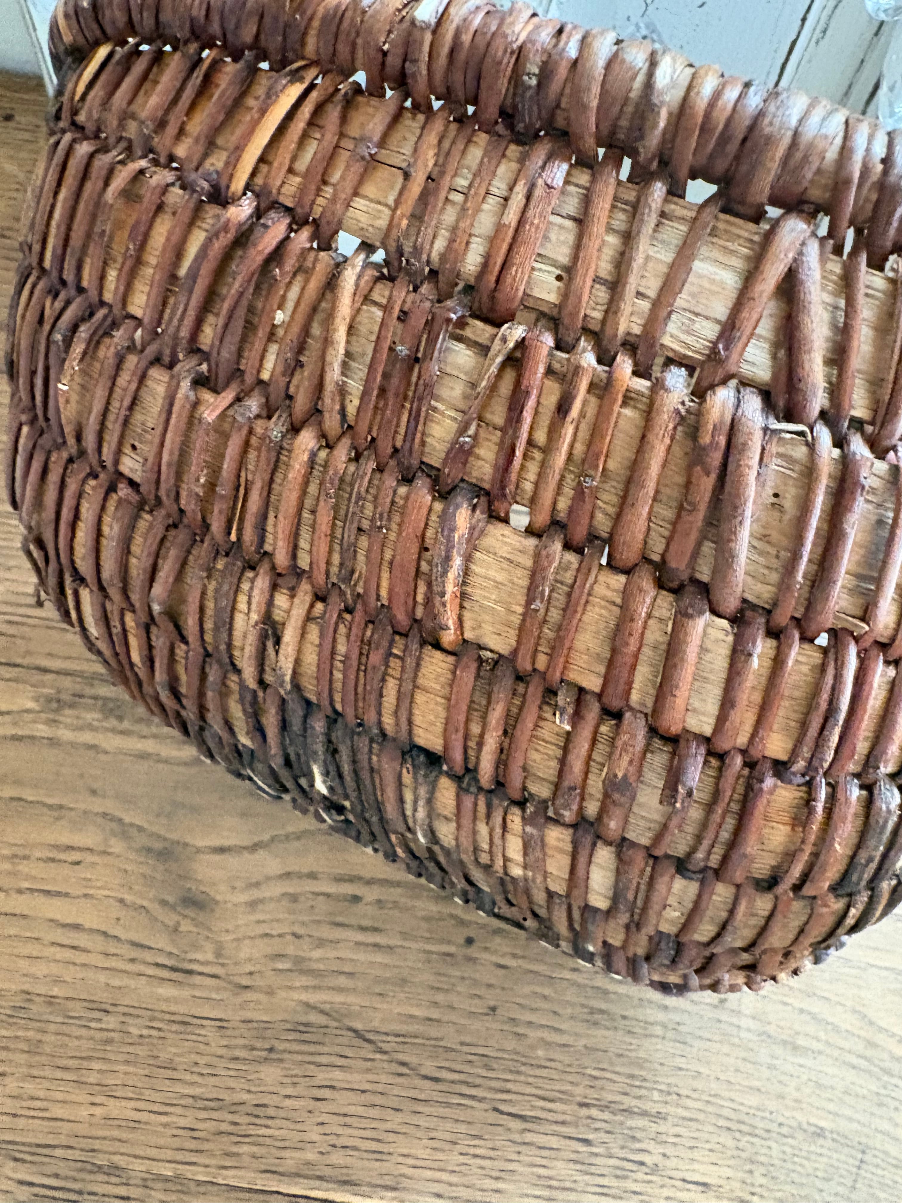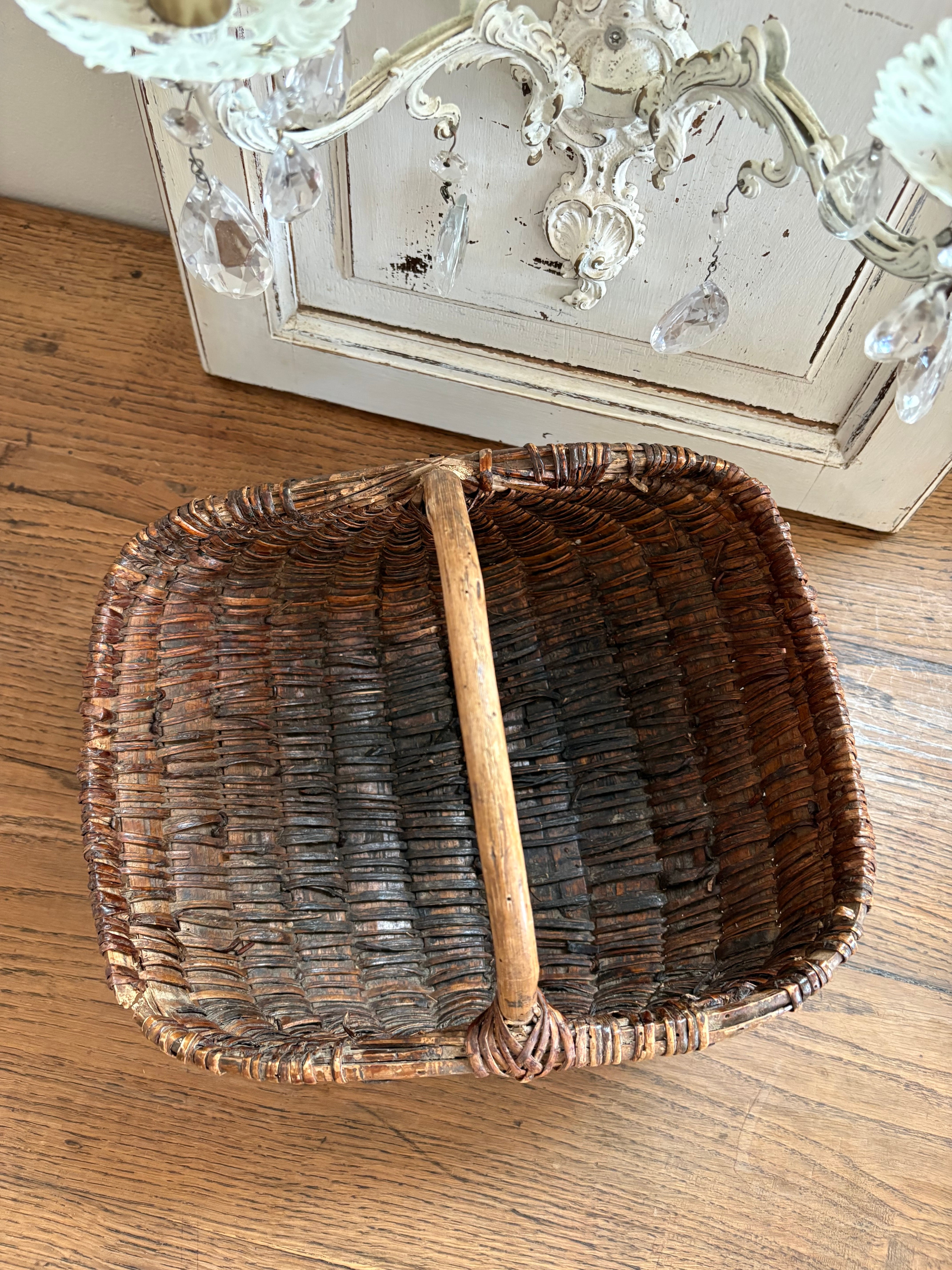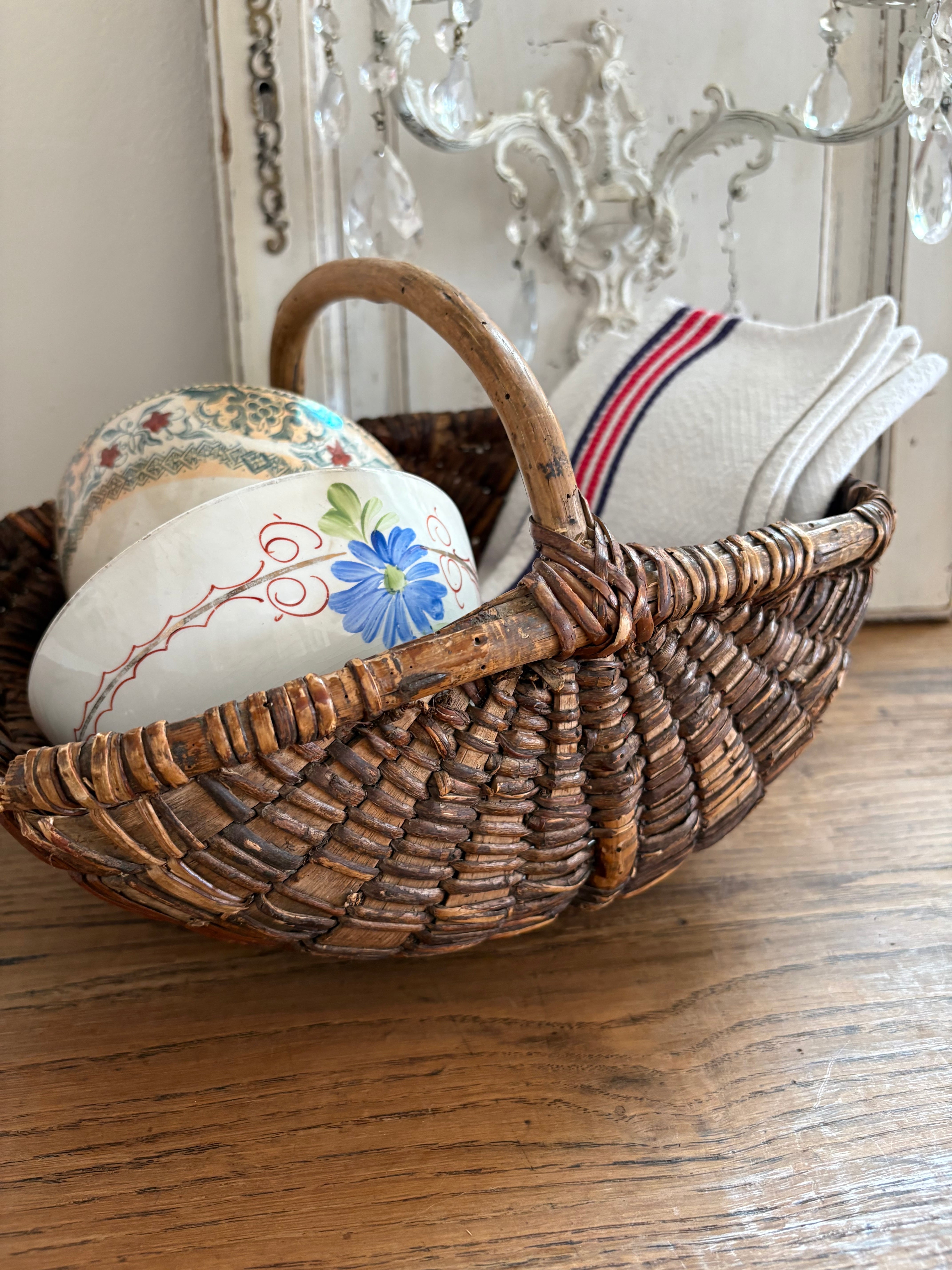 コロンとしたパニエ、浅めでなかが見えやすい半円のようなフォルムになっております。経年で風合いの出た中底は黒みを増し、ハンドル部分も良い風合いとなっております。