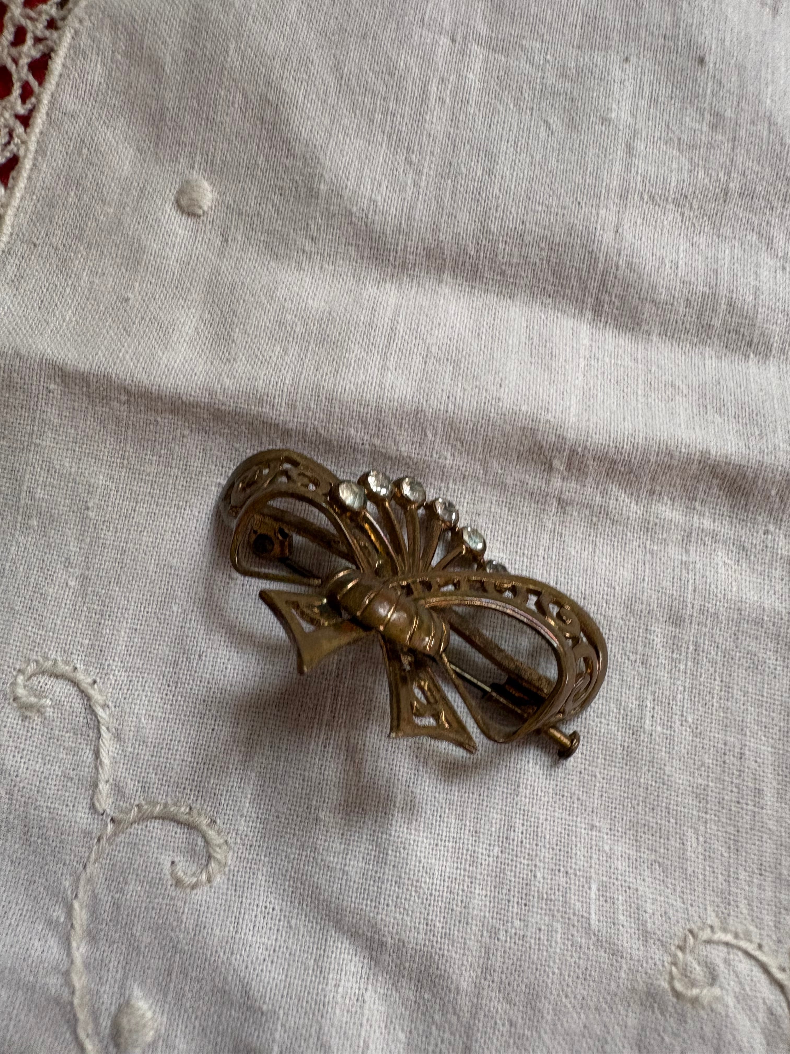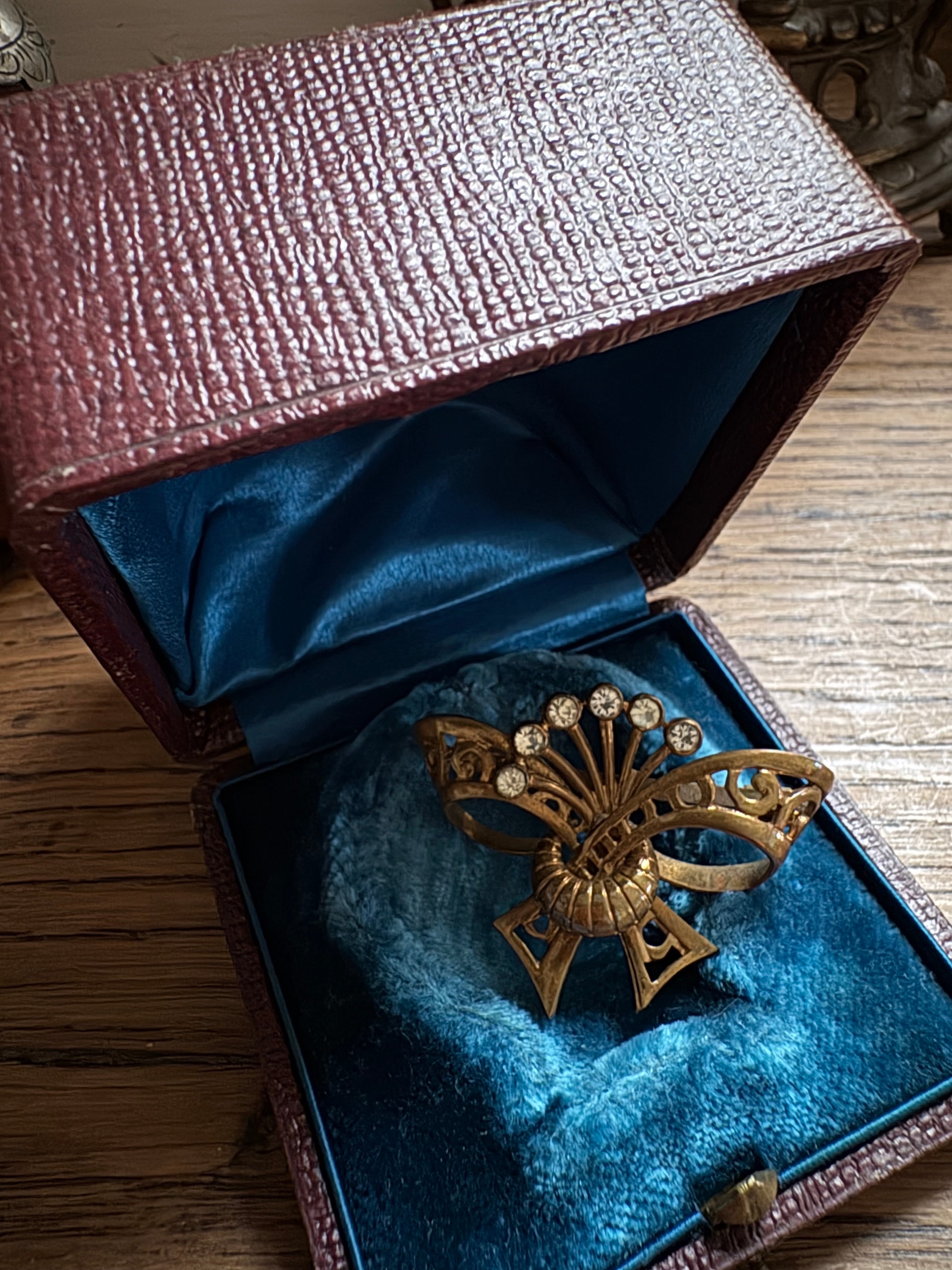 ゴールドカラーのアールヌーボーなブローチ、リボンのように束ねられた箇所からはグラスストーンが埋め込まれたお花の萼を連想させるデザイン。