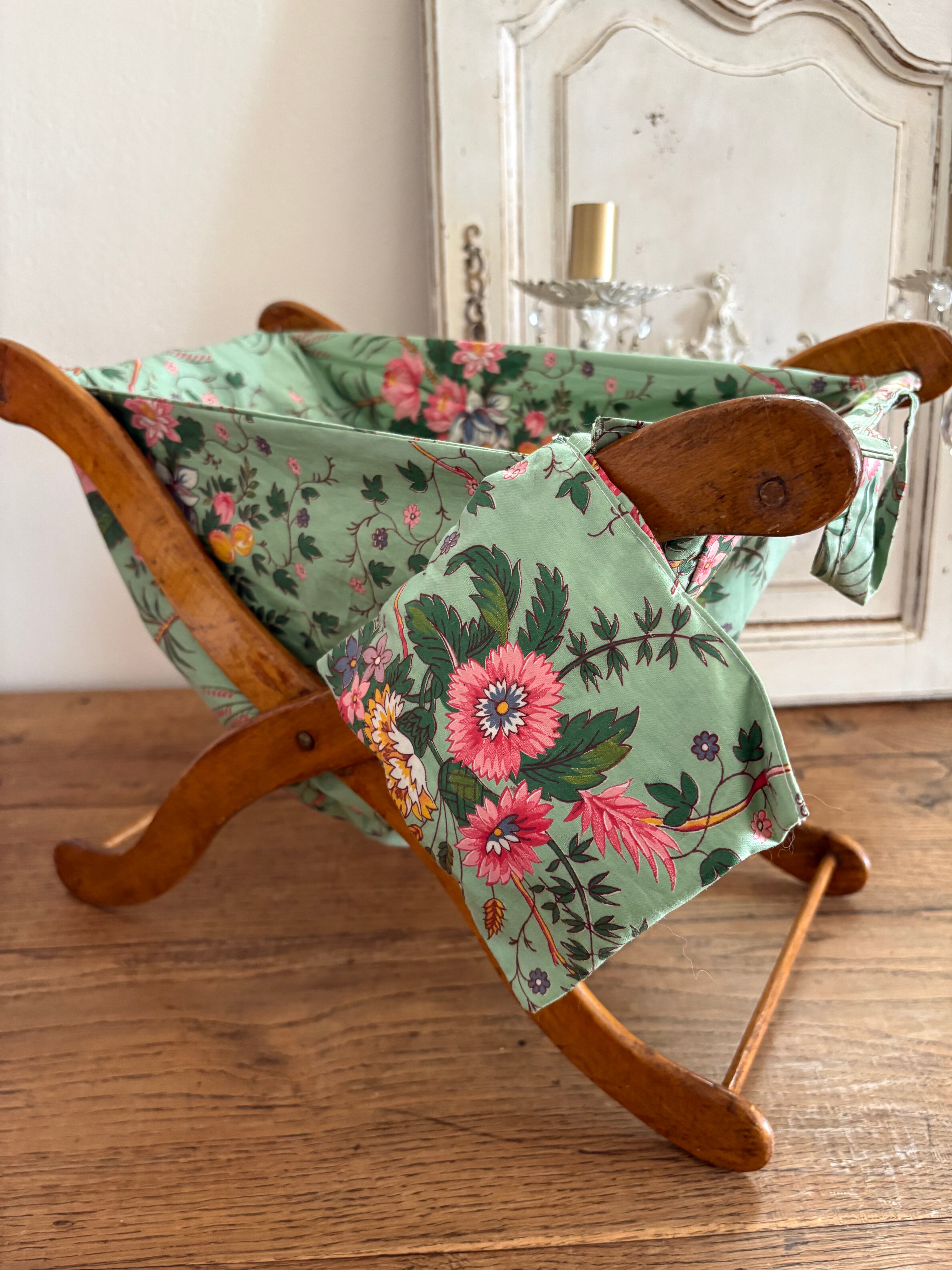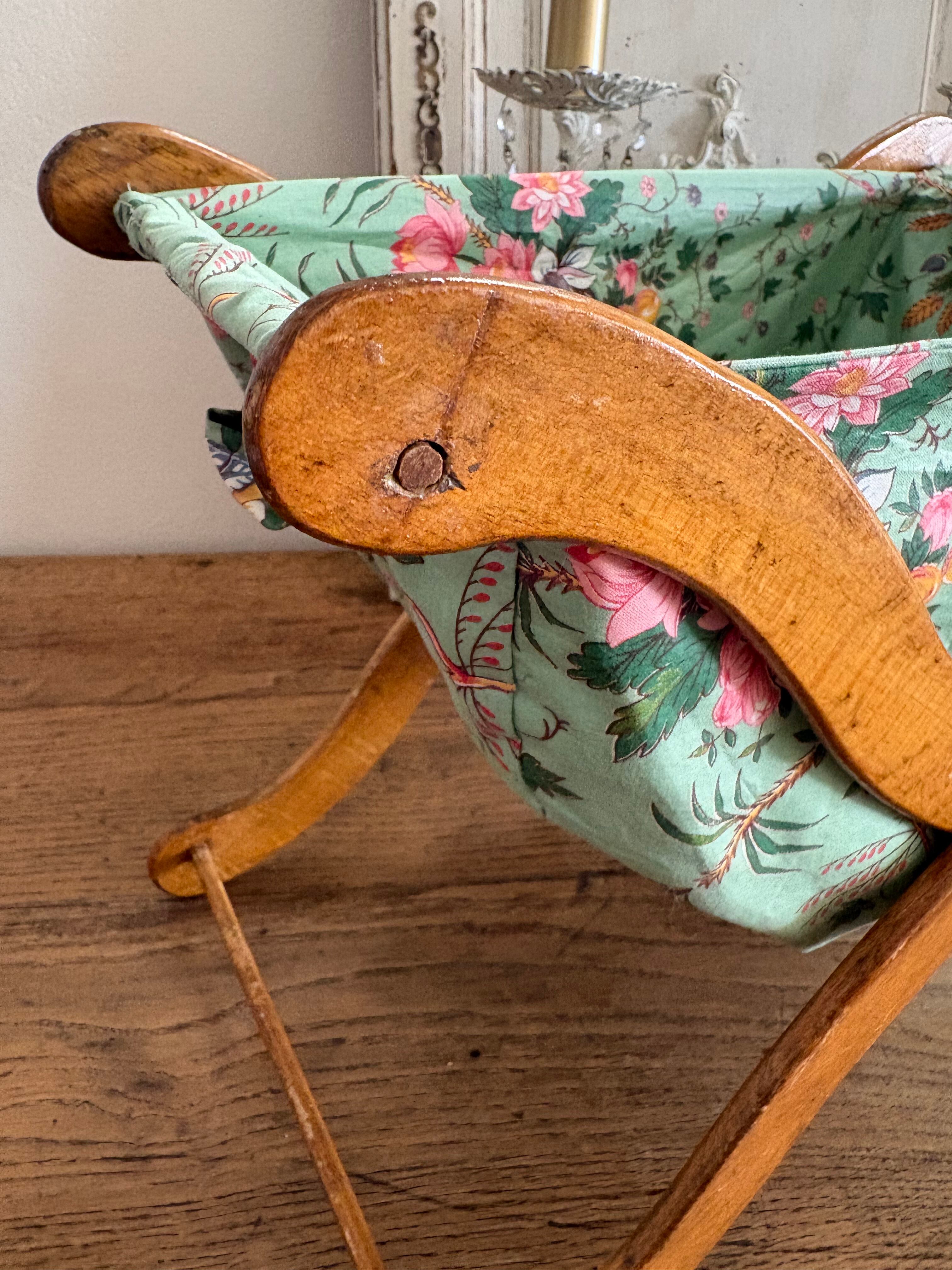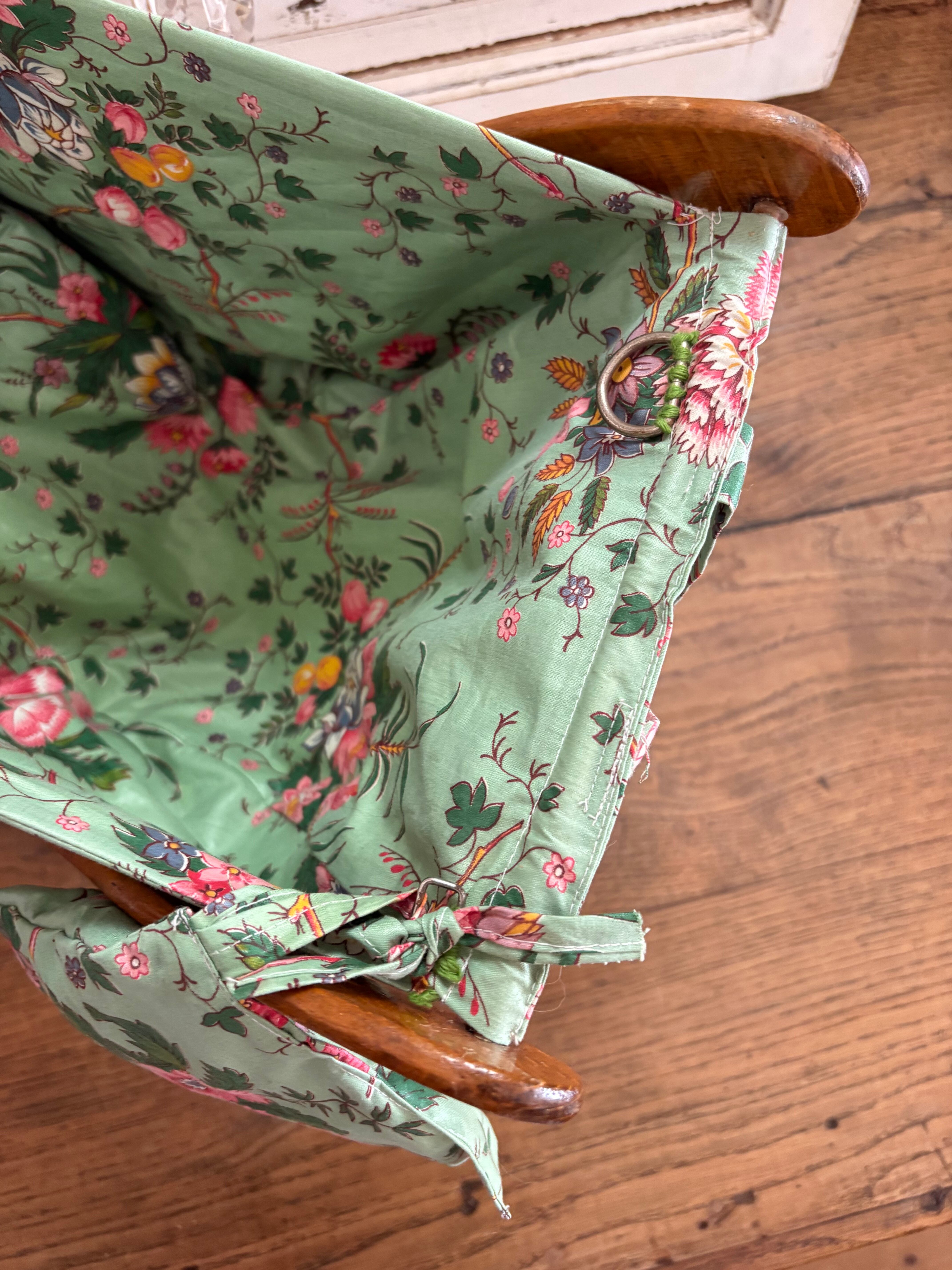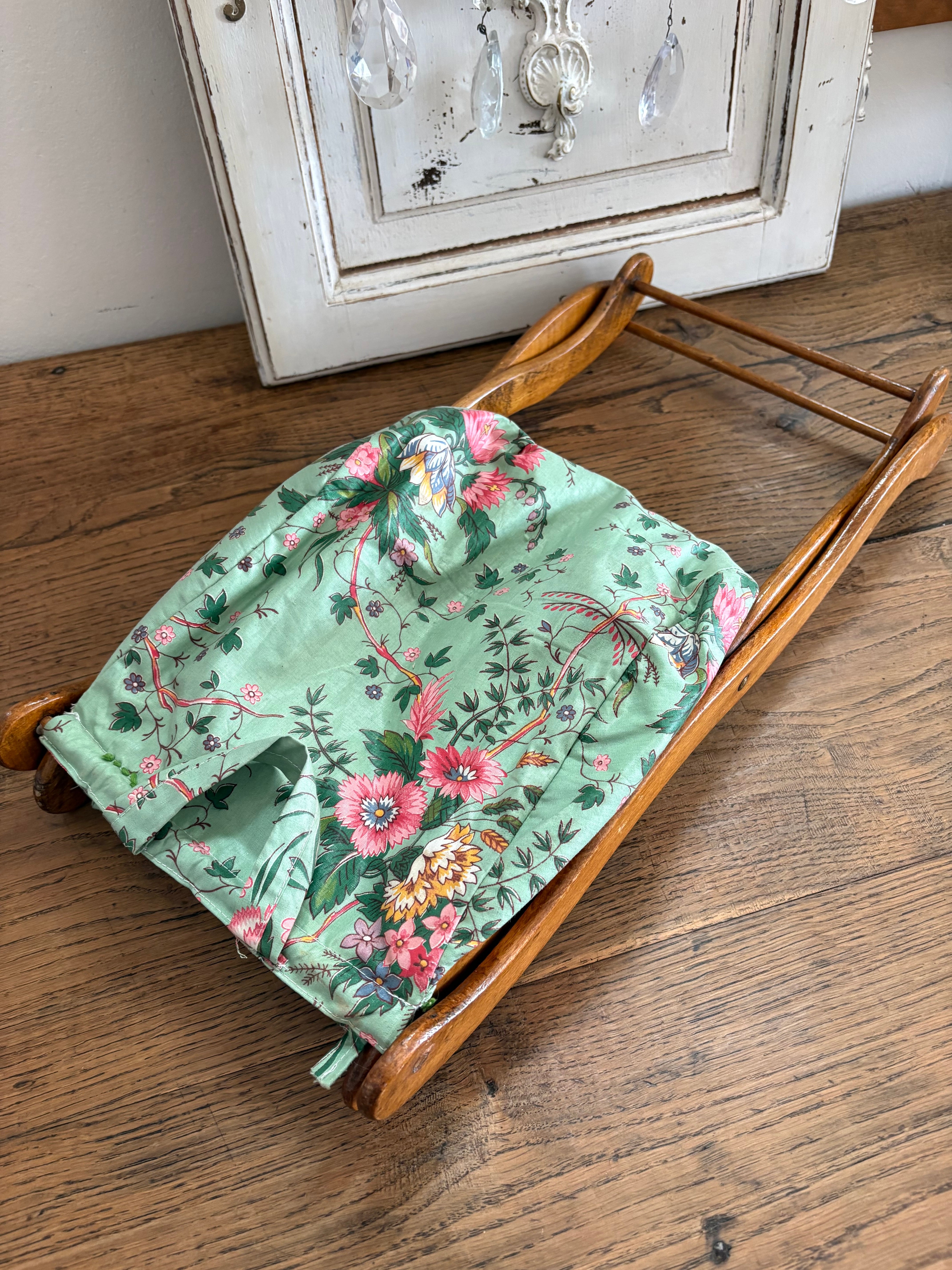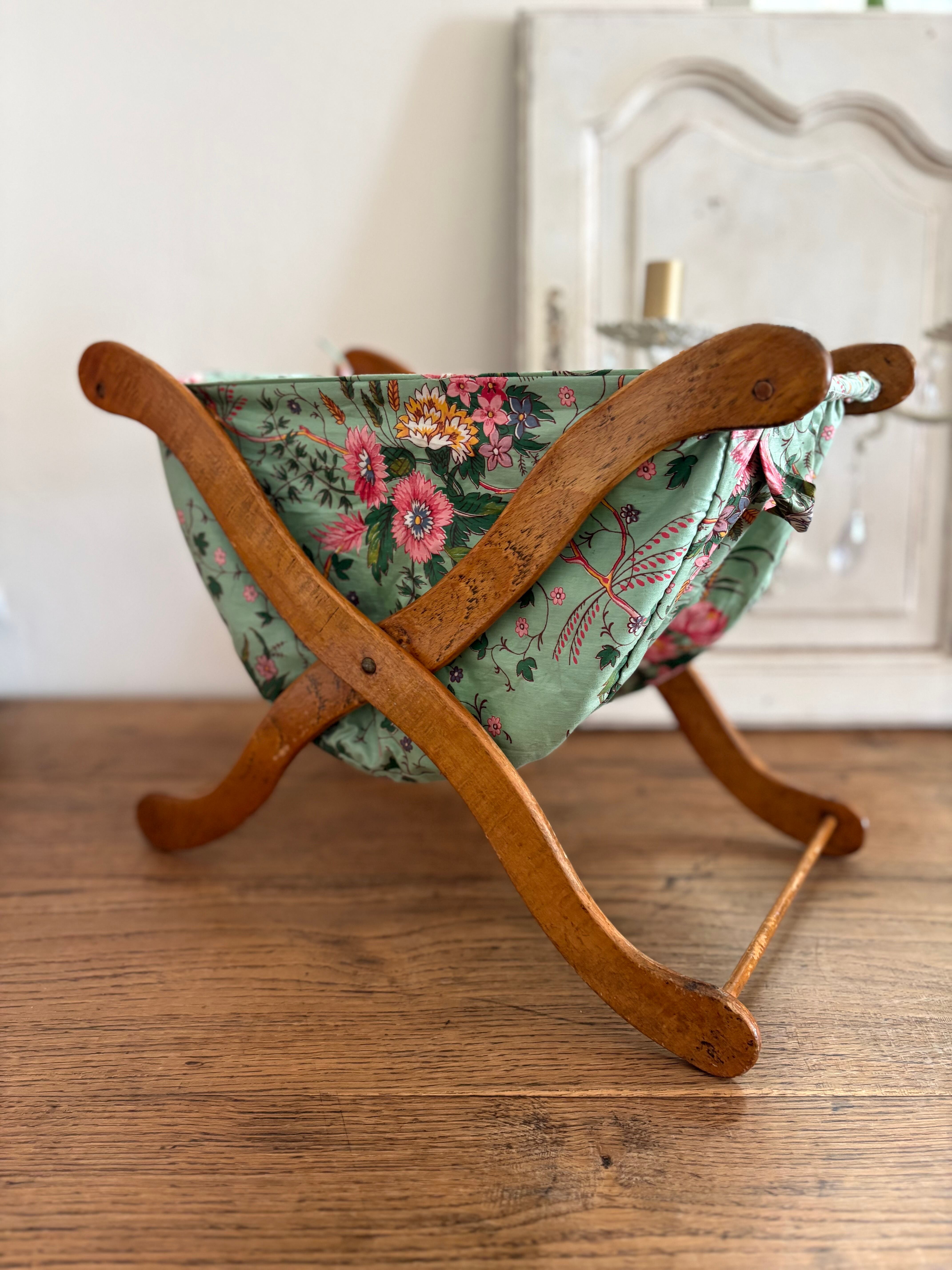 木製の木枠に布が取り付けられたソーイングスタンドになります。毛糸やパッチワークなどここに入れられて制作途中も楽しめる実用性と、ベアや人形など収納されても素敵ですね。