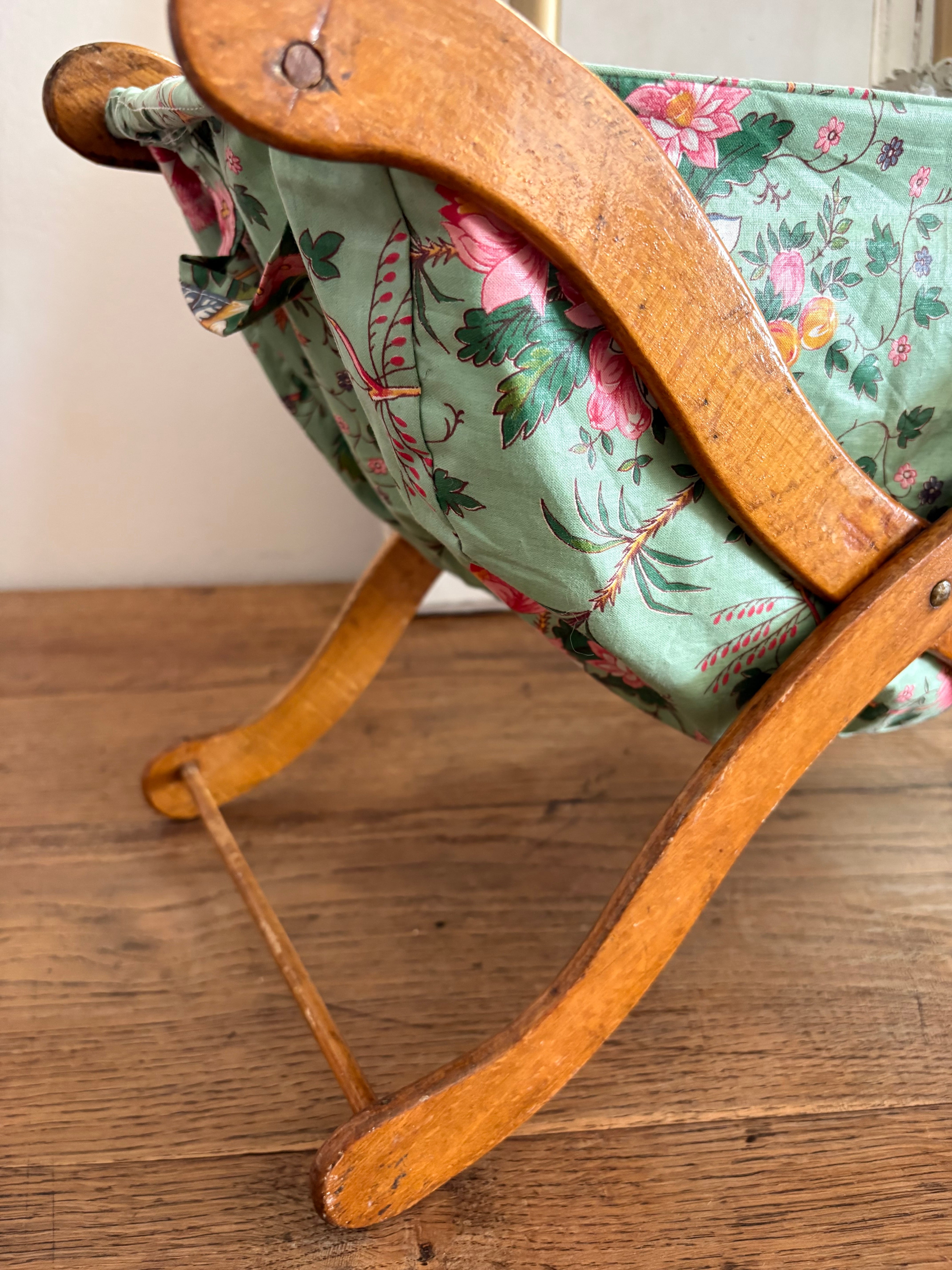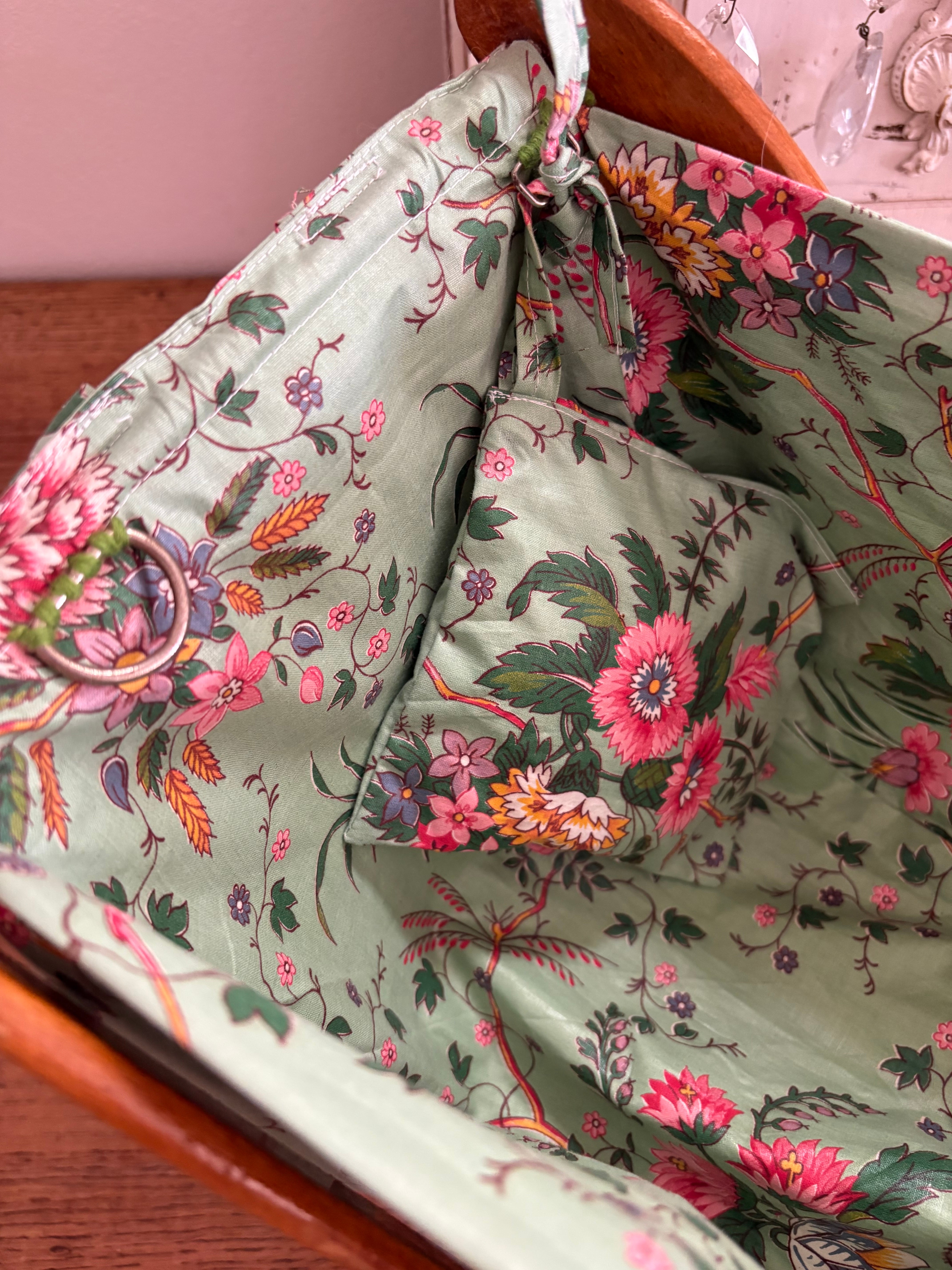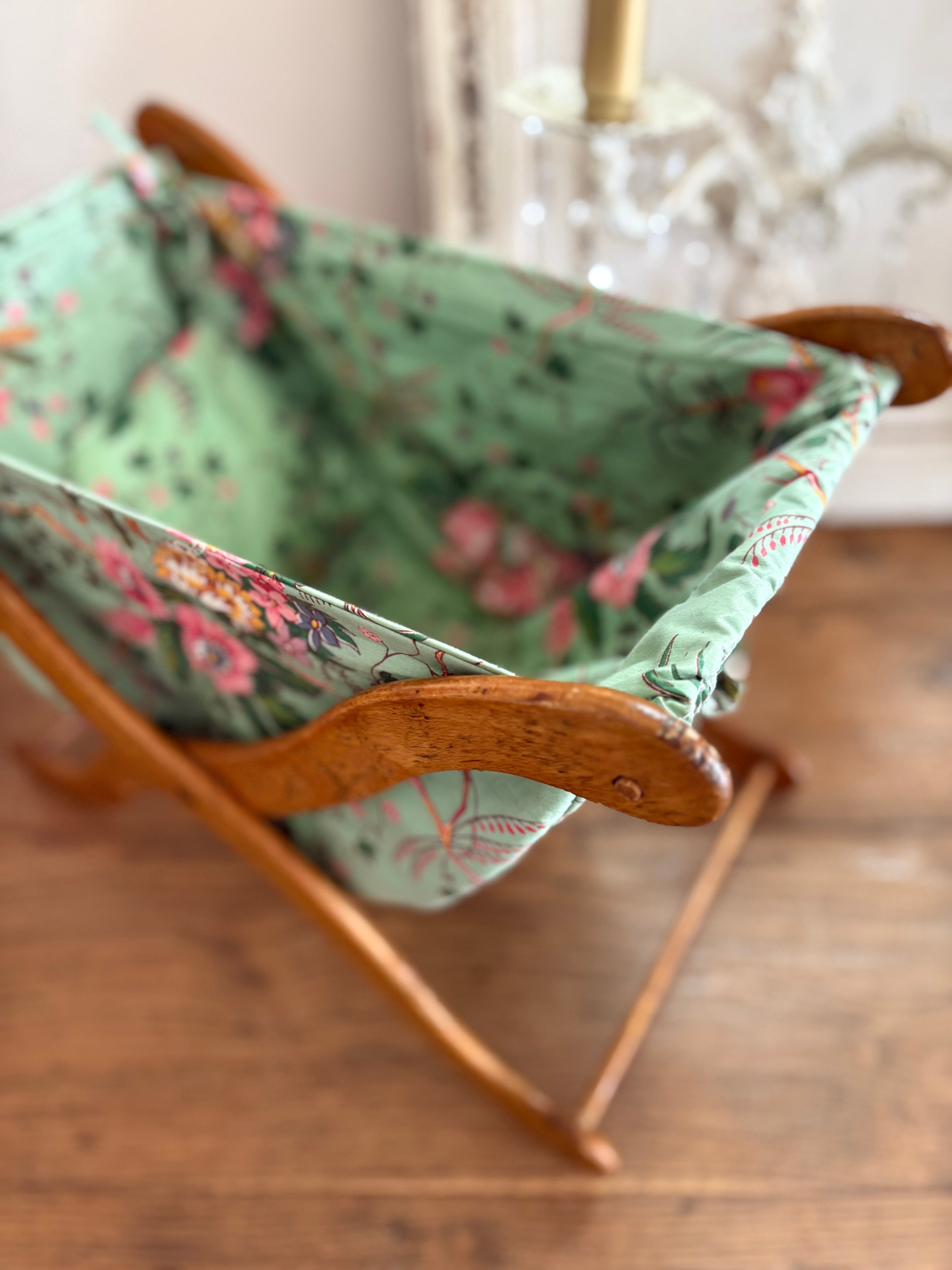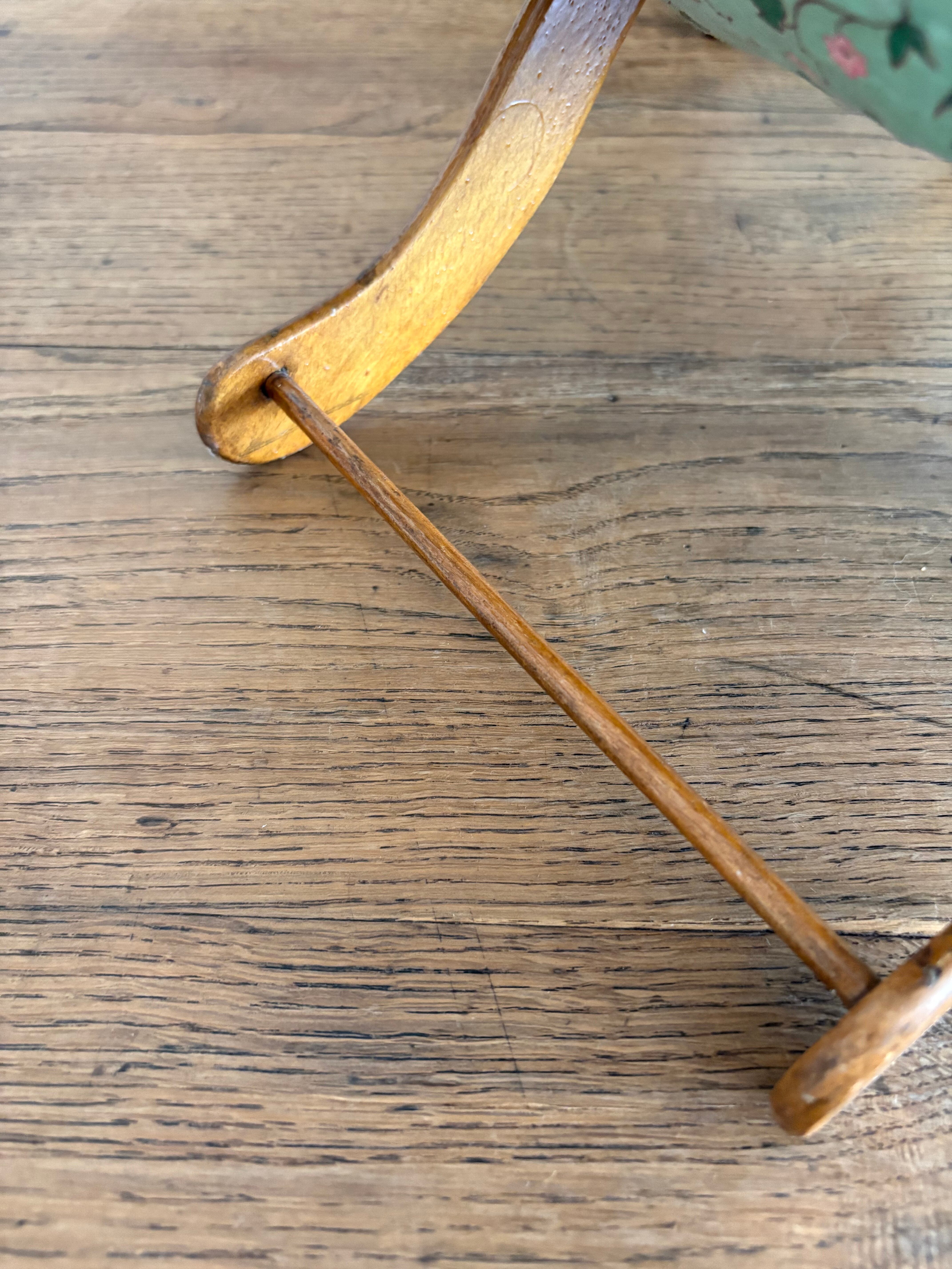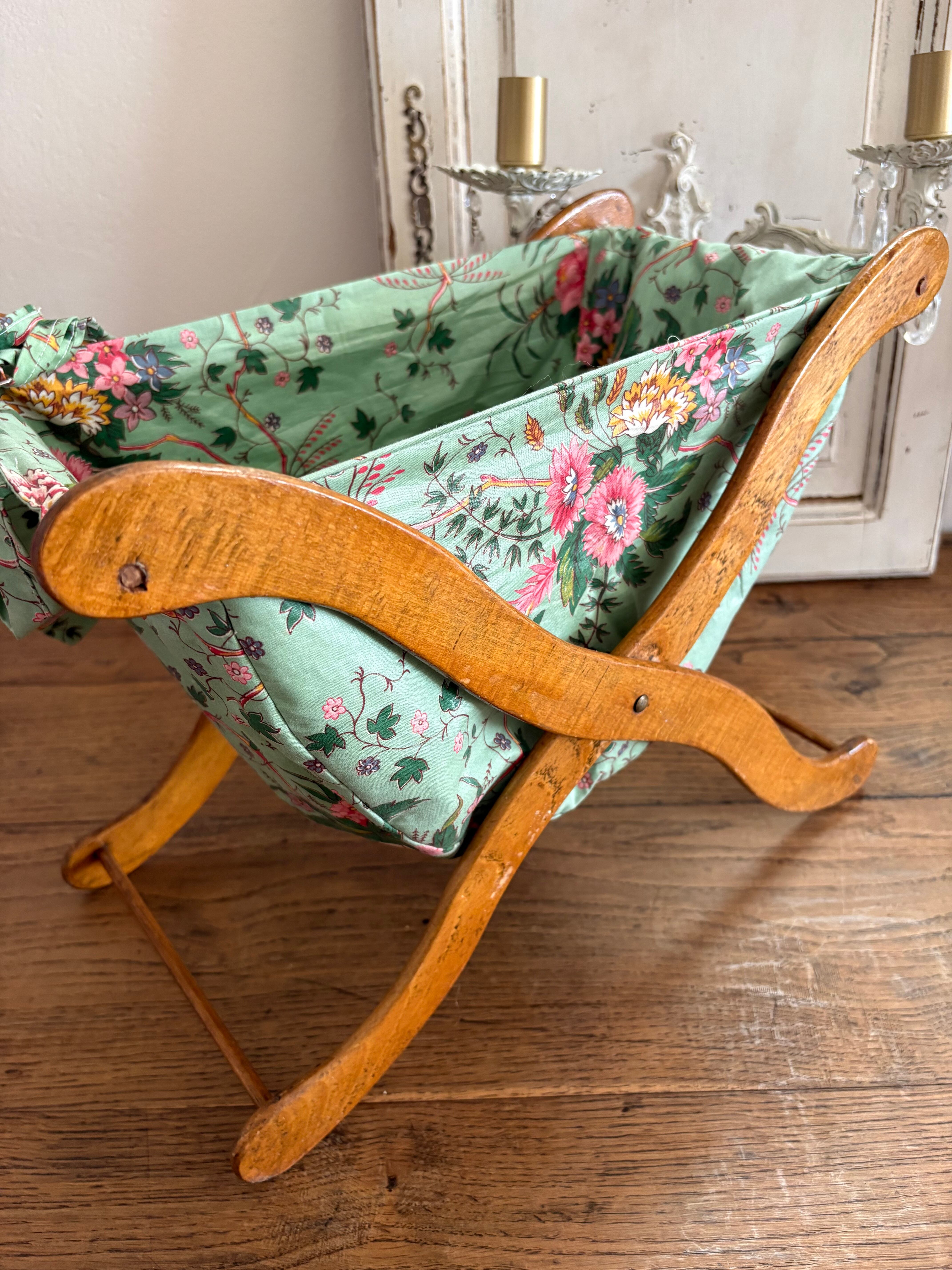 木製の木枠に布が取り付けられたソーイングスタンドになります。毛糸やパッチワークなどここに入れられて制作途中も楽しめる実用性と、ベアや人形など収納されても素敵ですね。