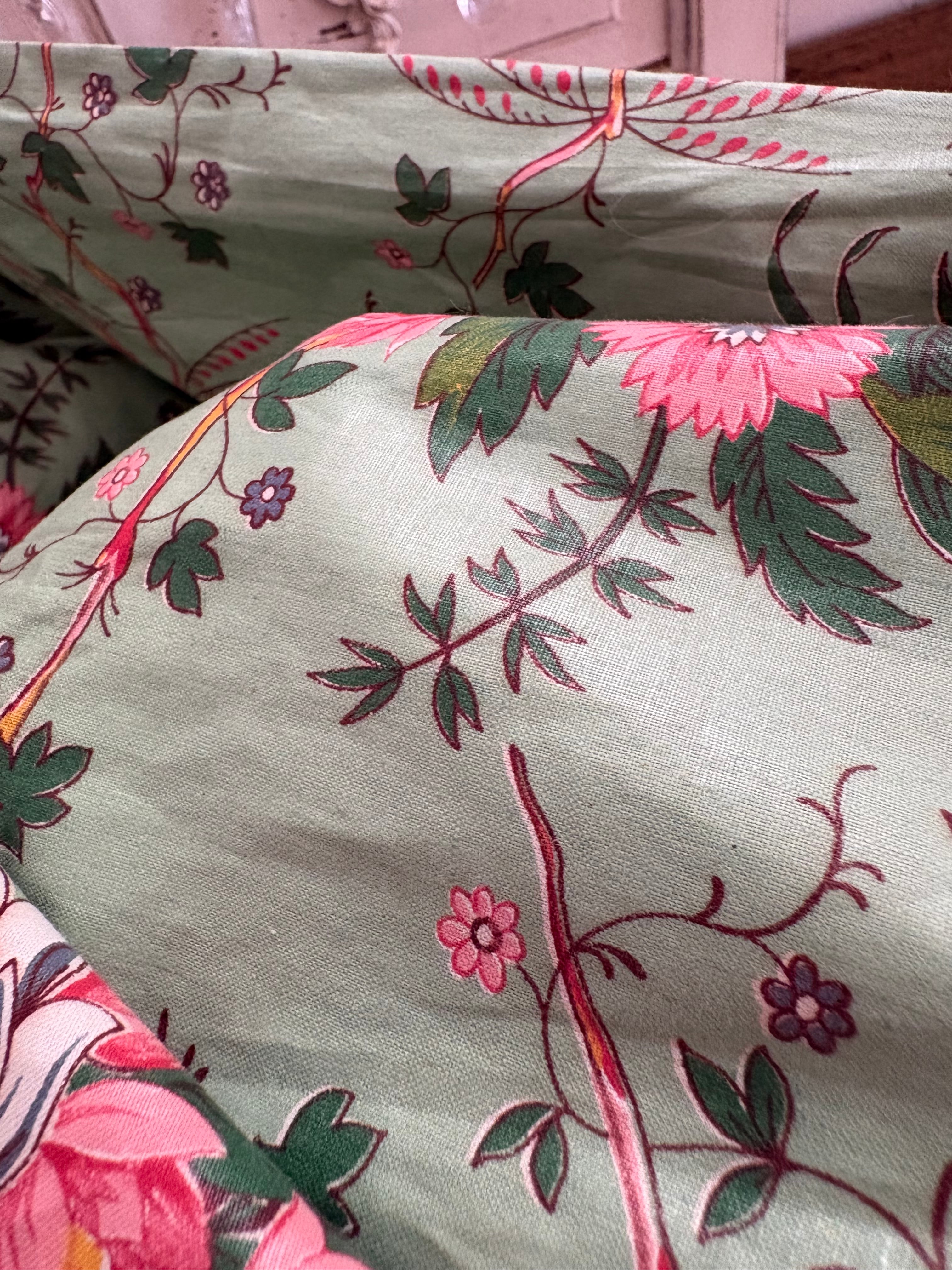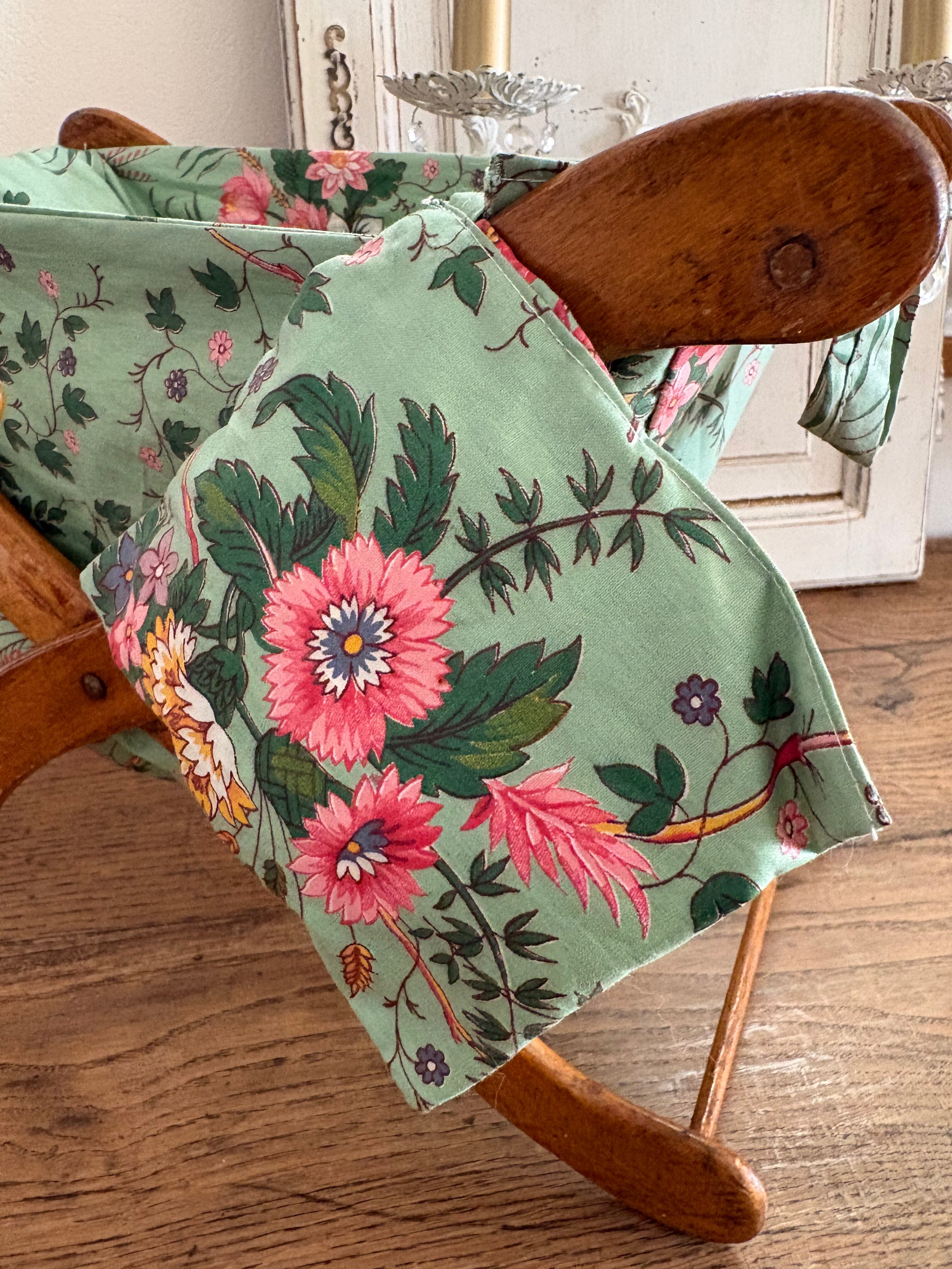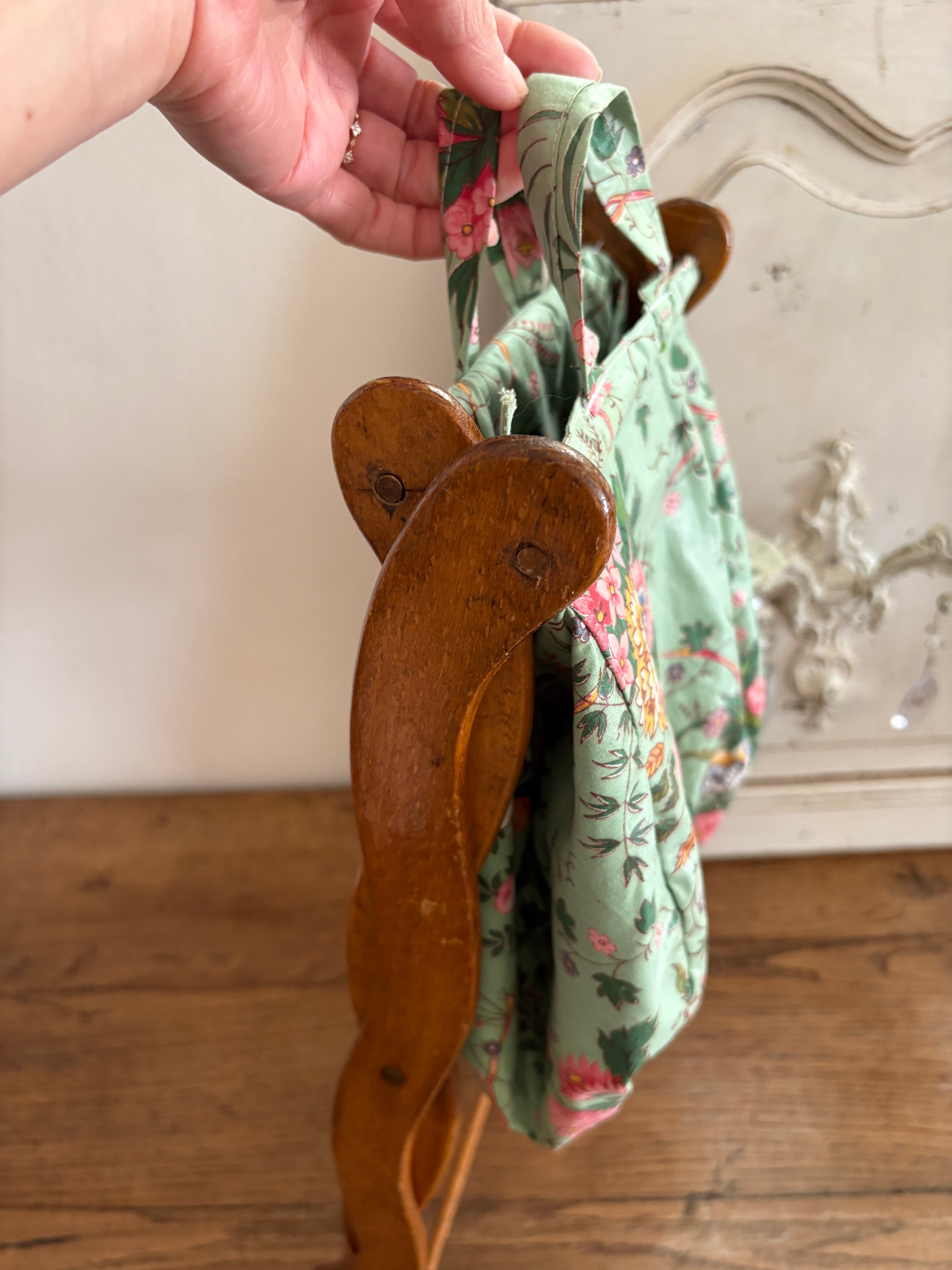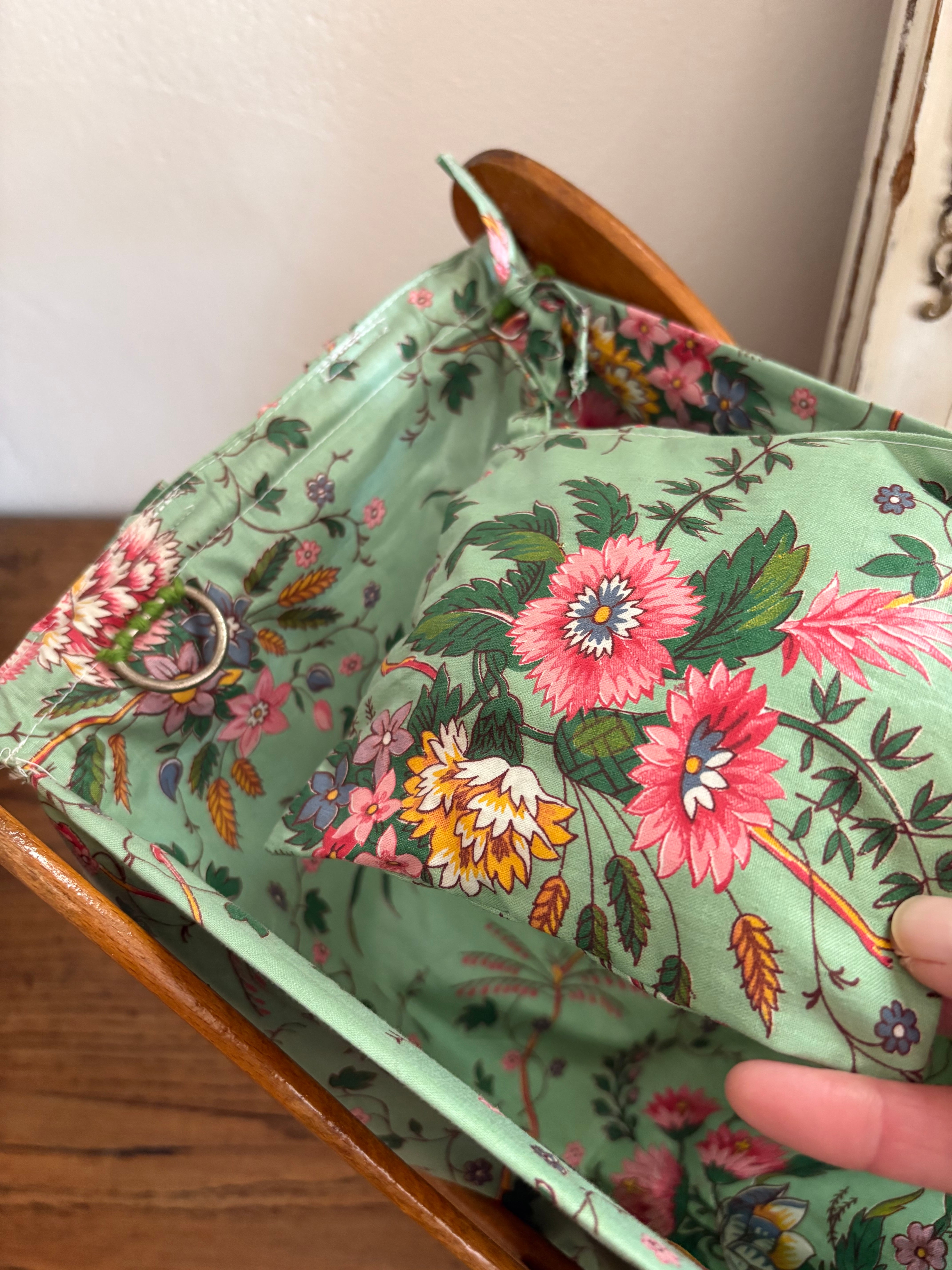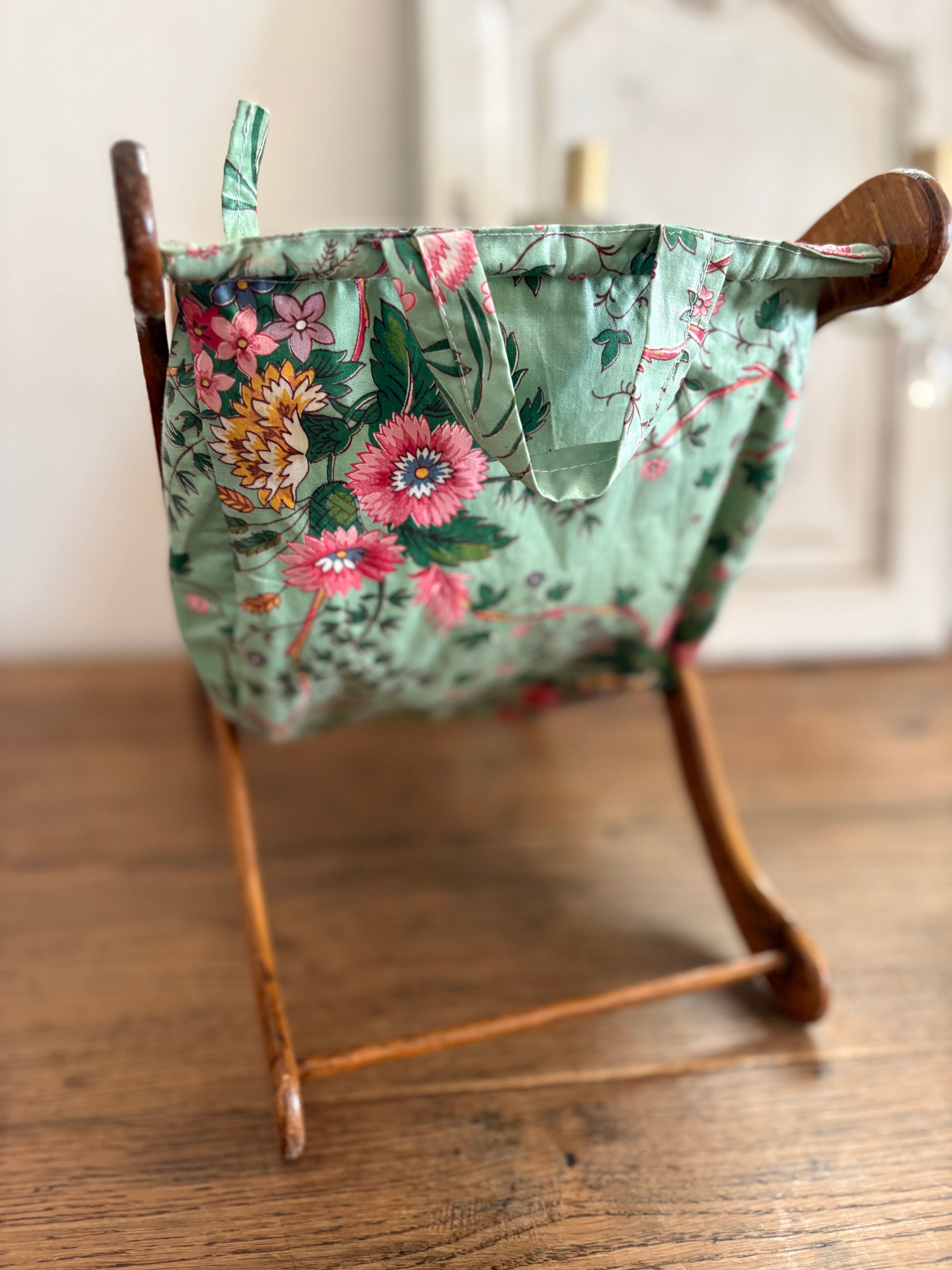 木製の木枠に布が取り付けられたソーイングスタンドになります。毛糸やパッチワークなどここに入れられて制作途中も楽しめる実用性と、ベアや人形など収納されても素敵ですね。