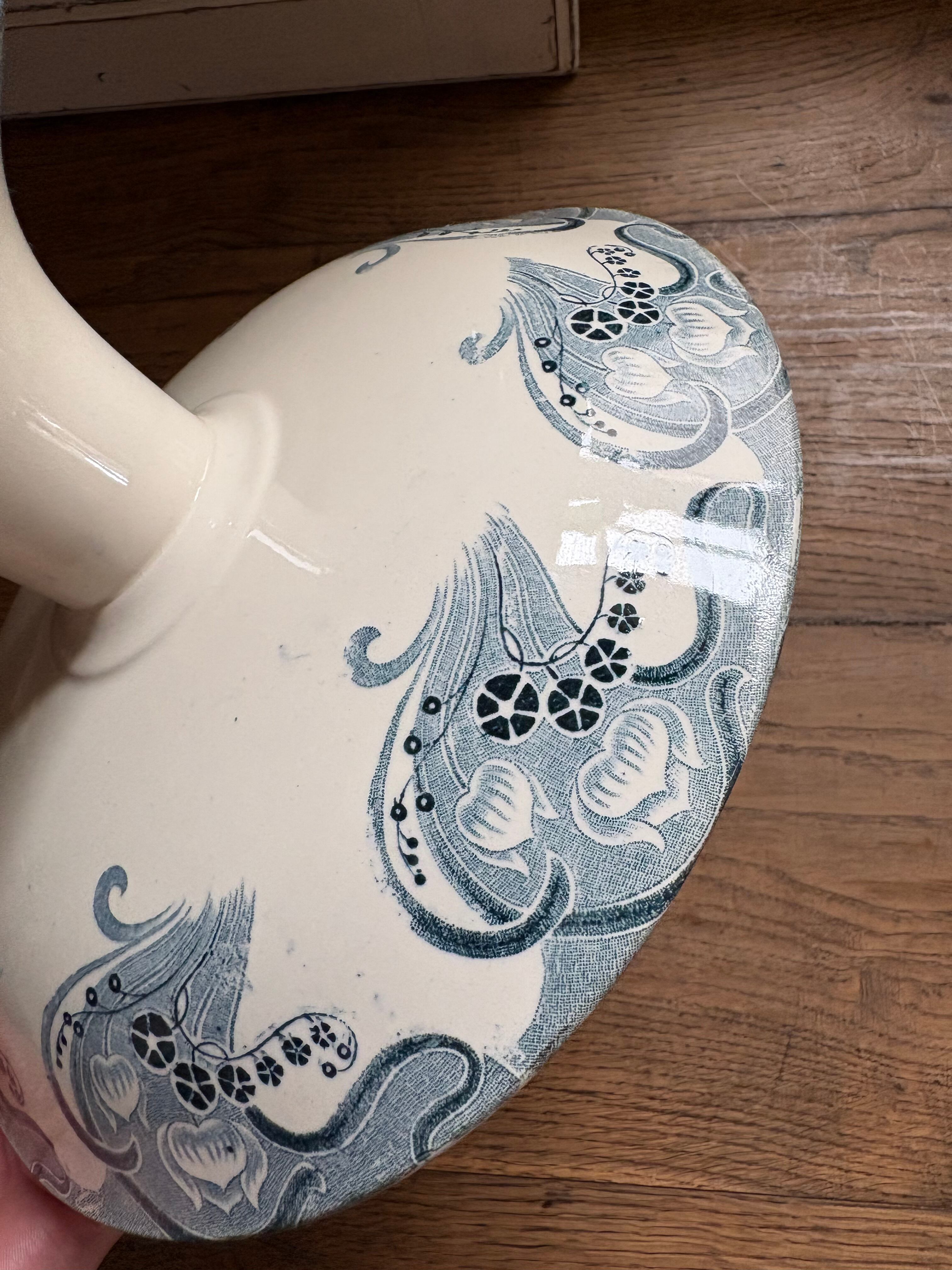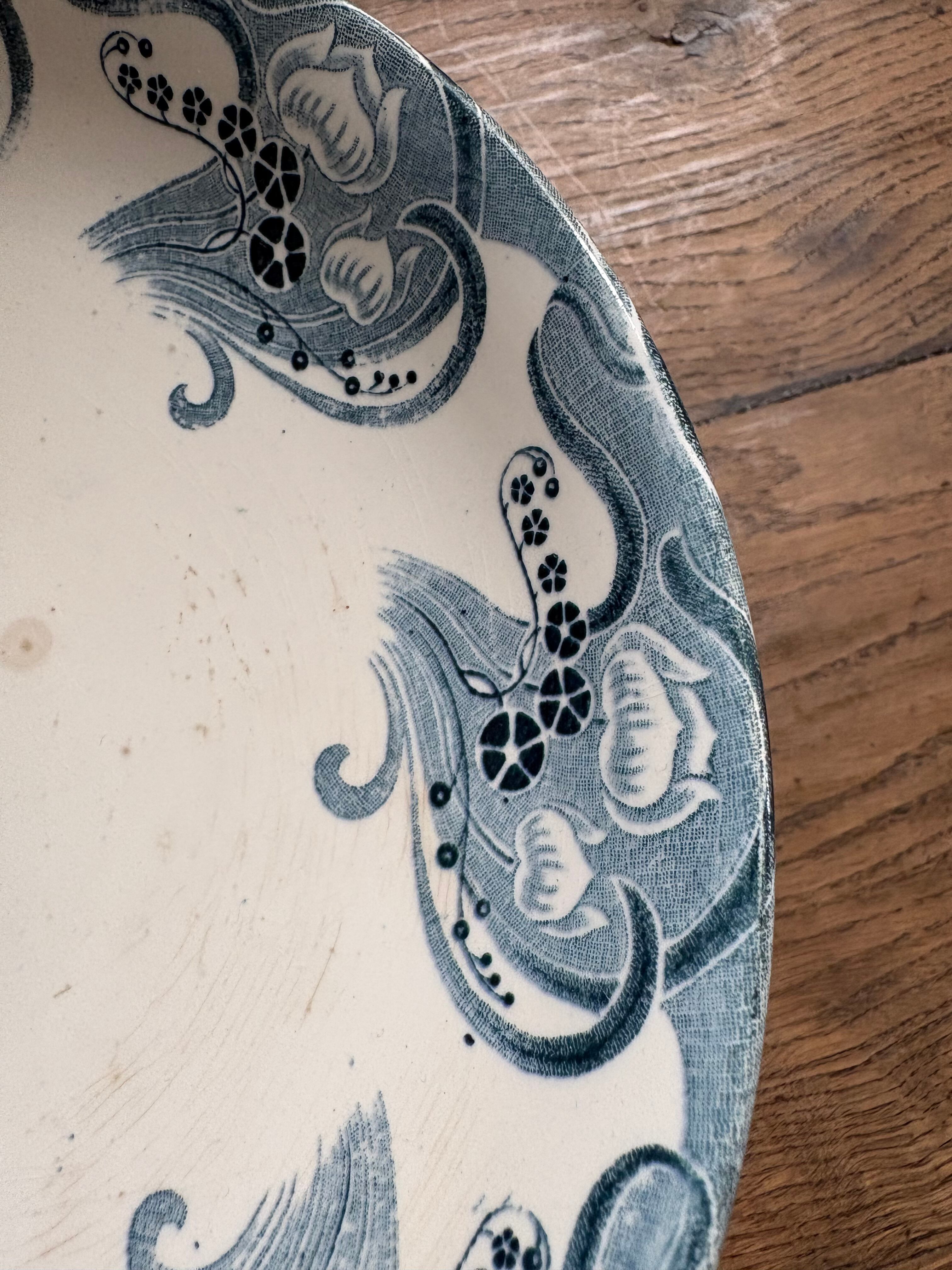 クリームベースに濃淡のあるグリーンでお花と揺れのある装飾デザインがフランスらしさを感じる器となっております。