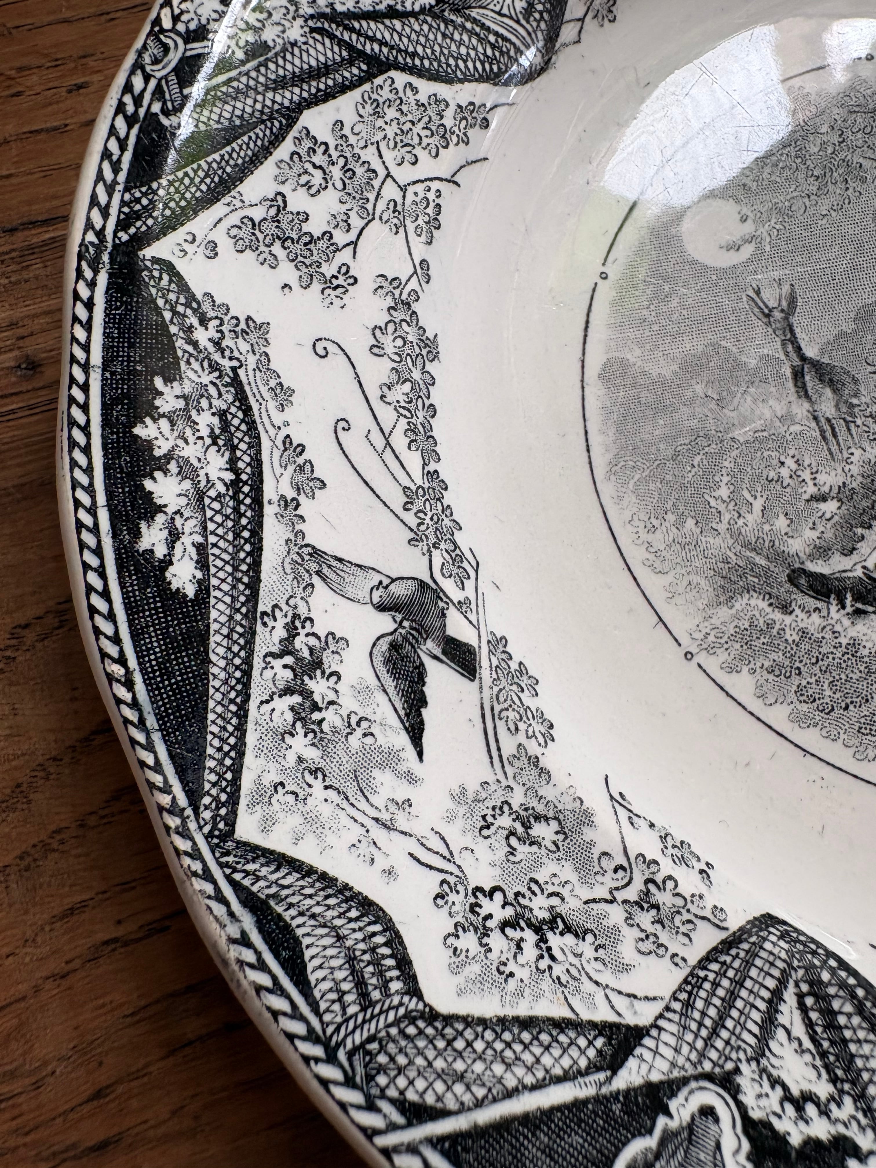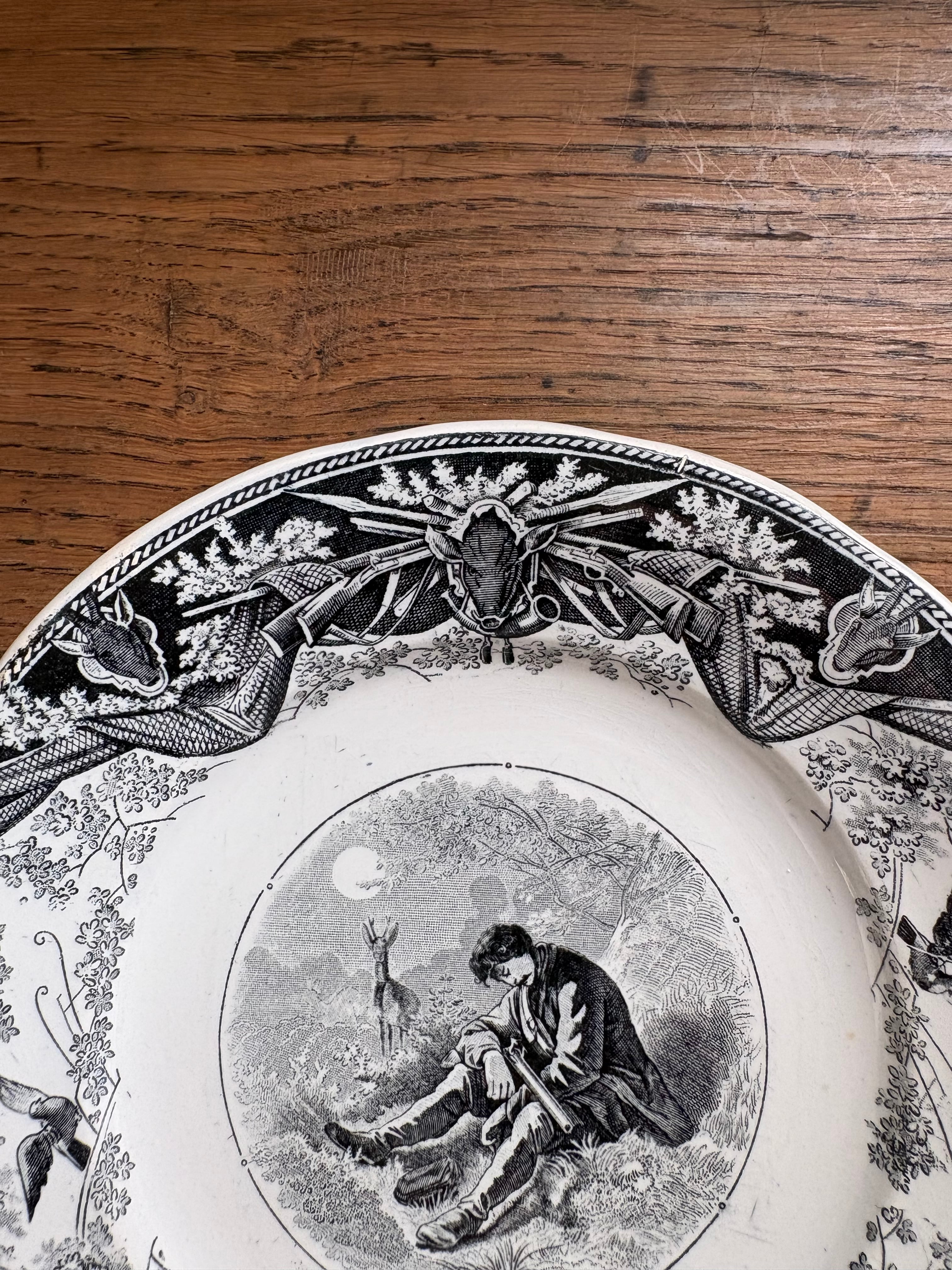 緩やかな花リムの形状に狩猟に使う槍や銃、狩猟がテーマのマンスリープレート。木々には鳩が止まる姿、獲物の鹿が現れてますが疲れ果ててしまったのでしょうか……