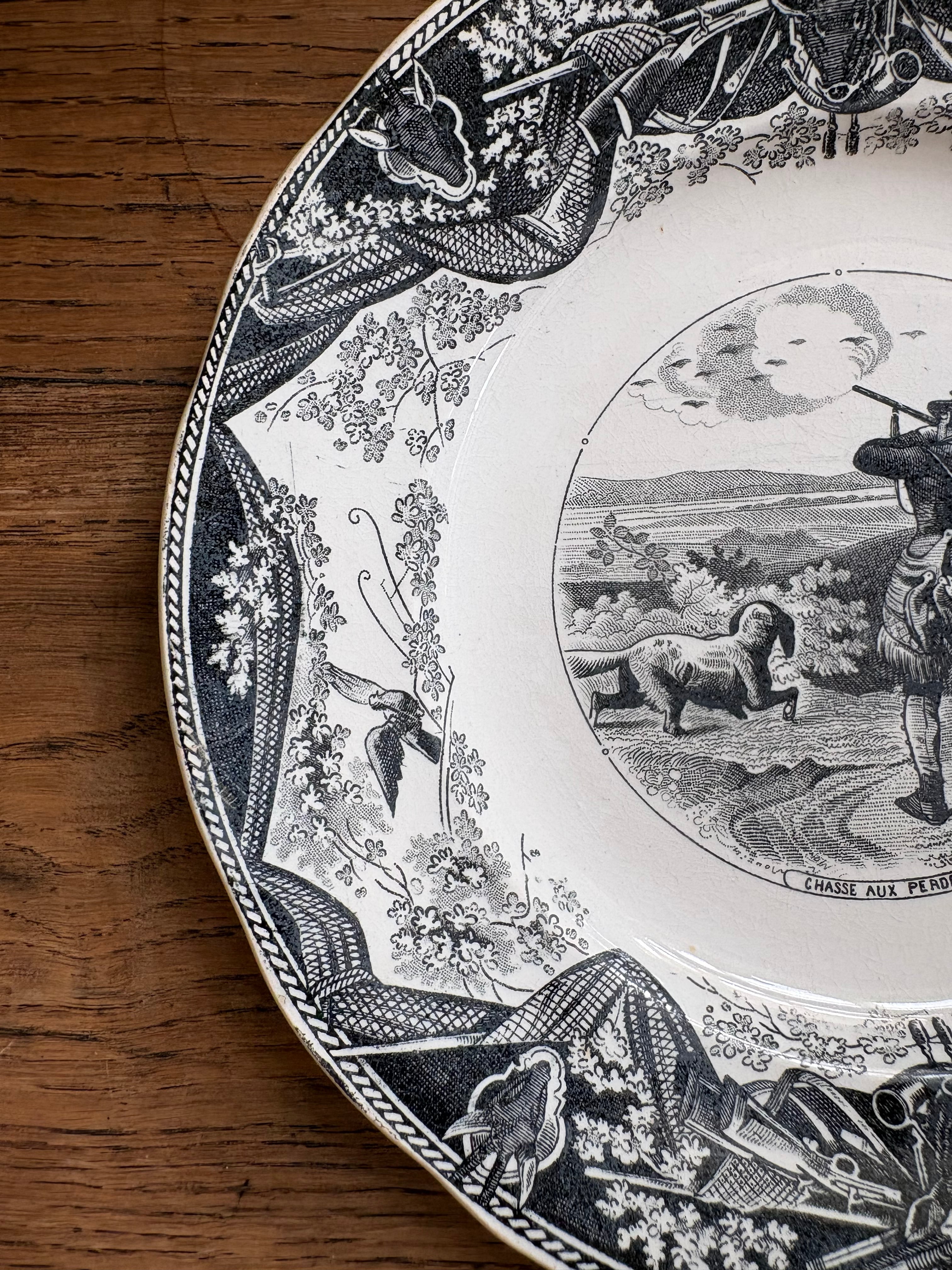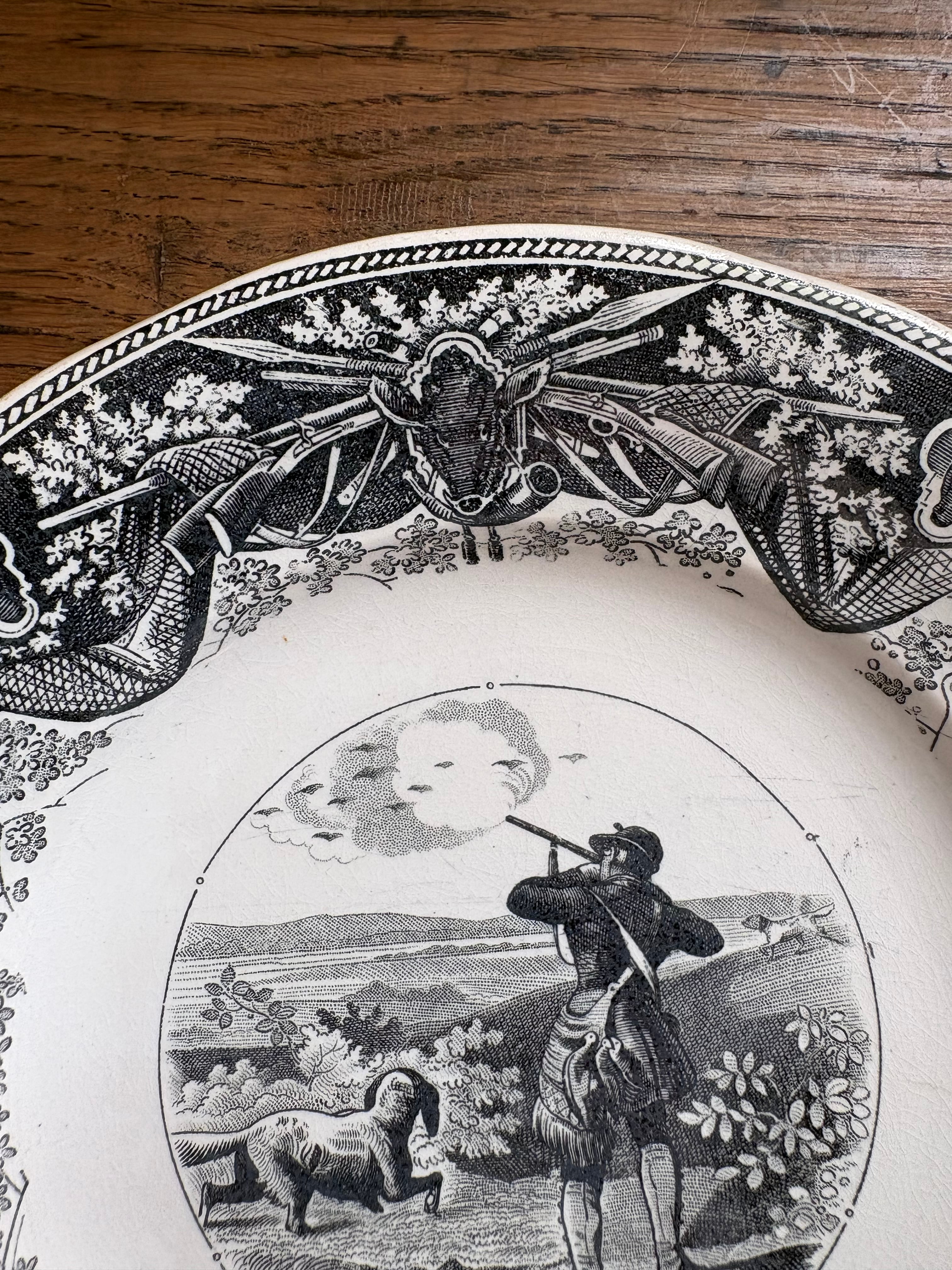 緩やかな花リムの形状に狩猟に使う槍や銃、狩猟がテーマのマンスリープレート。木々には鳩が止まる姿、こちらはヤマウズラを狩るイラストとなっております。猟犬と共に凛々しい姿となっております。
