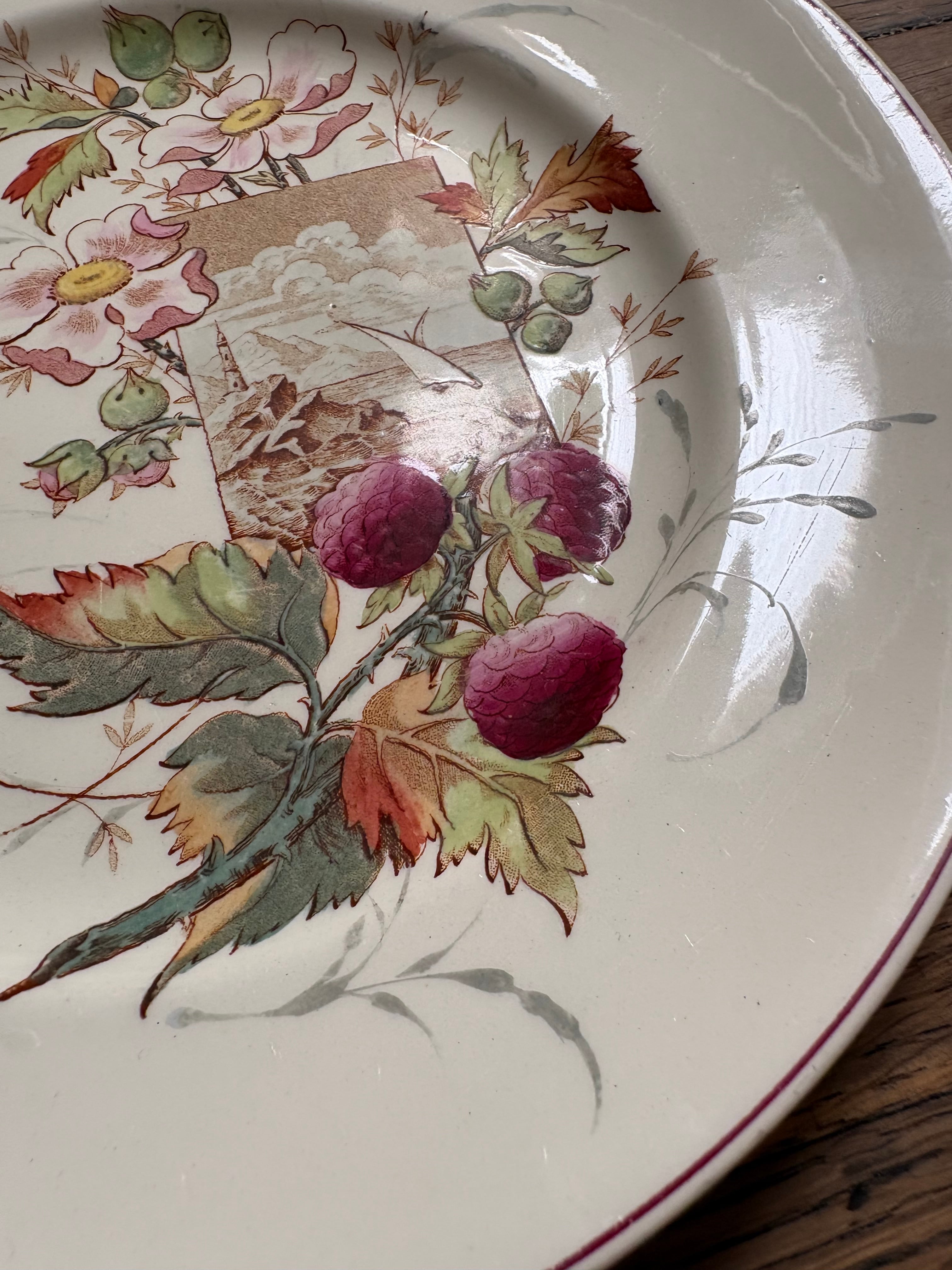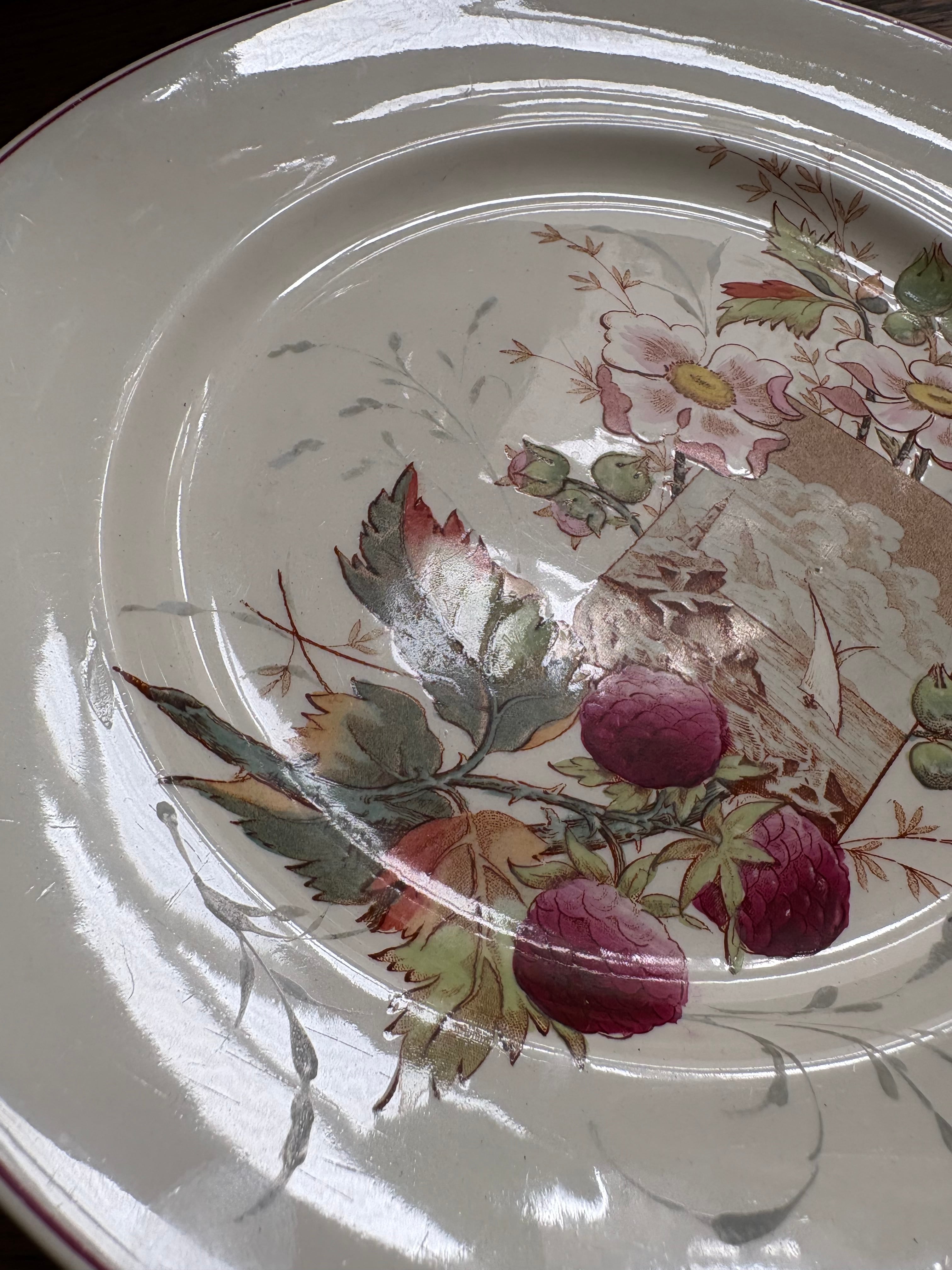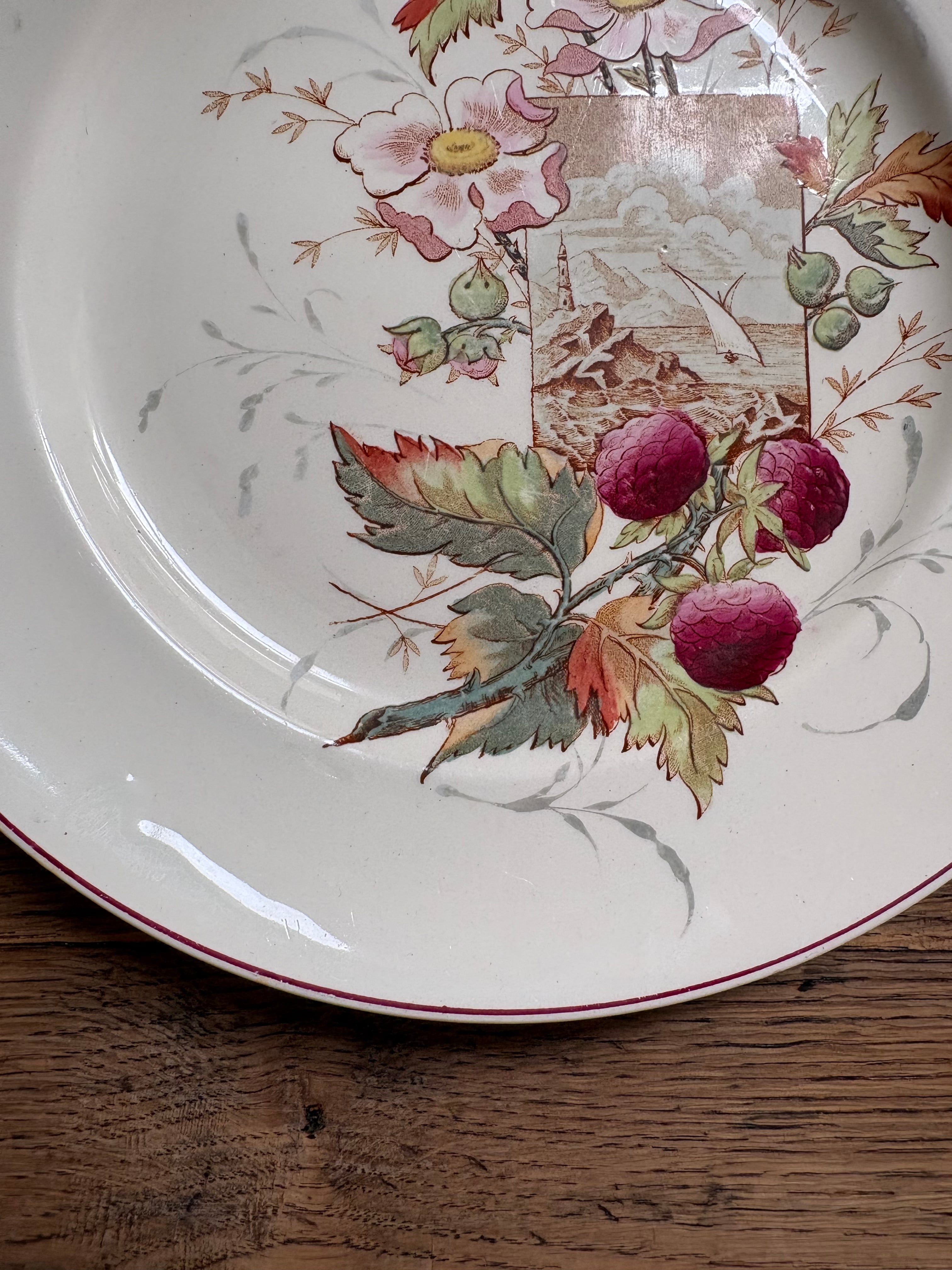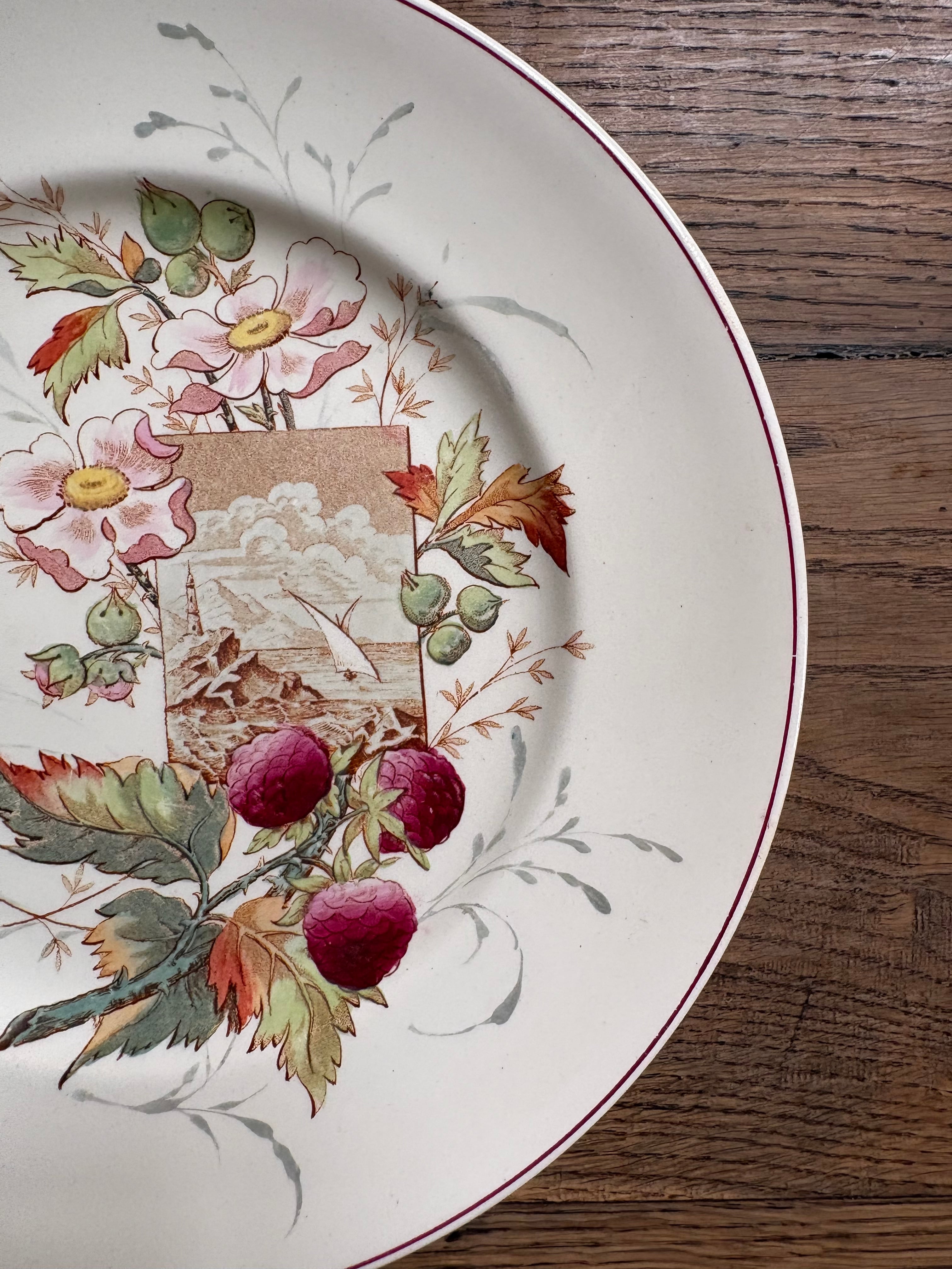 ラズベリー、野薔薇と共に海辺のワンシーンが添えられたプレート、ポリクロームの絵付けされた美しい器となっております。