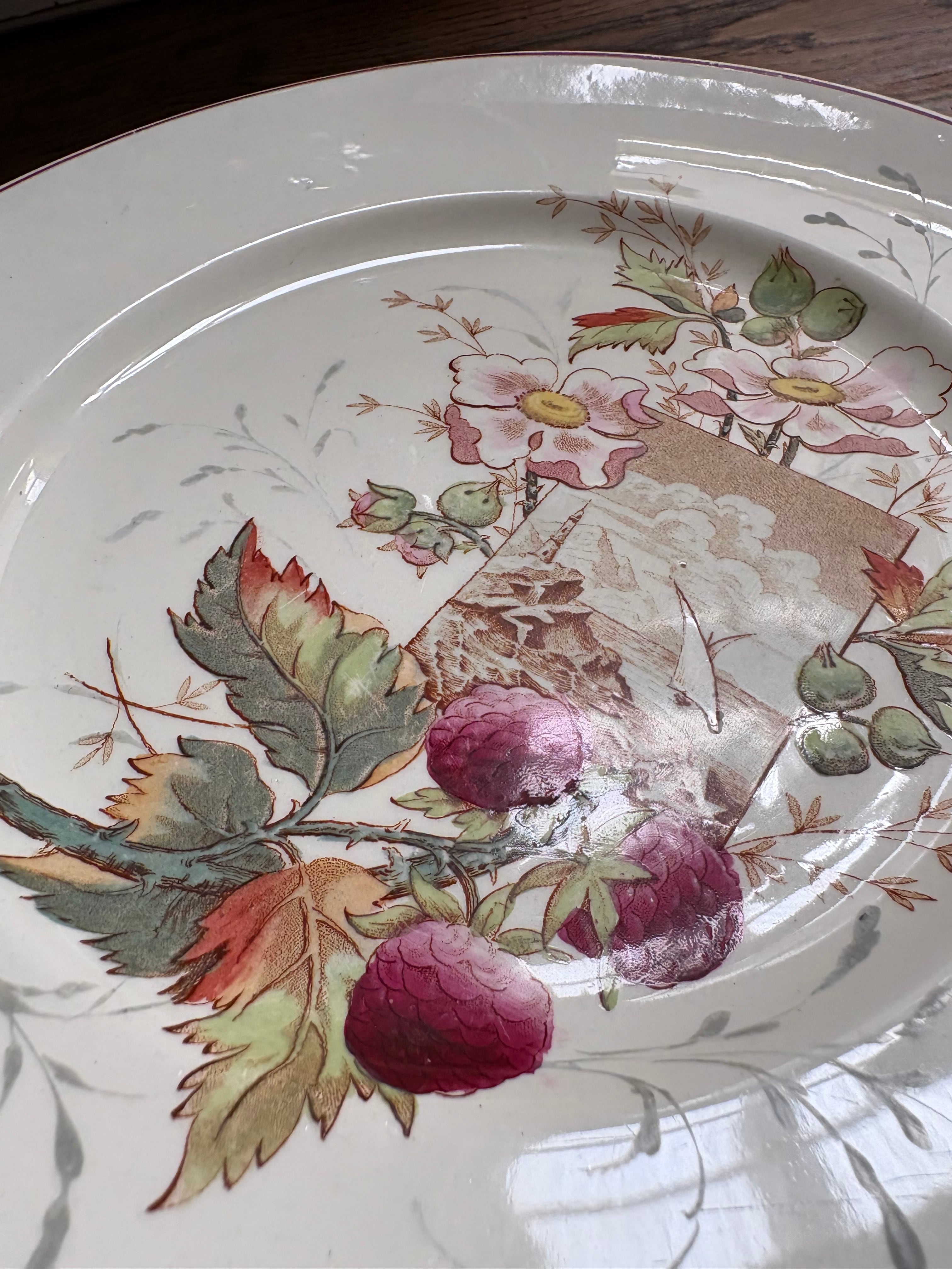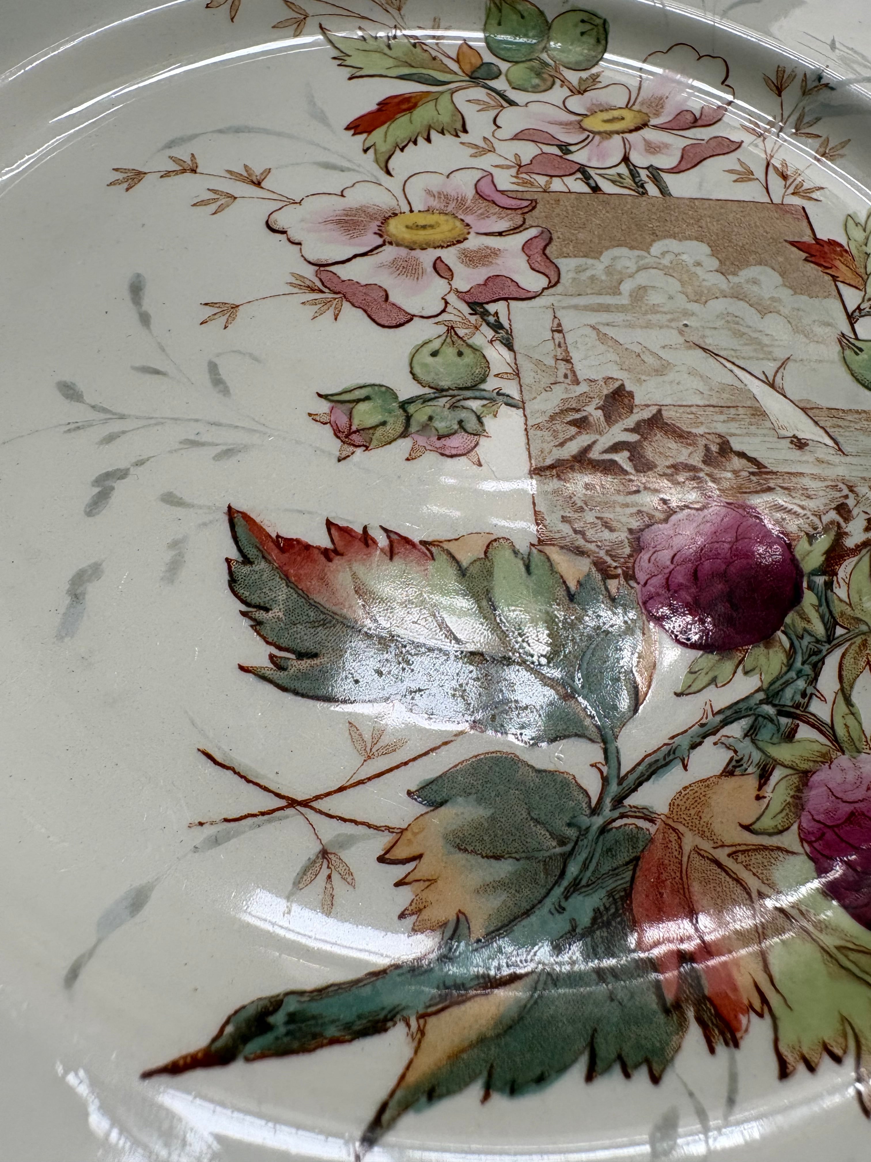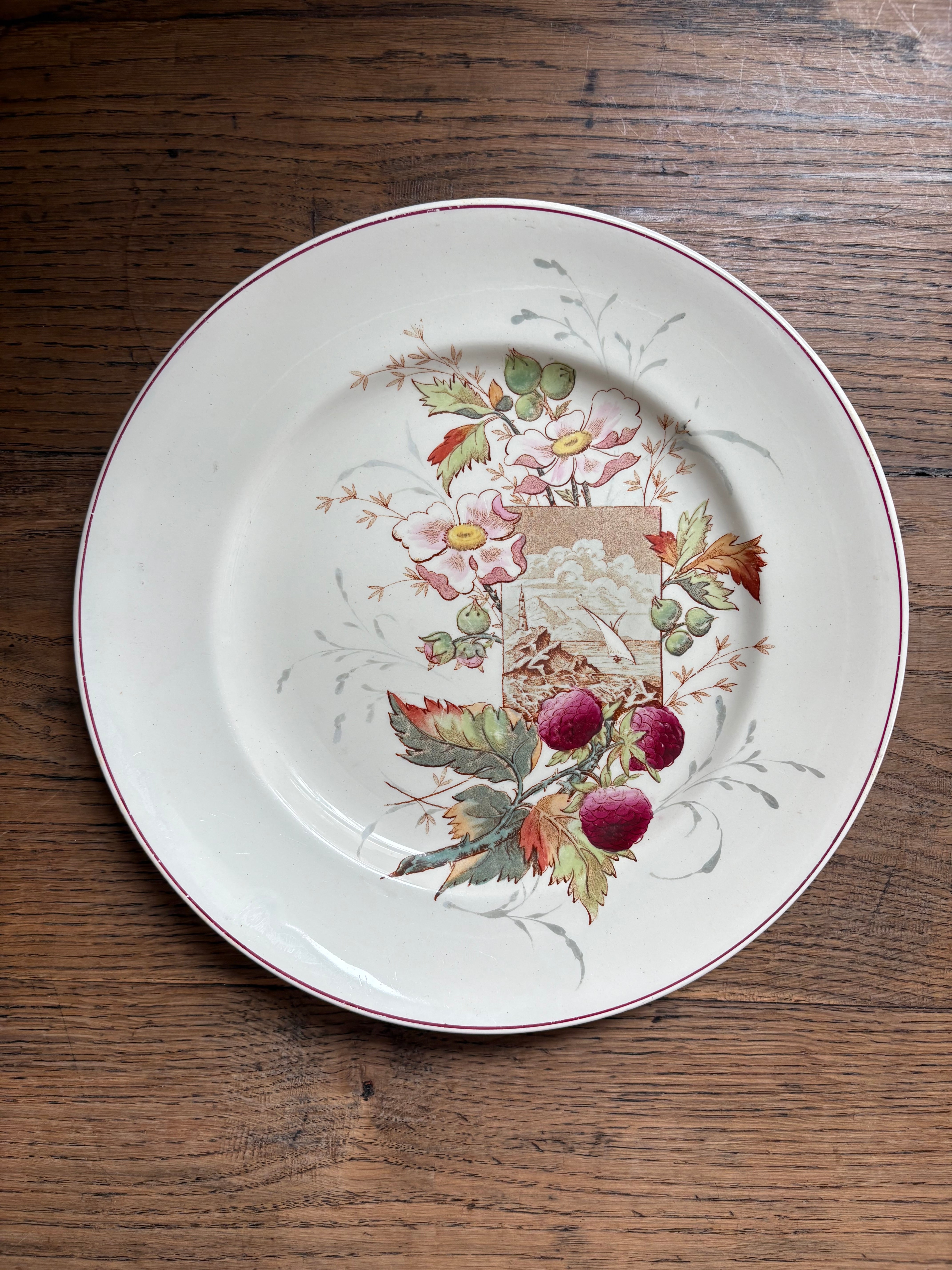 ラズベリー、野薔薇と共に海辺のワンシーンが添えられたプレート、ポリクロームの絵付けされた美しい器となっております。