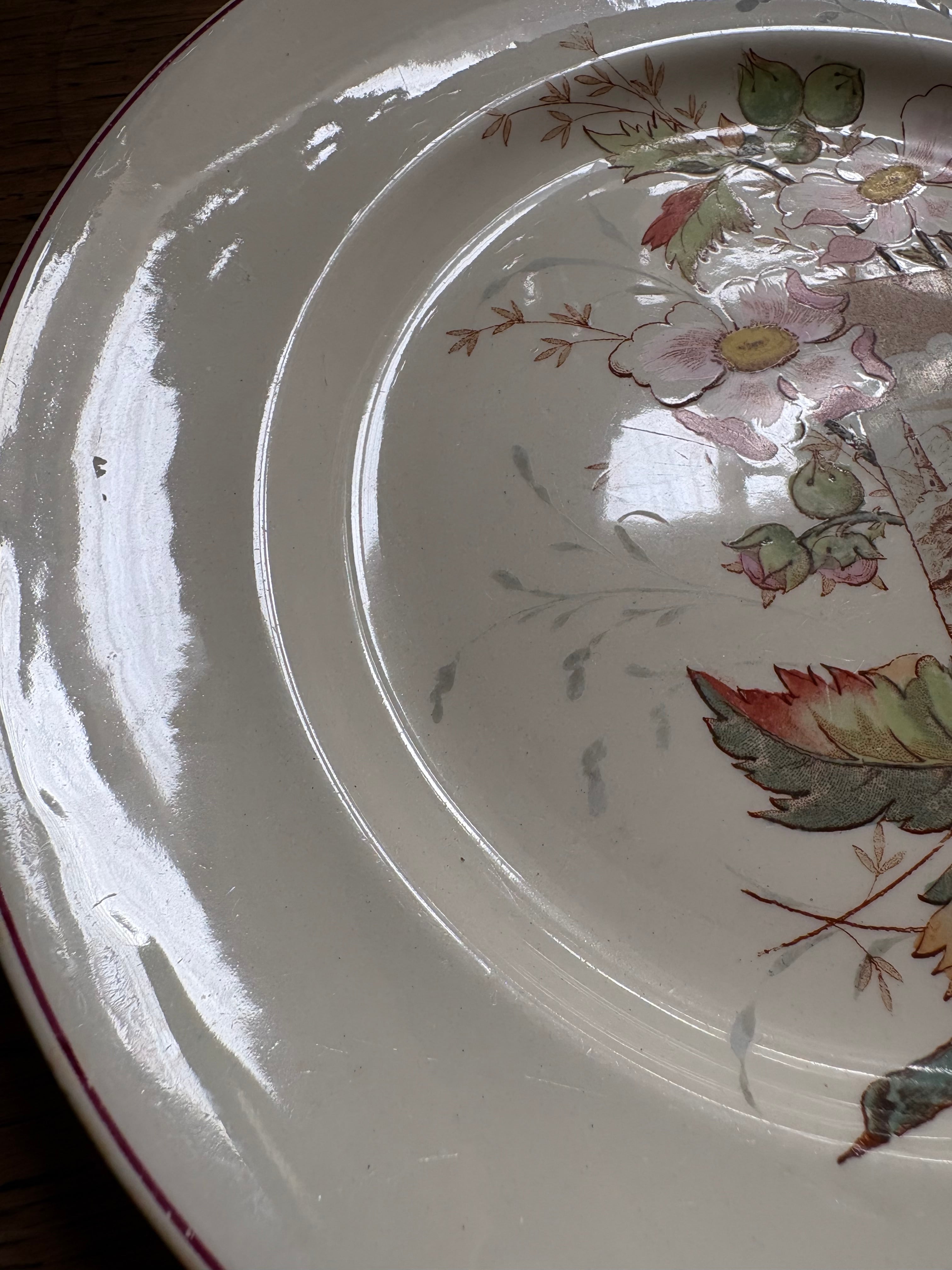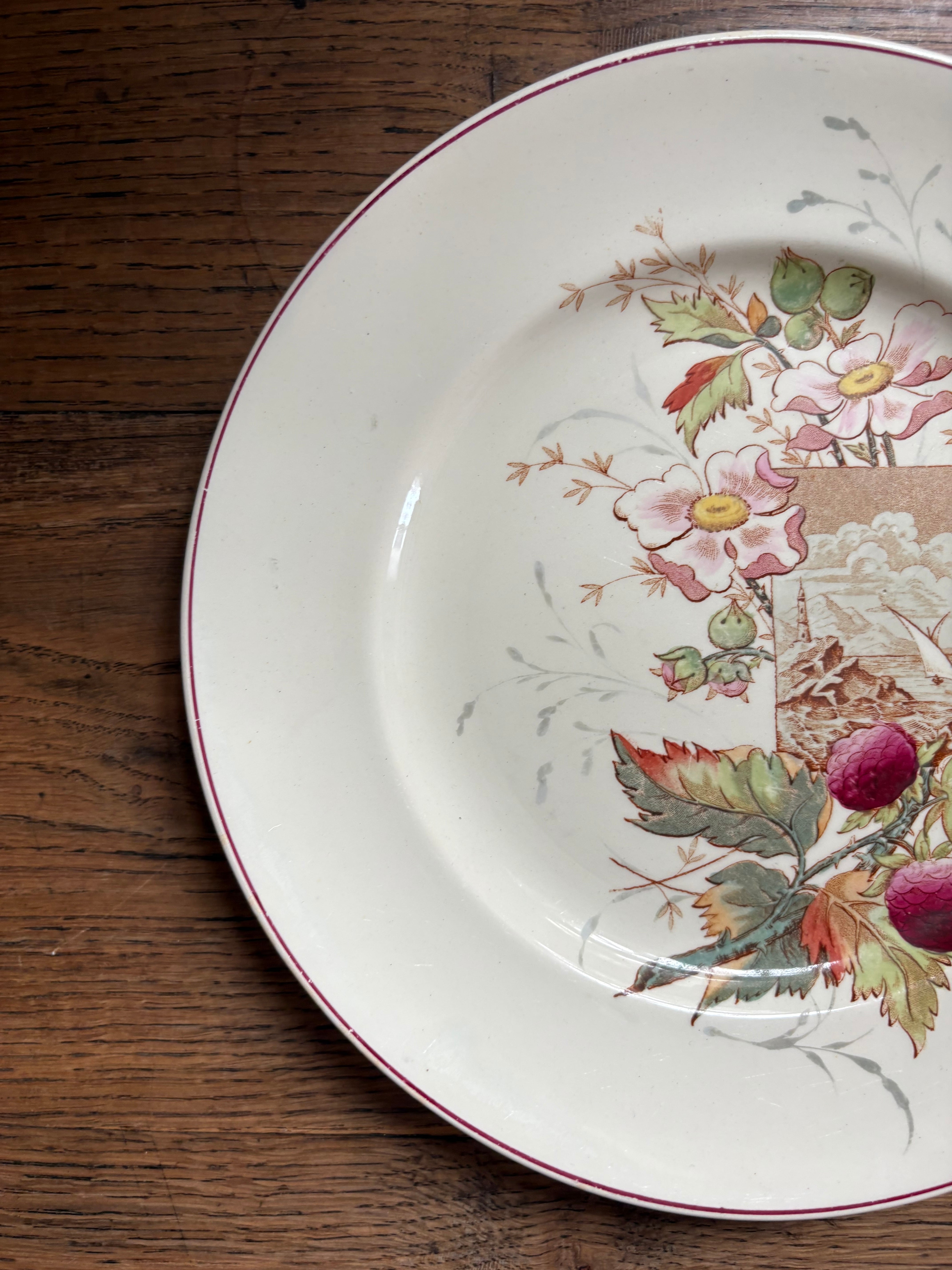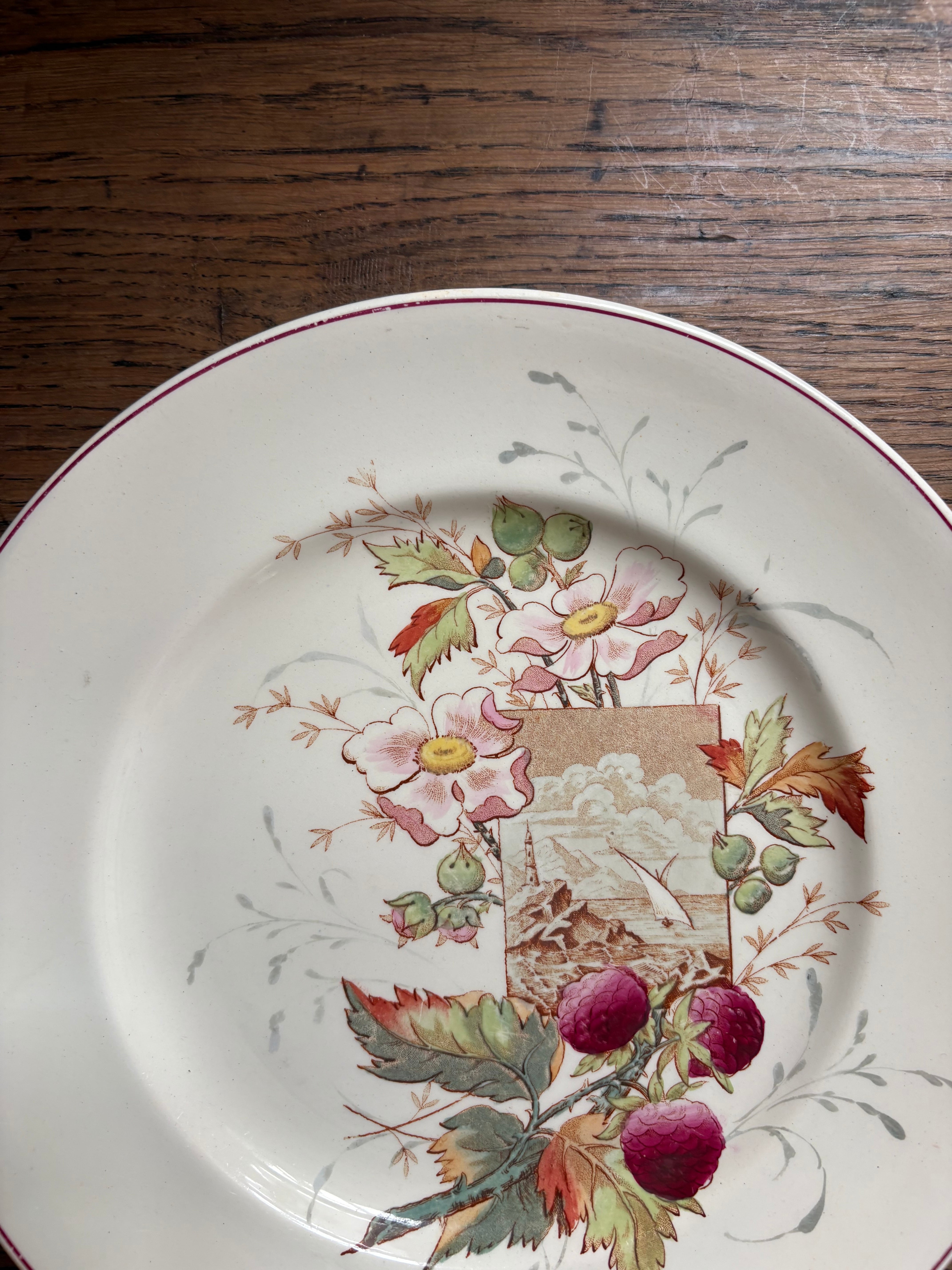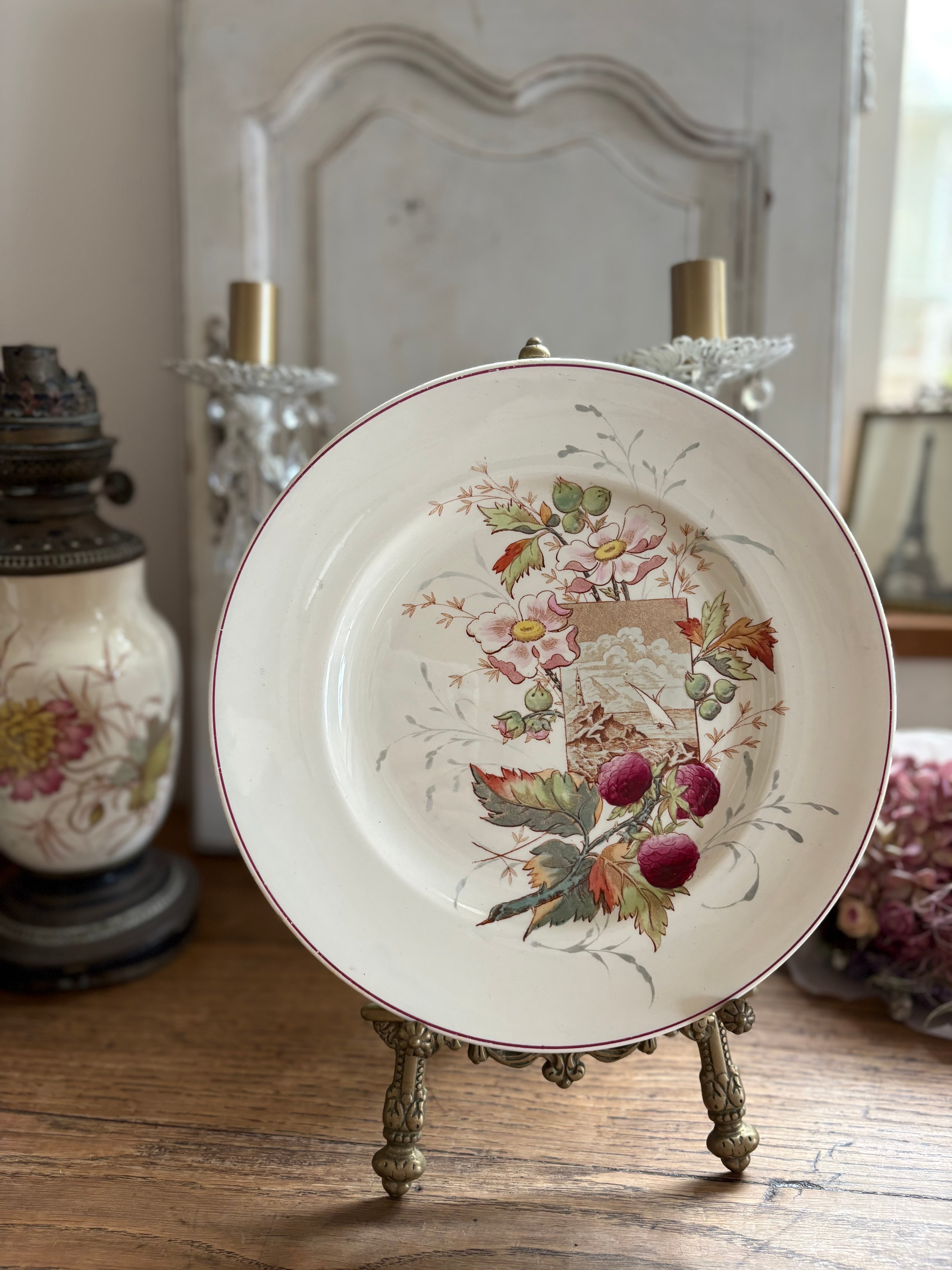 ラズベリー、野薔薇と共に海辺のワンシーンが添えられたプレート、ポリクロームの絵付けされた美しい器となっております。