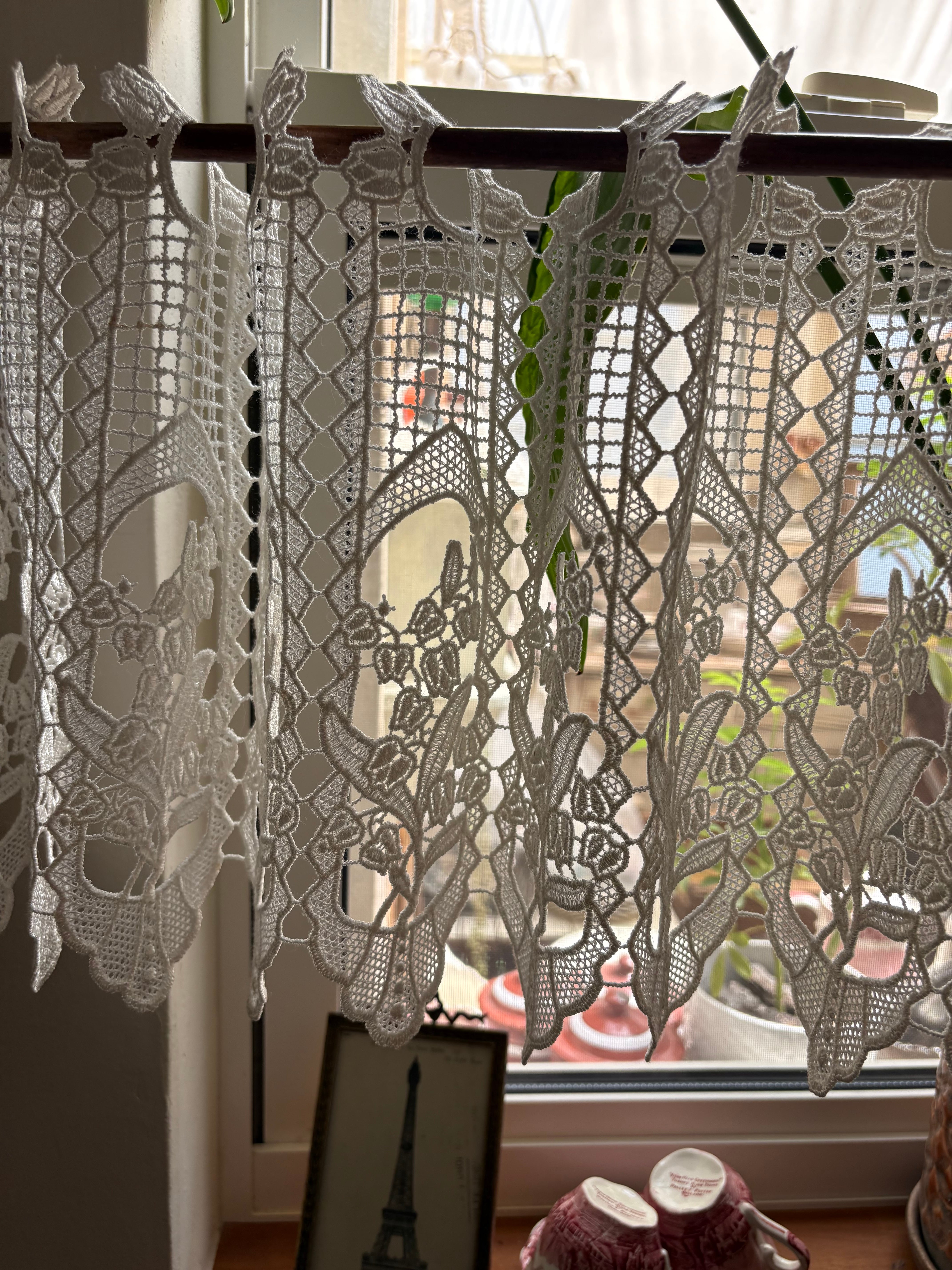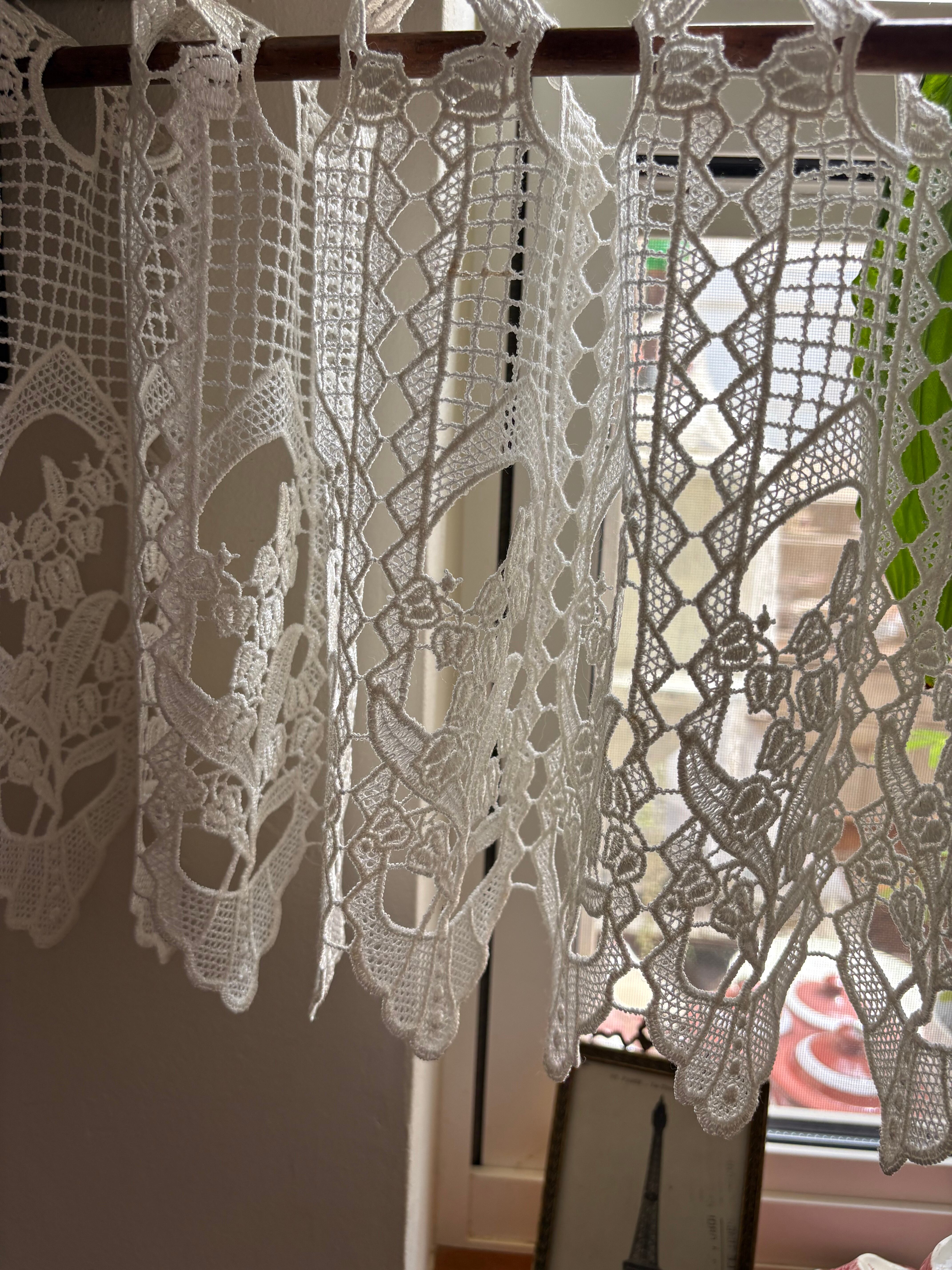 フランス入手のカフェカーテン、スズランの模様が窓辺を彩ります。