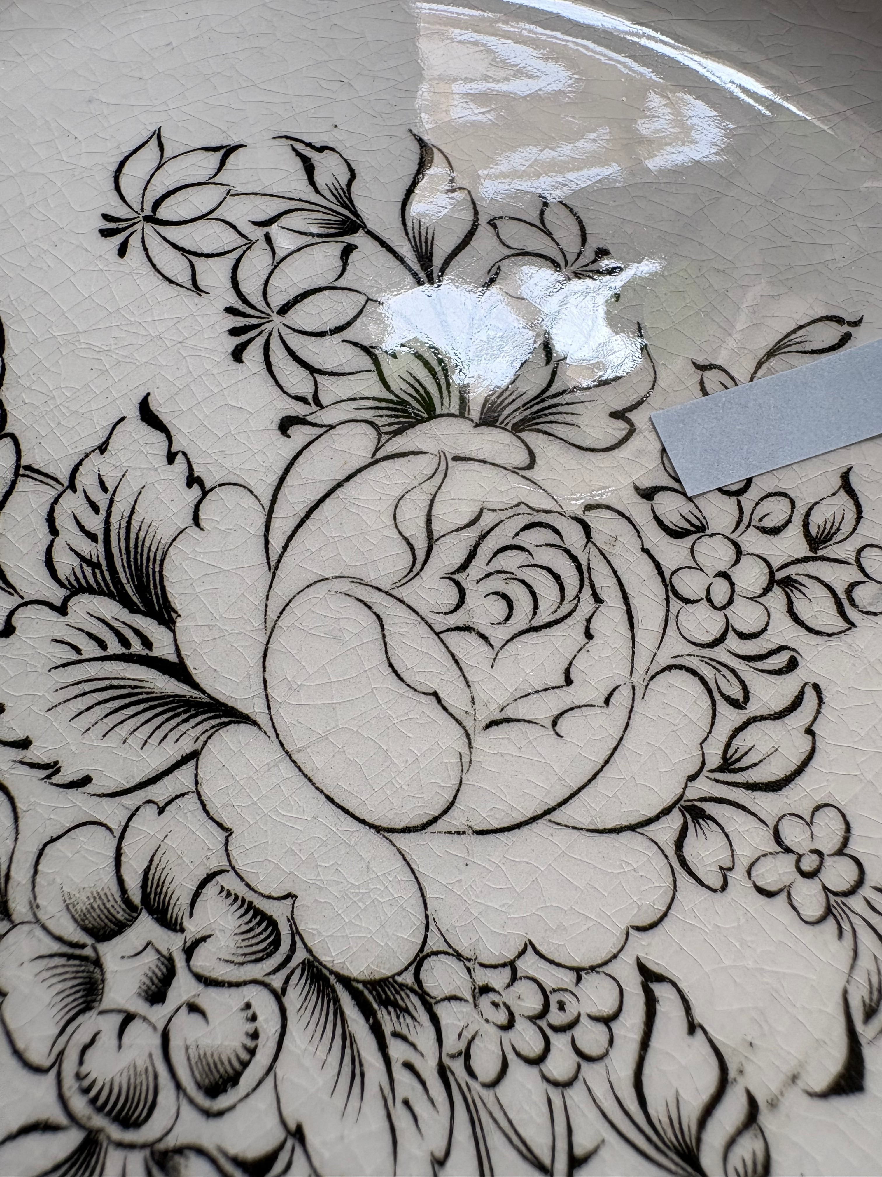 表面花模様の左下に黒いインク飛び又は黒いシミが見受けられます。