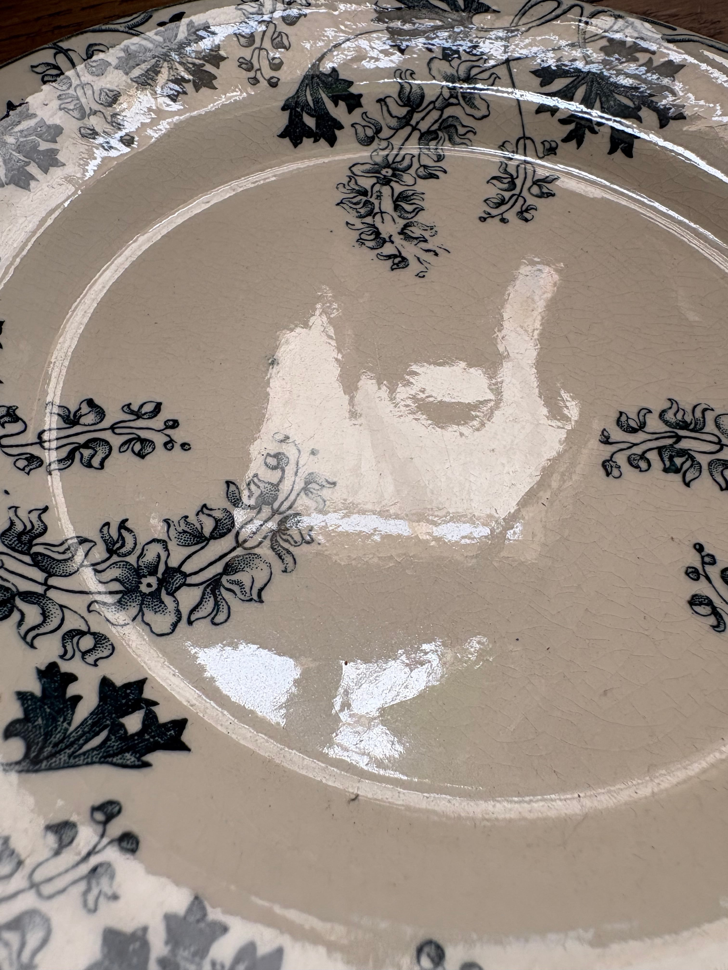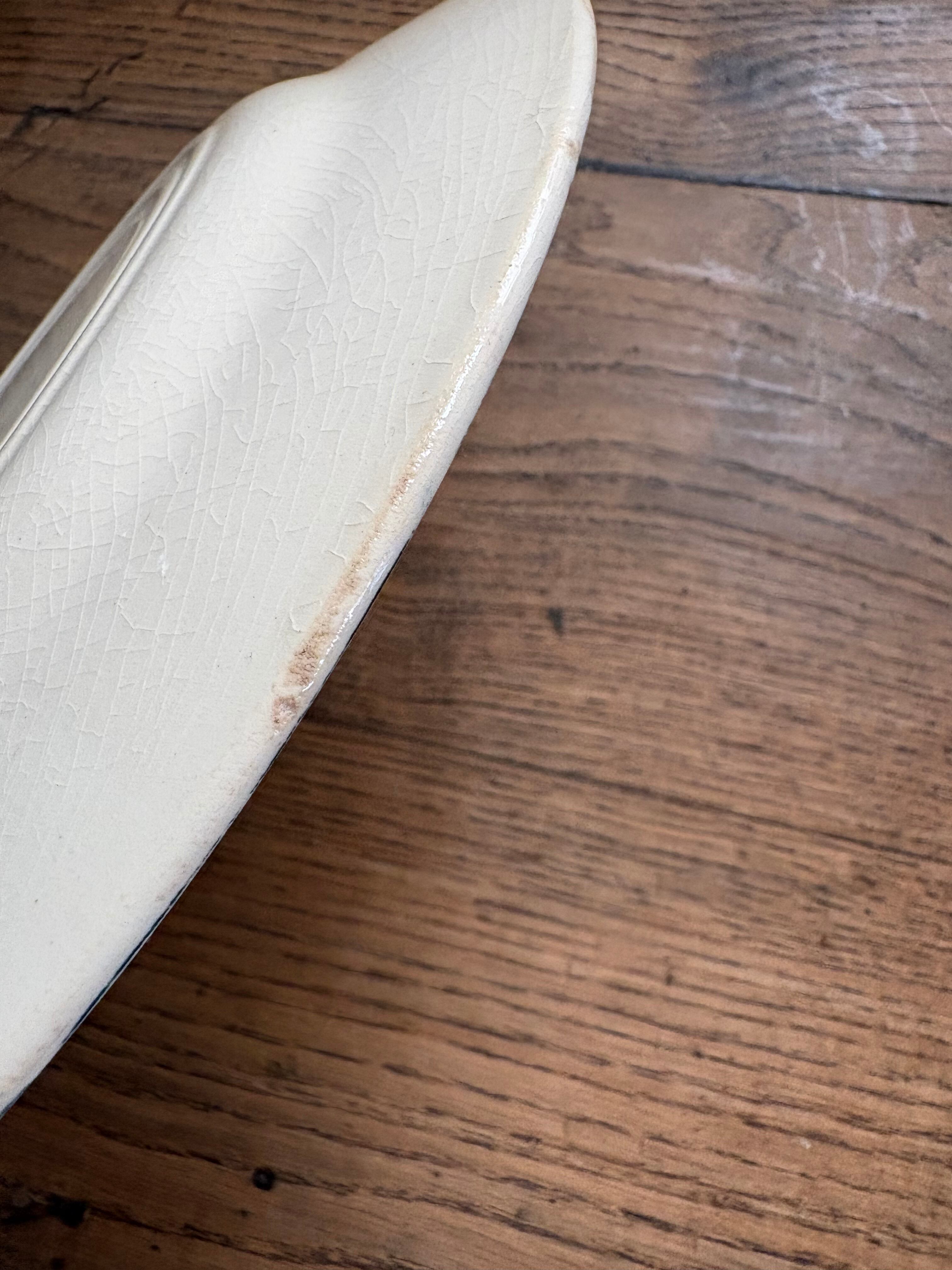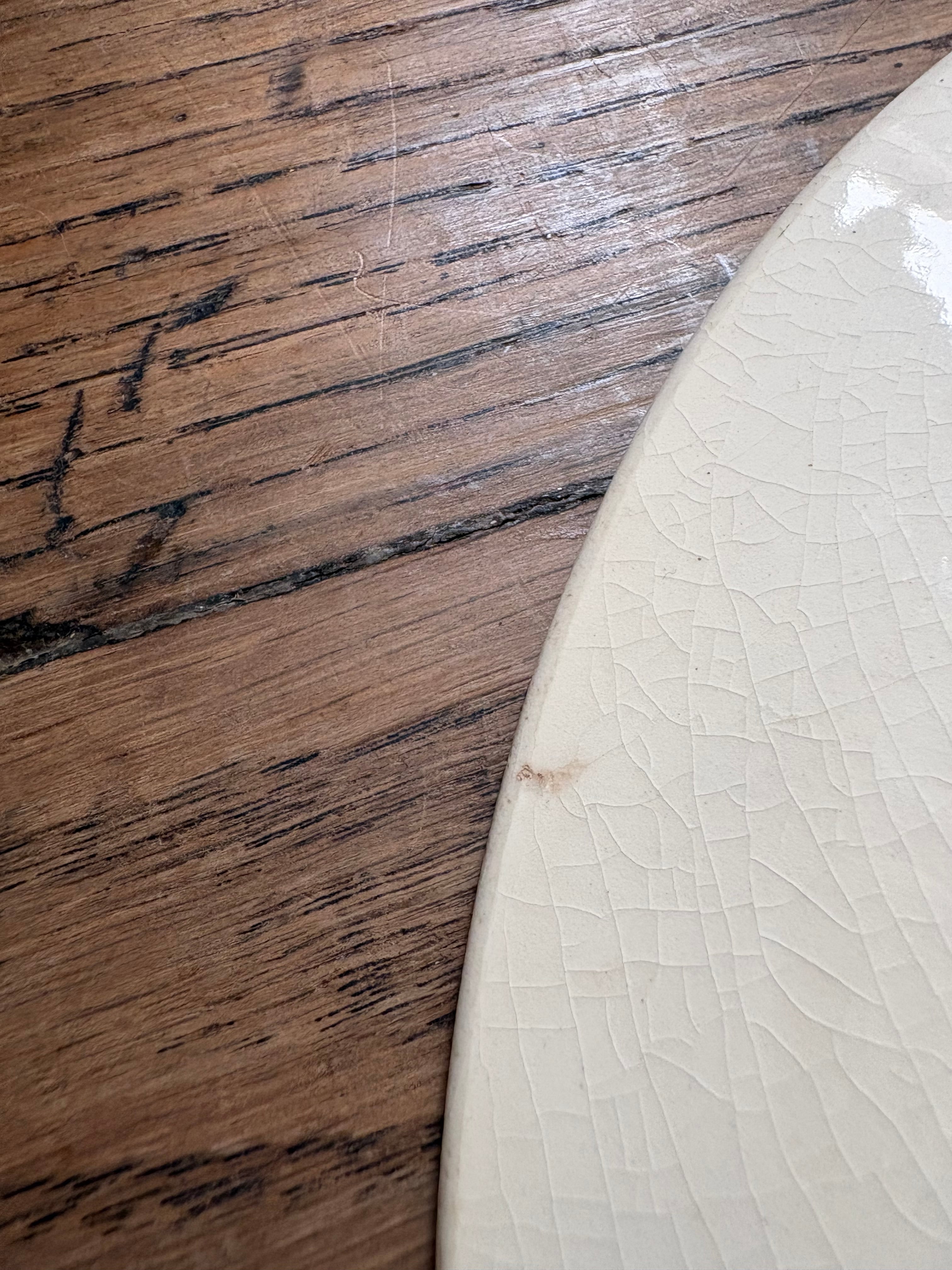 比較的艶もありカトラリー跡はございませんが貫入が見受けられます。プレート縁には古い傷が数箇所ございます。インク飛びも表面にございます。