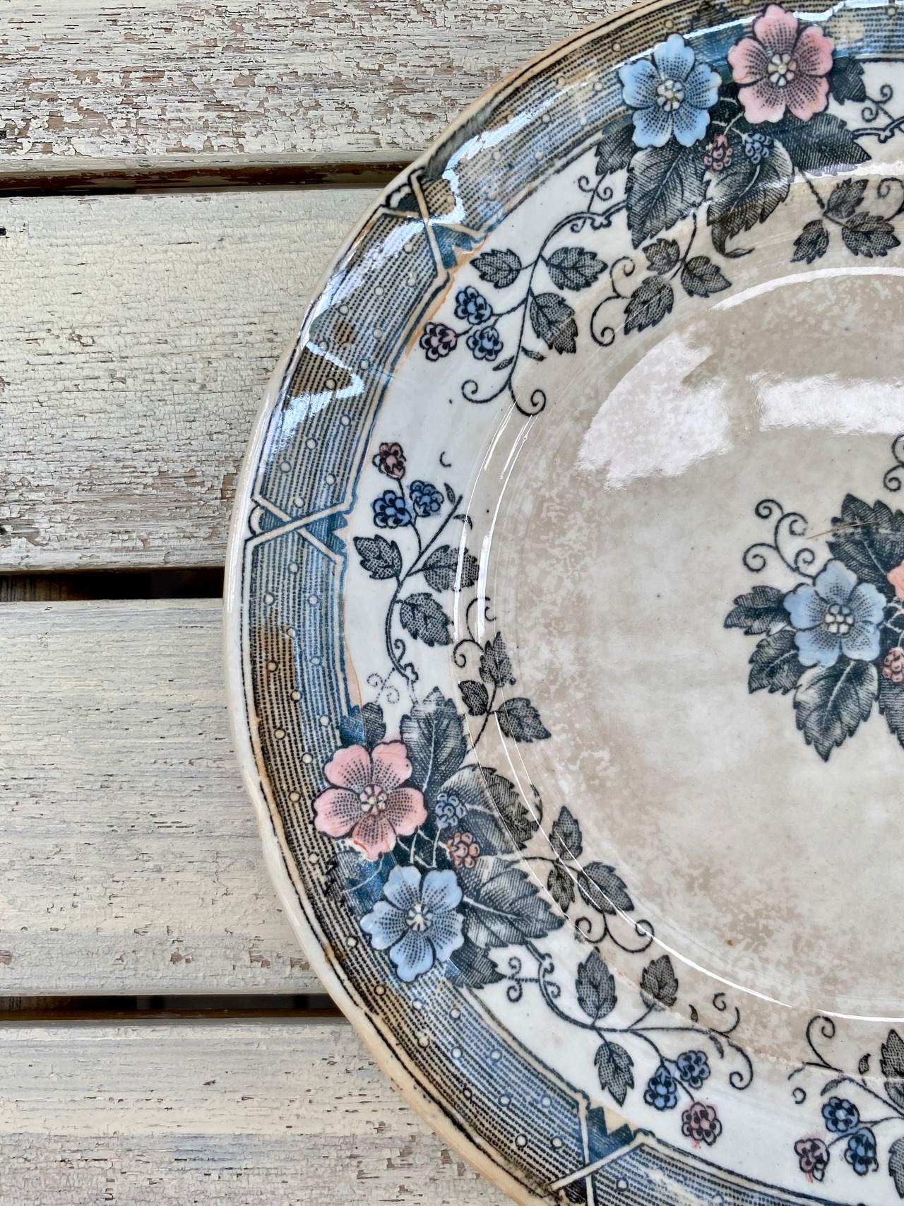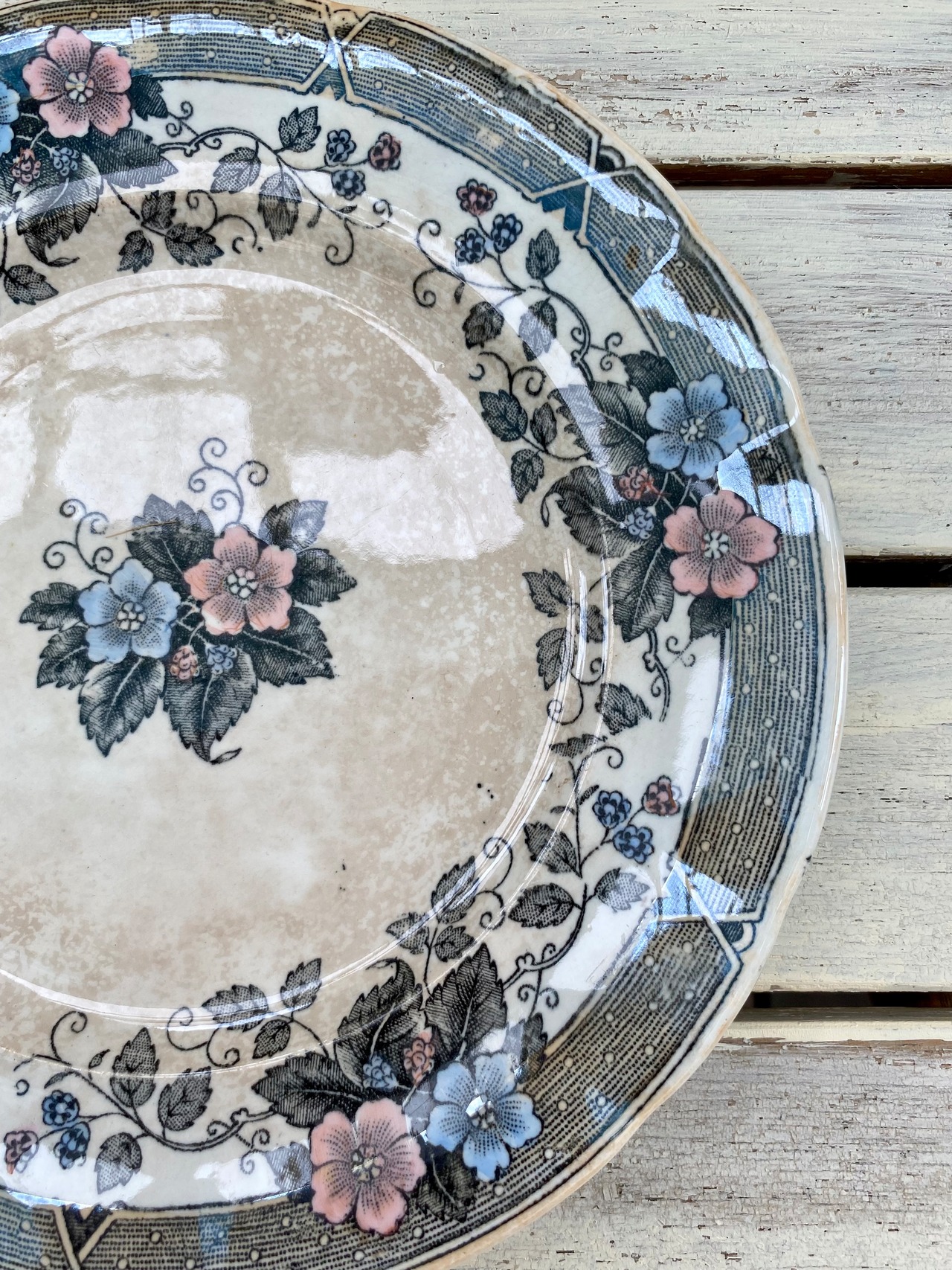 エクリュカラーをベースにしたリムも黒のラインで引き締まり、淡い花模様は昭和レトロな印象にも見えます。