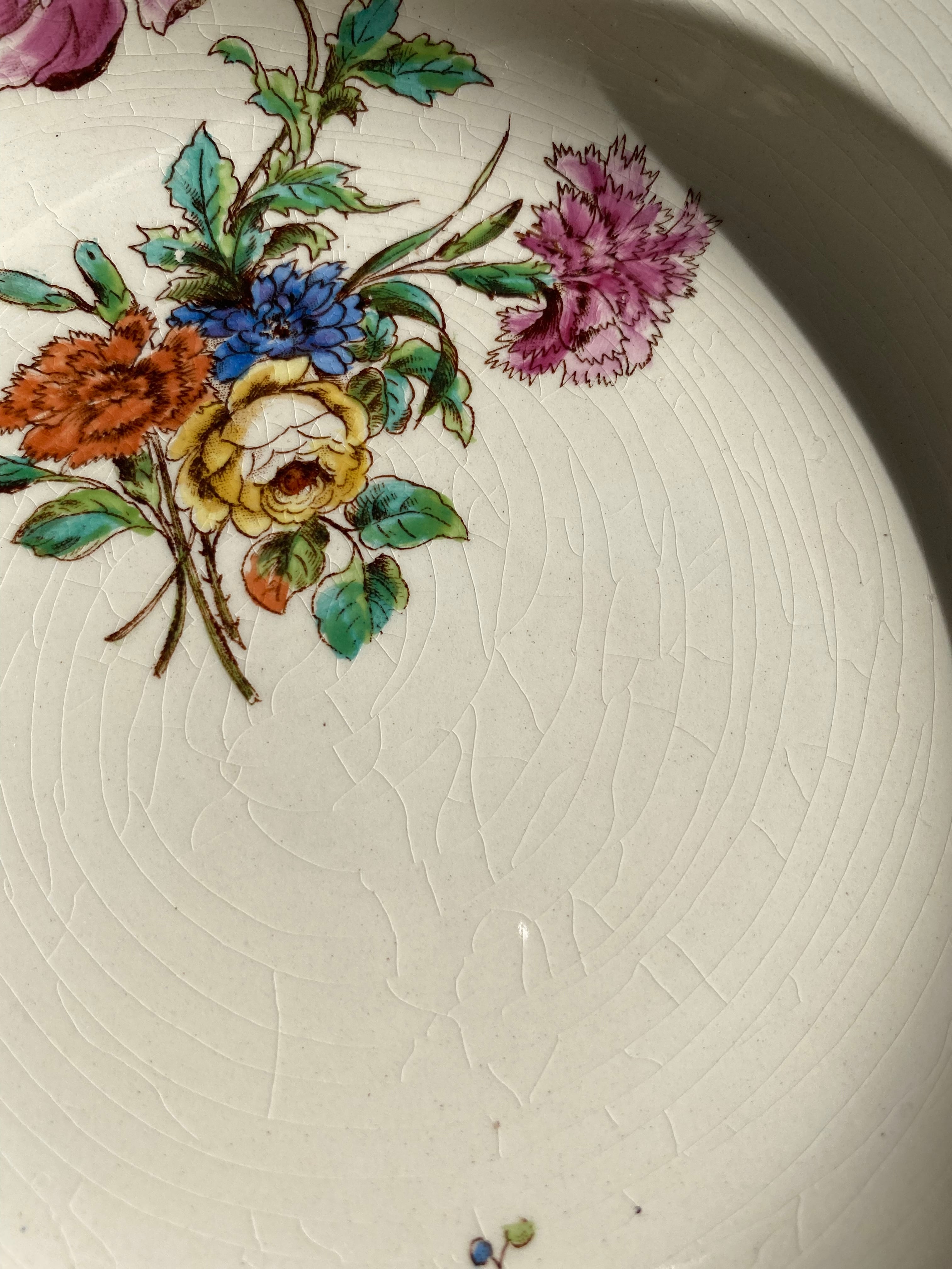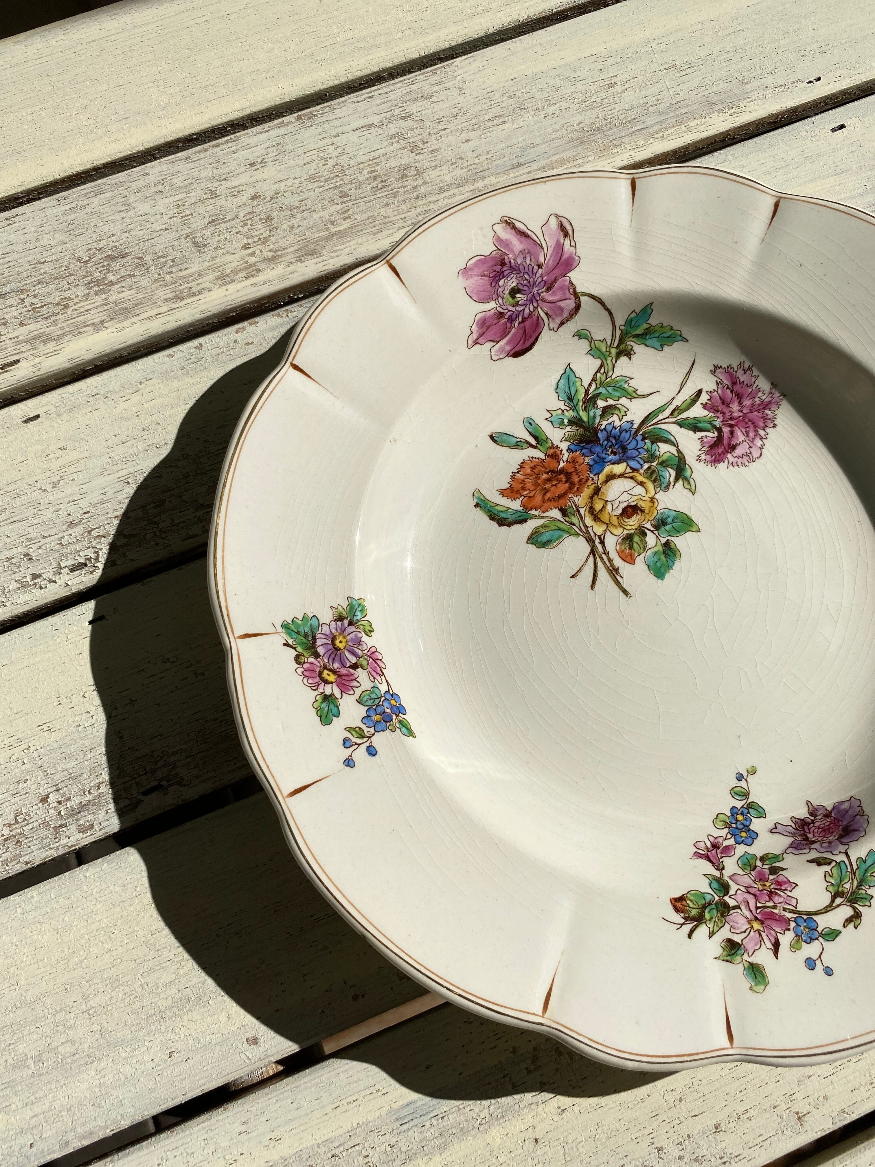 ハンドペイントによる美しい花々が目を惹くLongchampの深皿プレート。色鮮やかで繊細なタッチで描かれたパープルのアネモネやカーネーション、ほかの花達も微笑んでくれてるように見えて、思わず眺めていたくなるそんなプレートです。Terre de fer の商標も刻印されています。