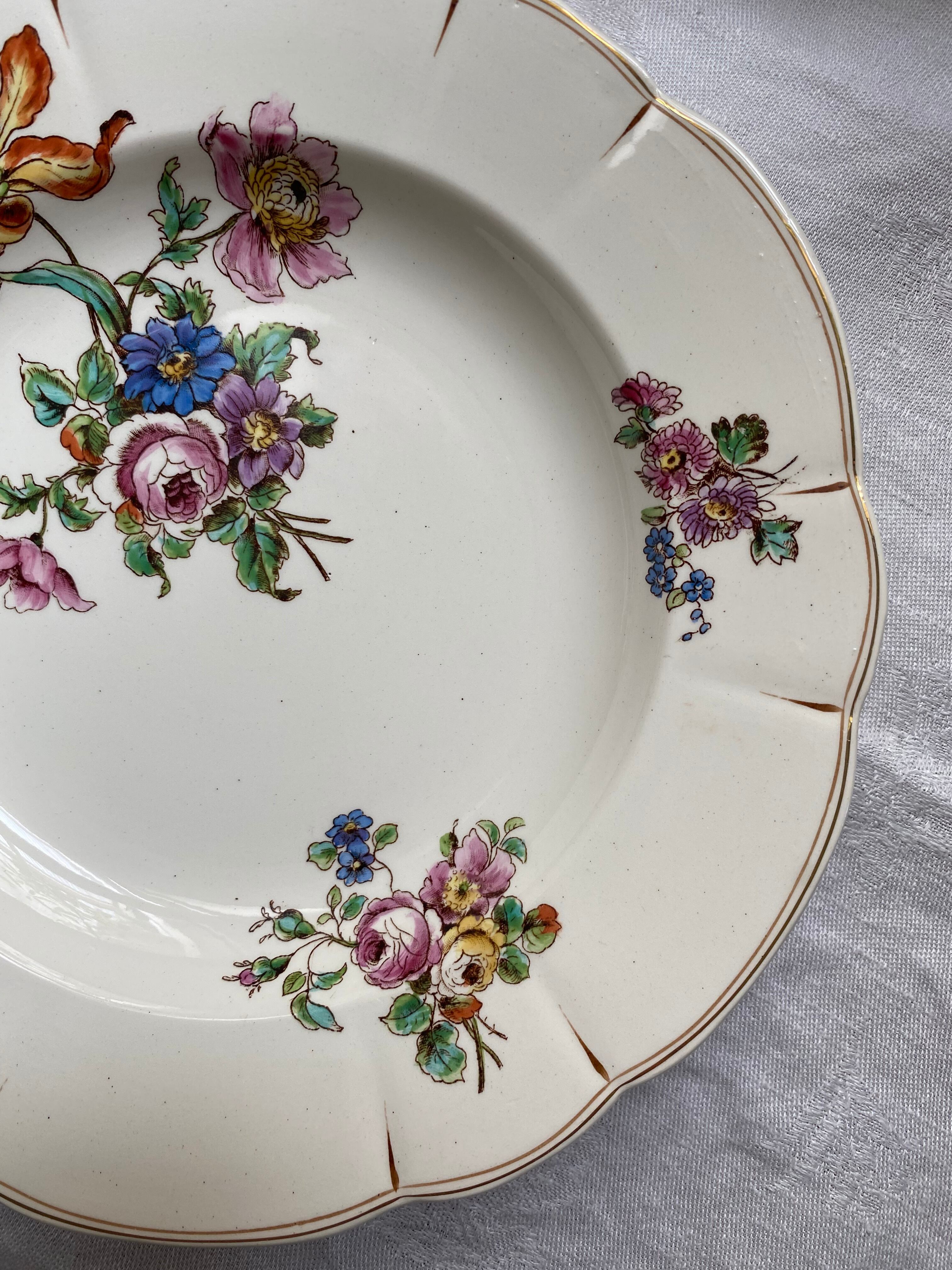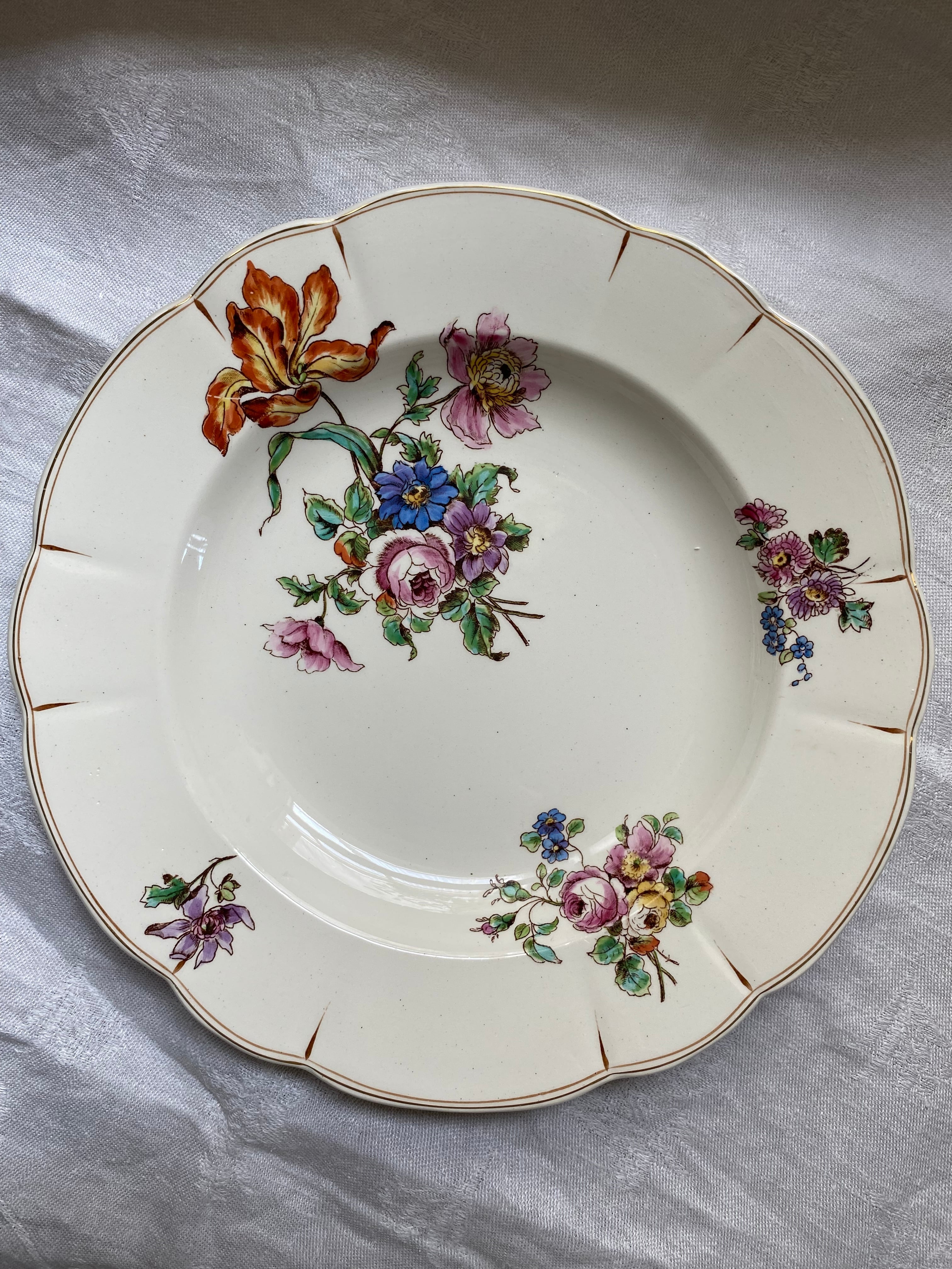 ハンドペイントによる美しい花々が目を惹くLongchampの深皿プレート。色鮮やかで繊細なタッチで描かれたアイリスやアネモネ、他の花達も微笑んでくれてるように見えて、思わず眺めていたくなるそんなプレートです。Terre de fer の商標も刻印されています。