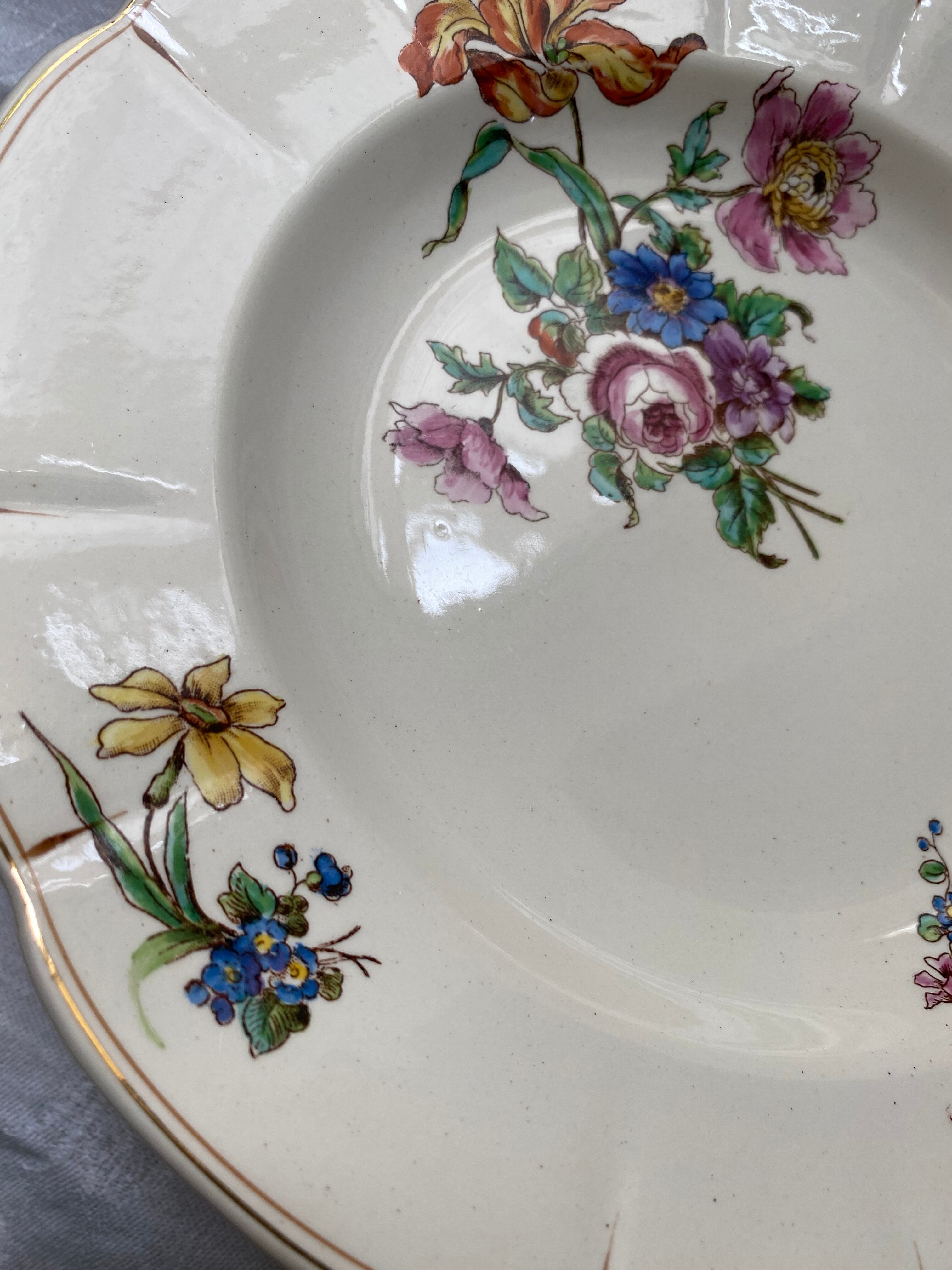 ハンドペイントによる美しい花々が目を惹くLongchampの深皿プレート。色鮮やかで繊細なタッチで描かれたアイリスやアネモネ、他の花達も微笑んでくれてるように見えて、思わず眺めていたくなるそんなプレートです。Terre de fer の商標も刻印されています。