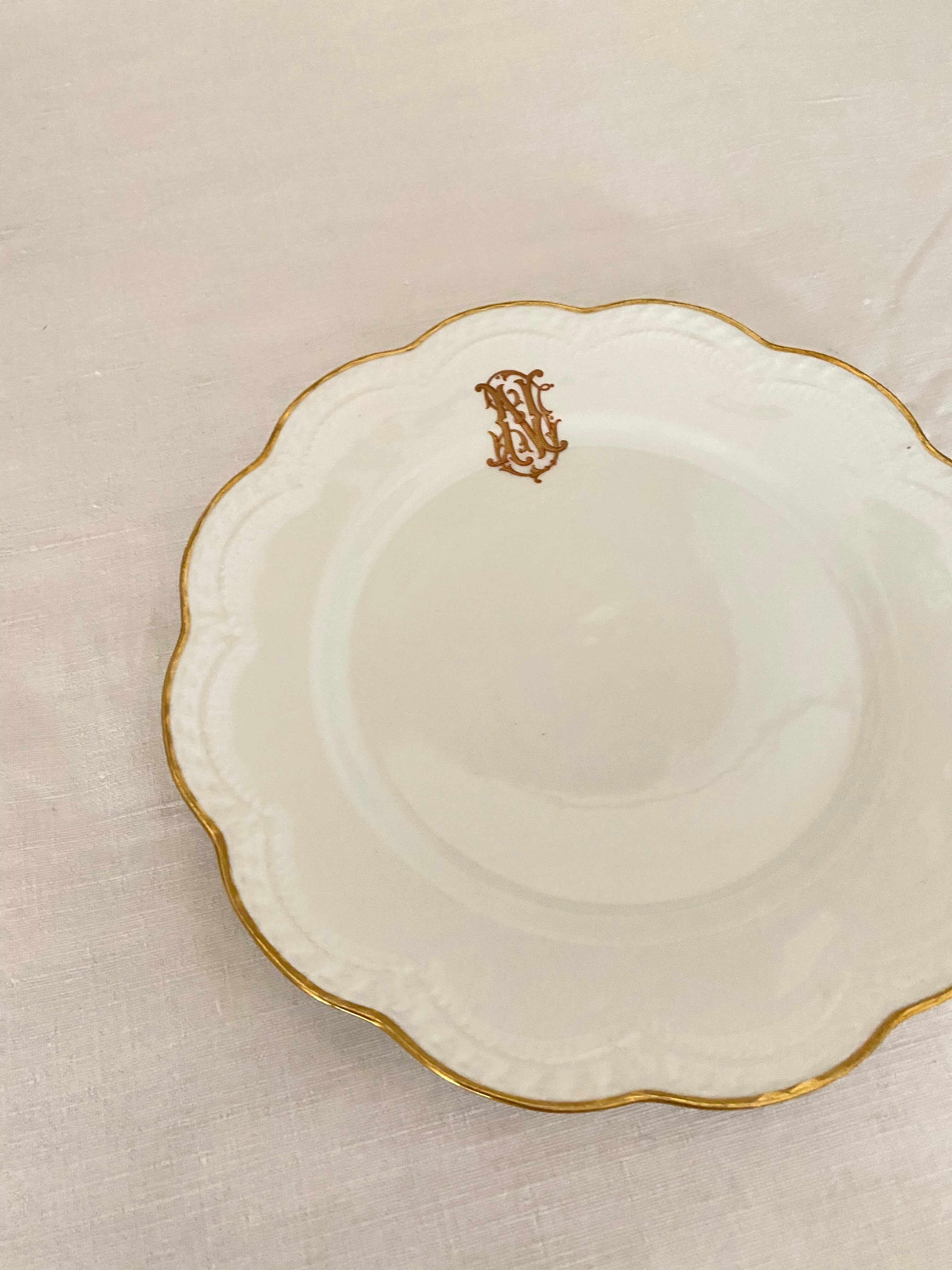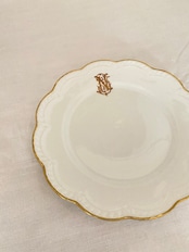 Limogesのホワイトとゴールドの美しさが際立つデザートプレート。「N」と「T」の優美なモノグラムがアクセントとなっています。ゴールドの花リムの形状もエンボスと共に優しい雰囲気となっています。