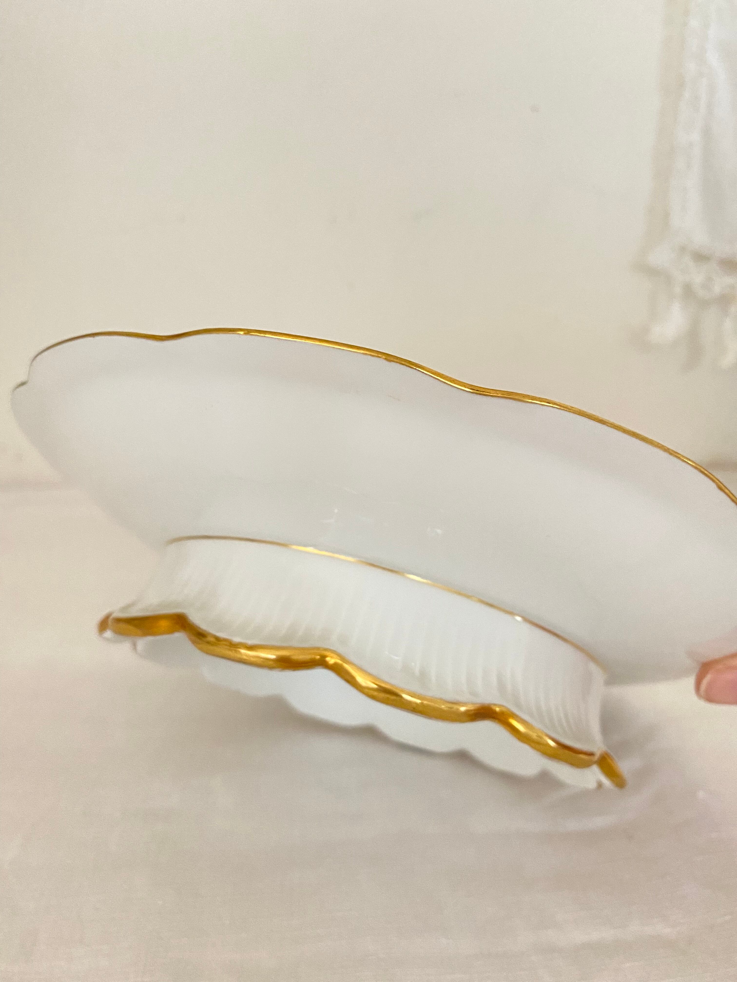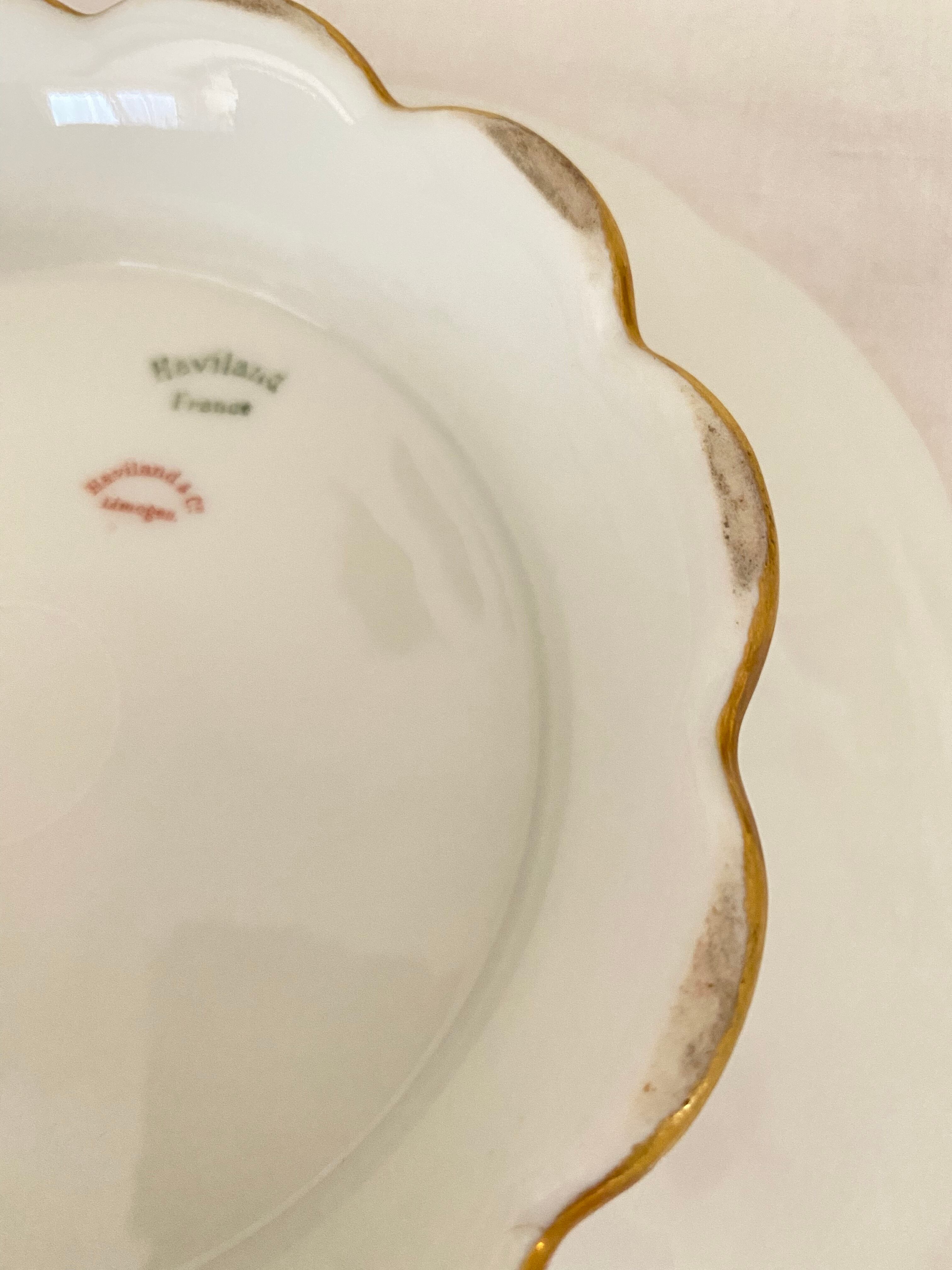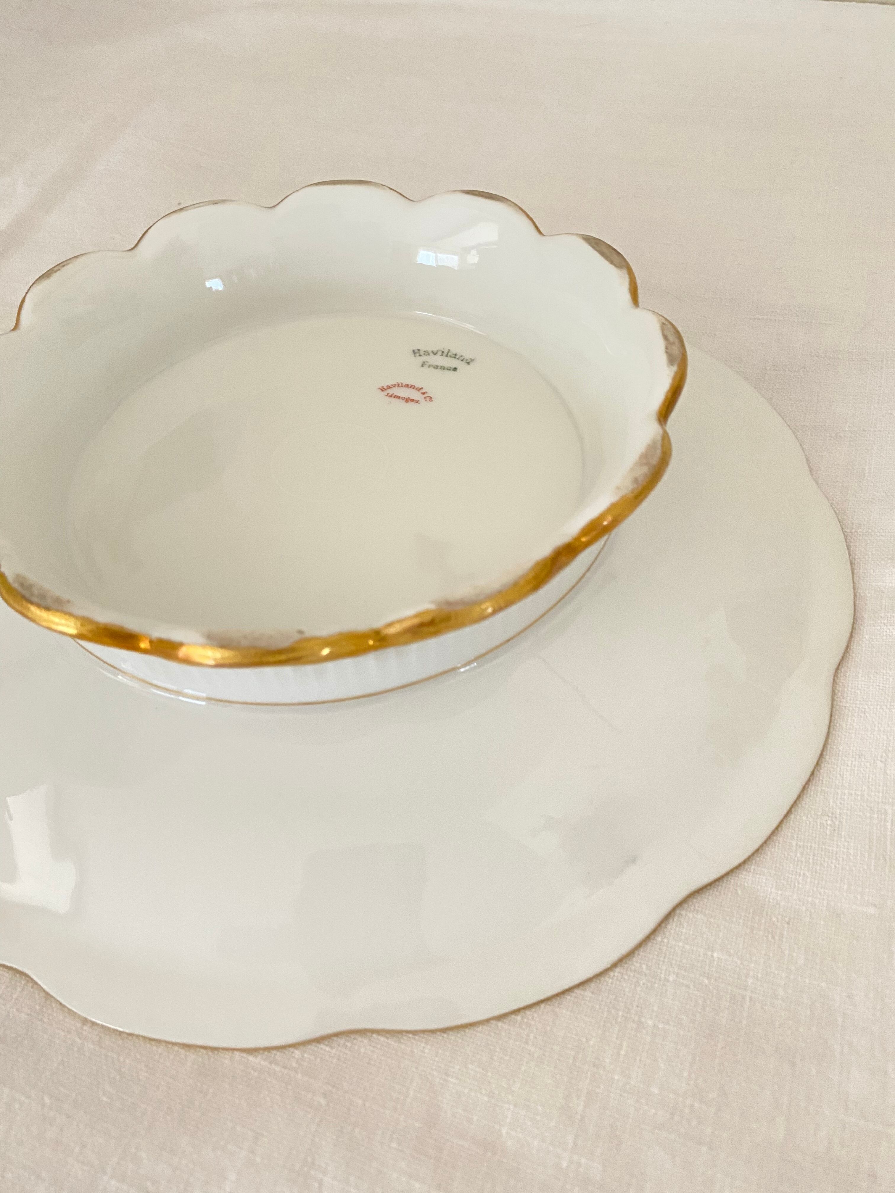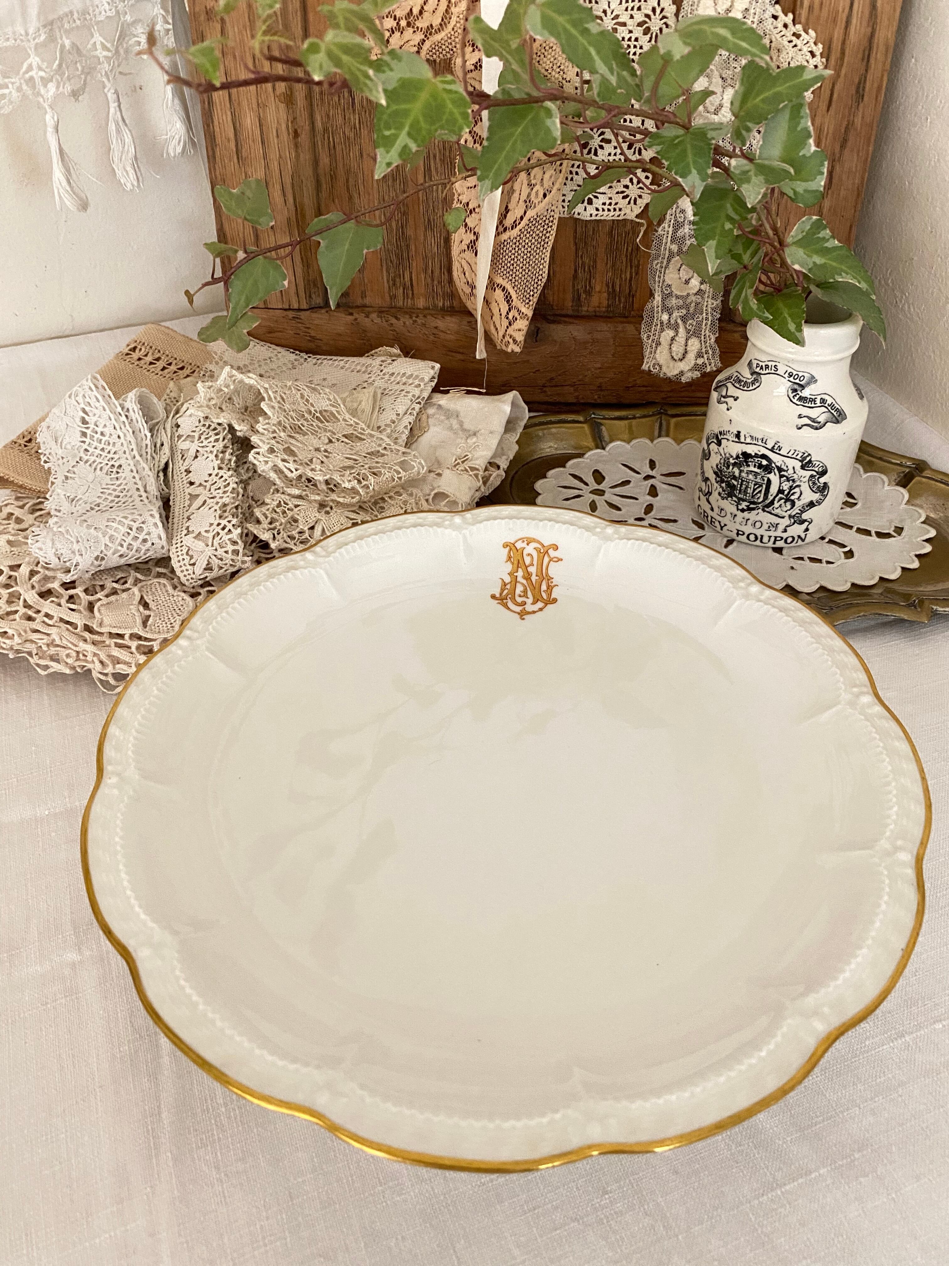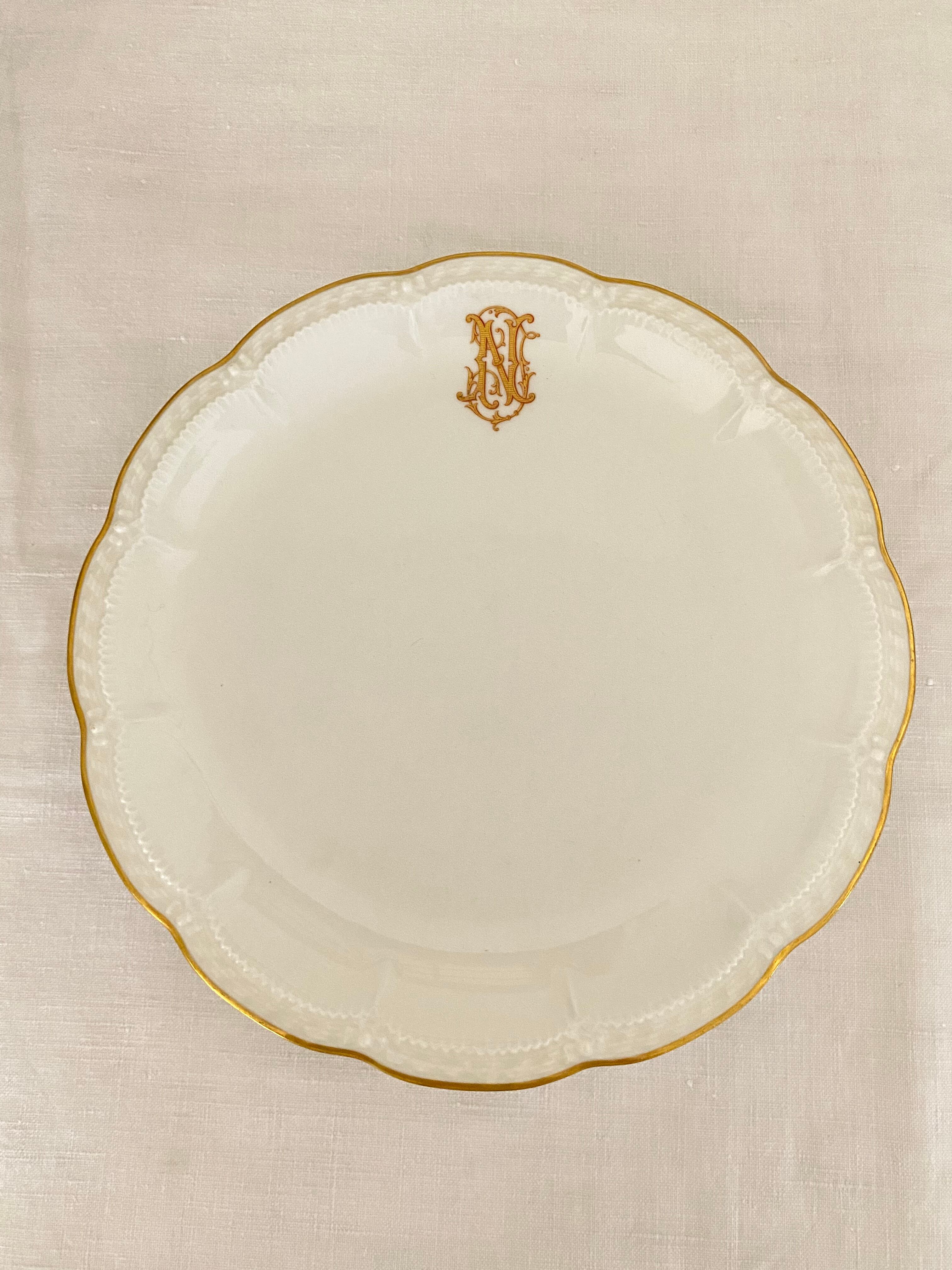 Limogesのホワイトとゴールドの美しさが際立つ足付きのプレート。「N」と「T」の優美なモノグラムがアクセントとなっています。ゴールドの花リムの形状もエンボスと共に優しい雰囲気となっています。