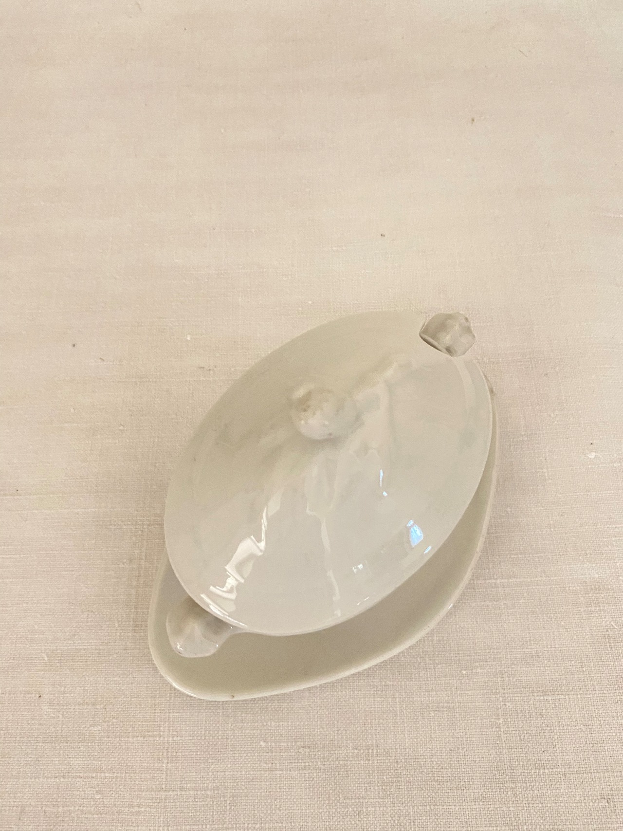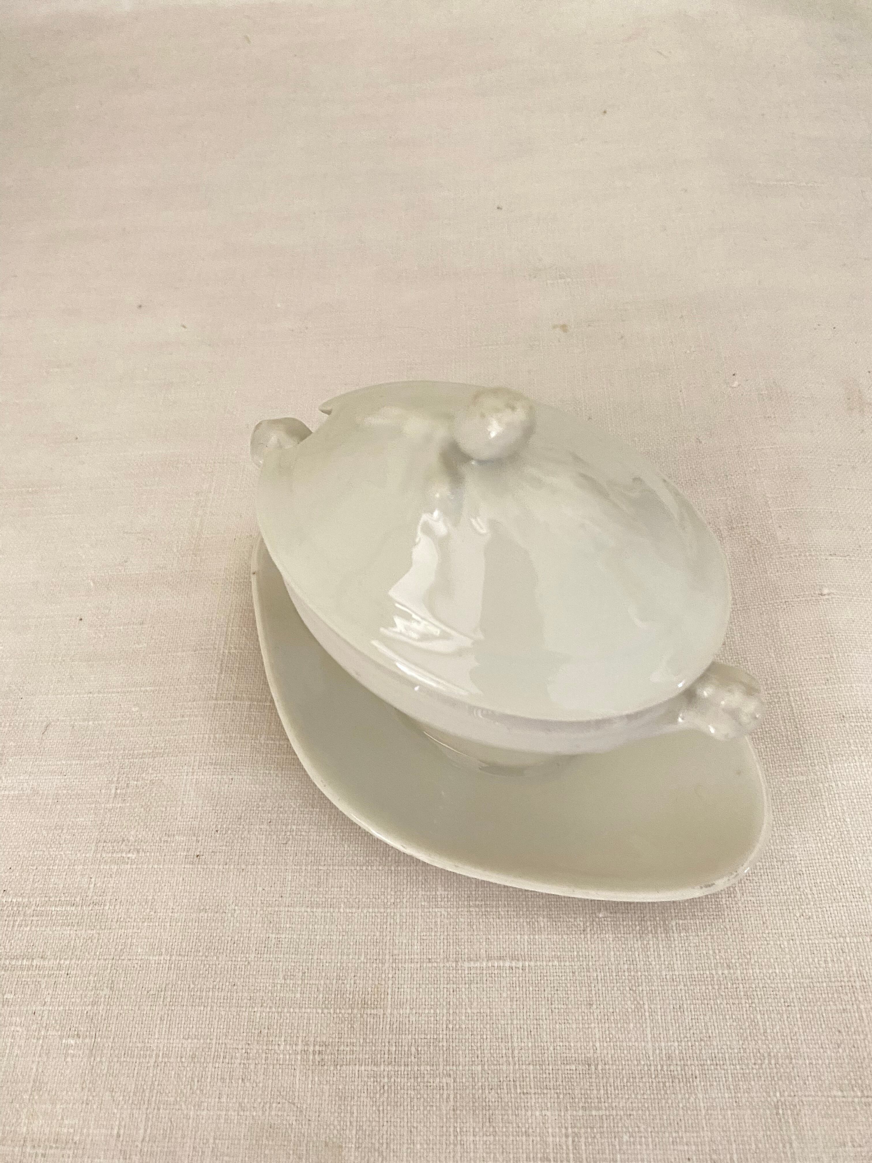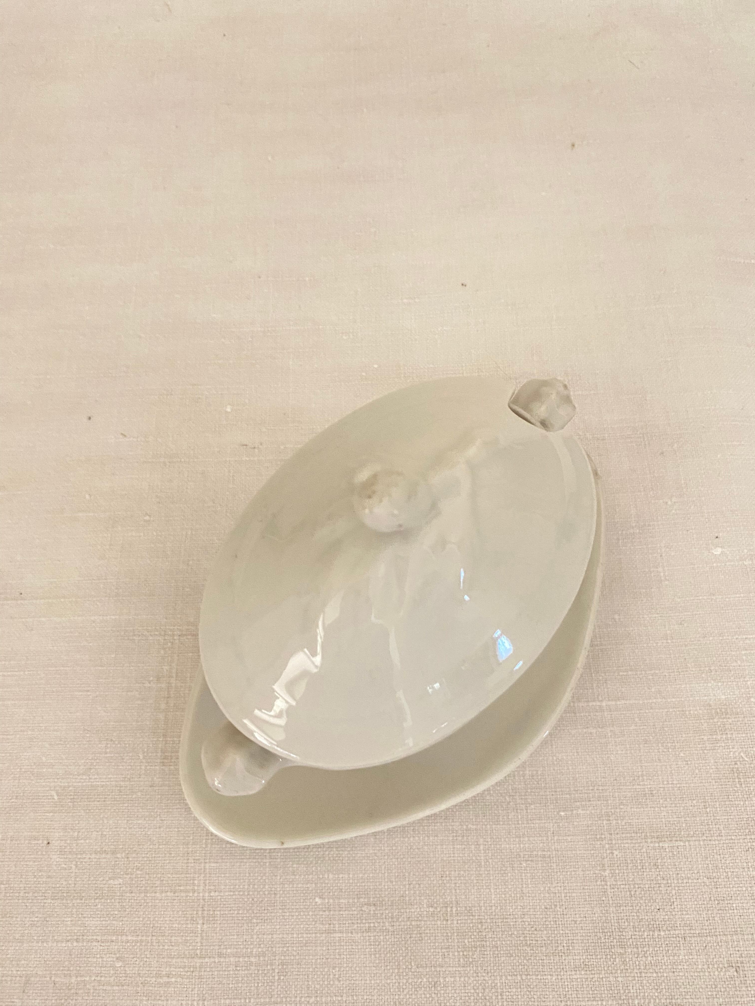 フレンチアンティークの蓋付きムタディエール。白い磁器製のつるんとした質感や艶やかな光沢感に加え、陶器の様にぽってりした厚みもある、アンティークのムタディエール(マスタード入れ)です。立体的なリーフ柄の上に、ポムドパン(松ぼっくり)の持ち手が付いた蓋は、オーバル型の屋根型になっていて立体感があります。脚付きクッペ型のオーバル型ボディには、小さなハンドルが付いて、ソーシエールの様な佇まい。一体化したダイヤ型の受け皿も美しいカーブを描き、絵になるシルエットに作られています。蓋を開けて、マスタードやよく使うお気に入りの調味料や薬味入れに。テーブルセッティングに拘りたいおもてなしの場面で、フレンチアンティークのこんな素敵なムタディエールが登場すれば、ぐっと雰囲気のあるテーブルになってくれます。昔ながらの手作りの白磁器の味のある風合いがアンティークならではで、温もりがあります。とっても小さくて可愛い佇まいの、フレンチアンティークムタディエールです。