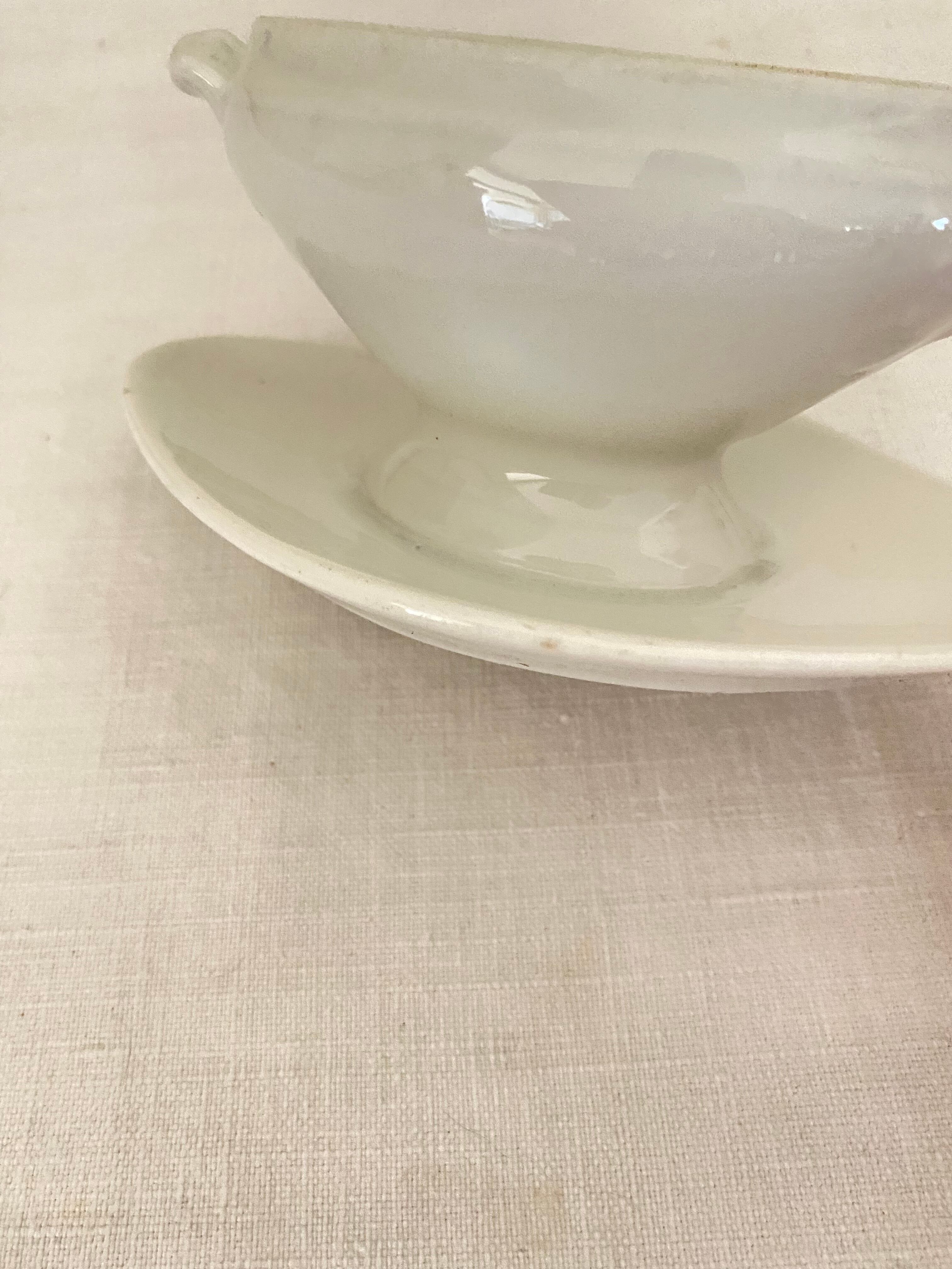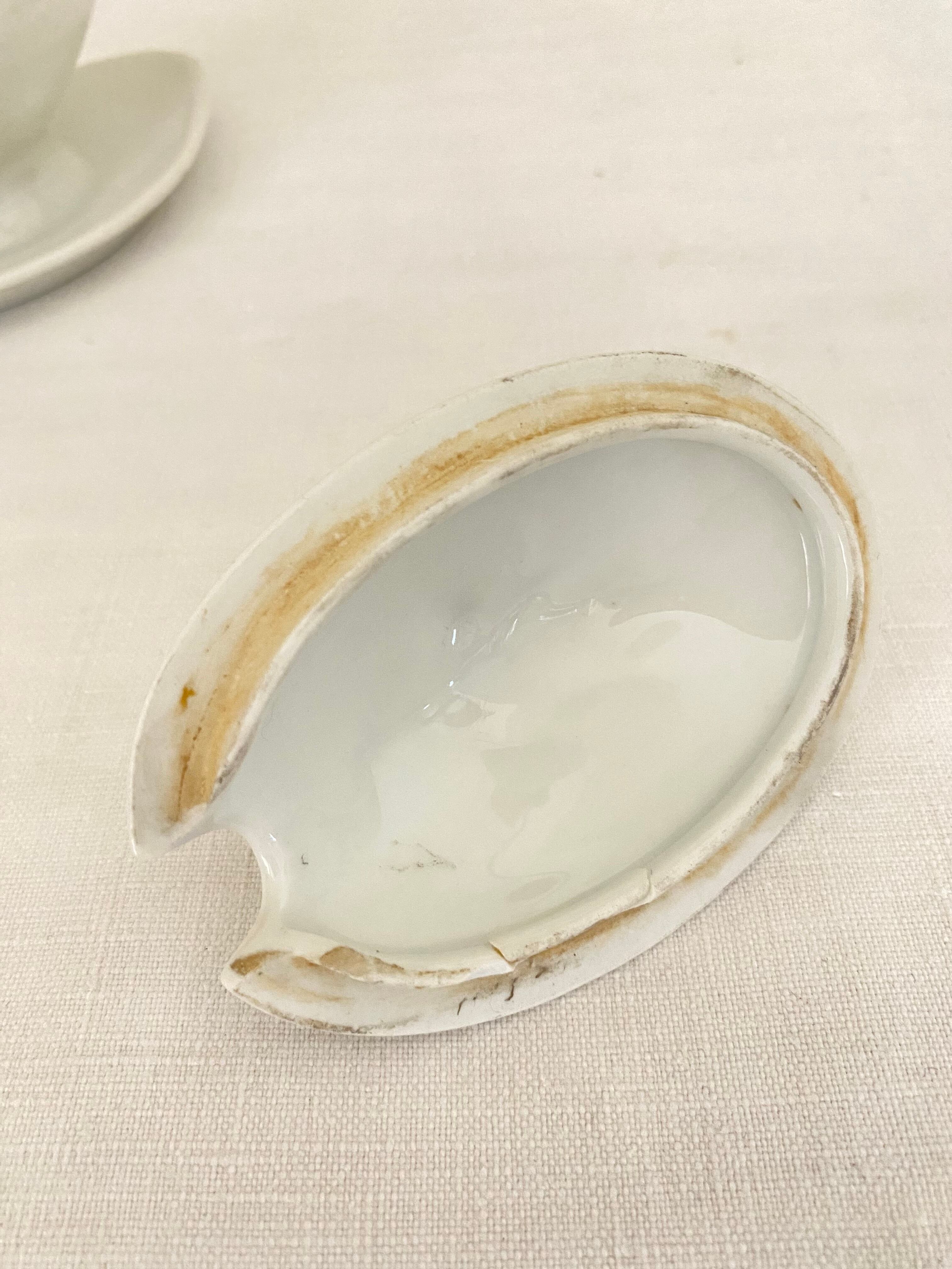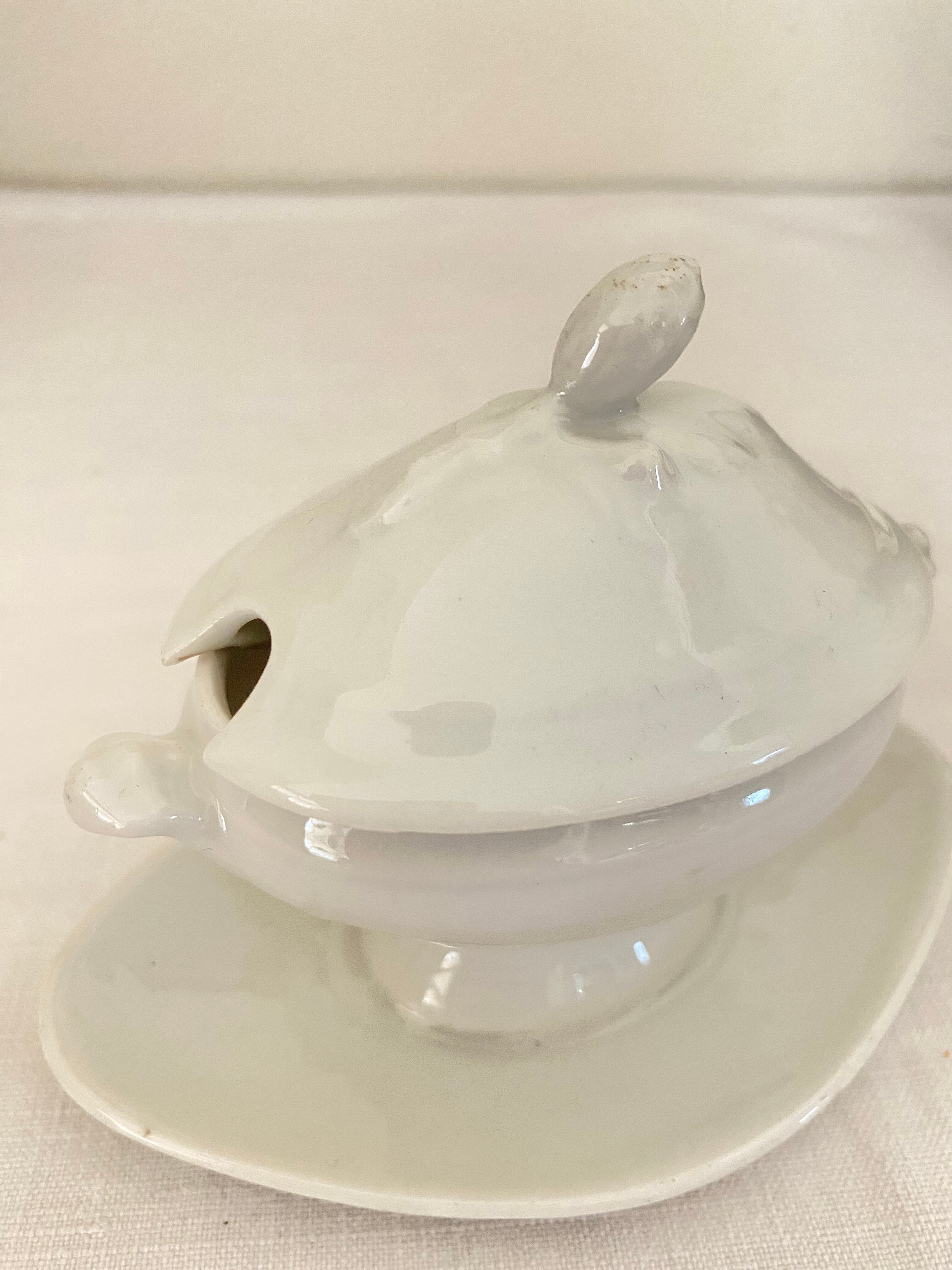 フレンチアンティークの蓋付きムタディエール。白い磁器製のつるんとした質感や艶やかな光沢感に加え、陶器の様にぽってりした厚みもある、アンティークのムタディエール(マスタード入れ)です。立体的なリーフ柄の上に、ポムドパン(松ぼっくり)の持ち手が付いた蓋は、オーバル型の屋根型になっていて立体感があります。脚付きクッペ型のオーバル型ボディには、小さなハンドルが付いて、ソーシエールの様な佇まい。一体化したダイヤ型の受け皿も美しいカーブを描き、絵になるシルエットに作られています。蓋を開けて、マスタードやよく使うお気に入りの調味料や薬味入れに。テーブルセッティングに拘りたいおもてなしの場面で、フレンチアンティークのこんな素敵なムタディエールが登場すれば、ぐっと雰囲気のあるテーブルになってくれます。昔ながらの手作りの白磁器の味のある風合いがアンティークならではで、温もりがあります。とっても小さくて可愛い佇まいの、フレンチアンティークムタディエールです。