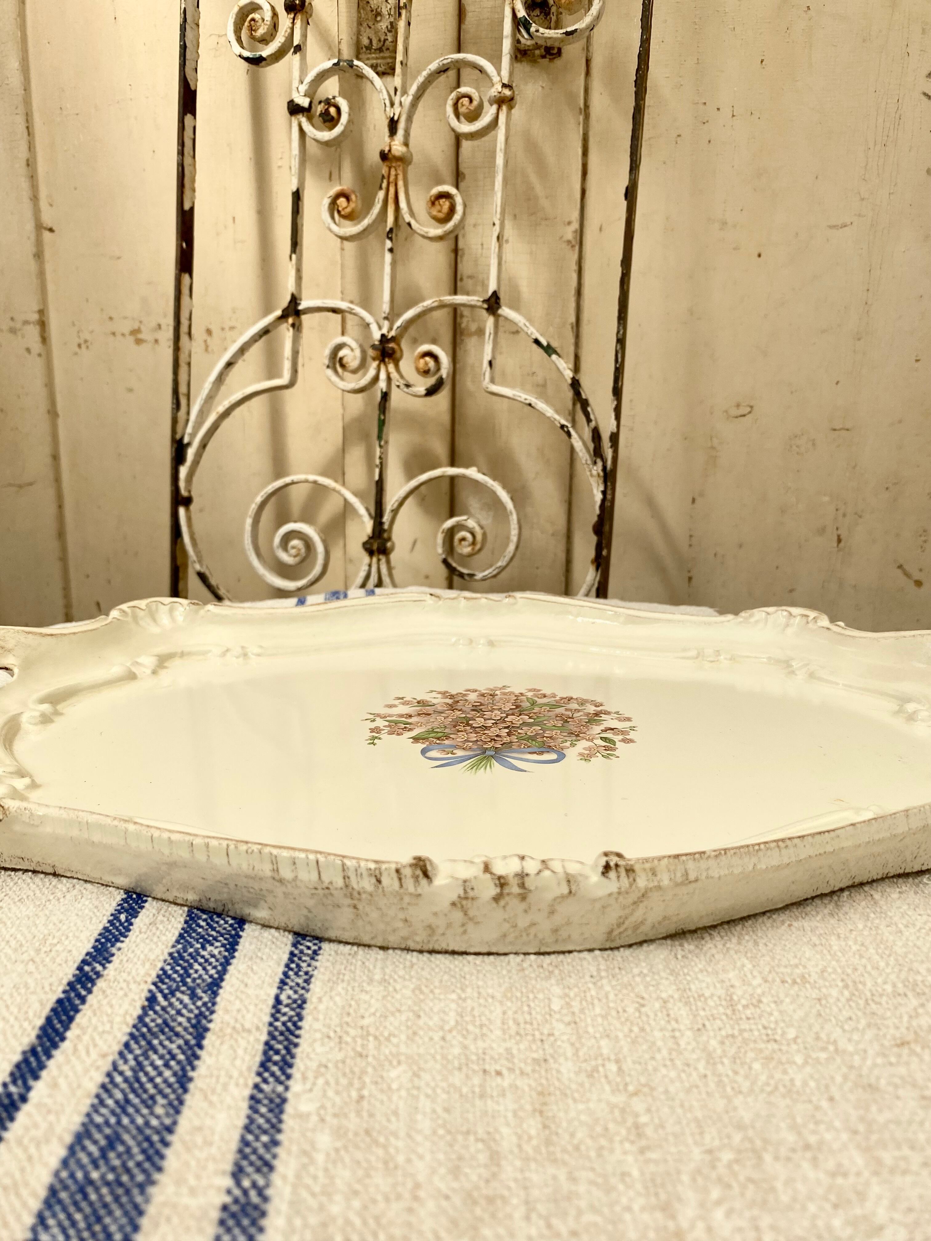 勿忘草のトレーは、フランスヴィンテージのアンティーク雑貨です。ピンクの勿忘草が描かれた可愛らしいデザインが魅力的。お部屋のアクセントとして、またティータイムやおやつタイムに使っても素敵です。大小2サイズ展開で、使い方もお好みで選んでいただけます。