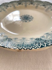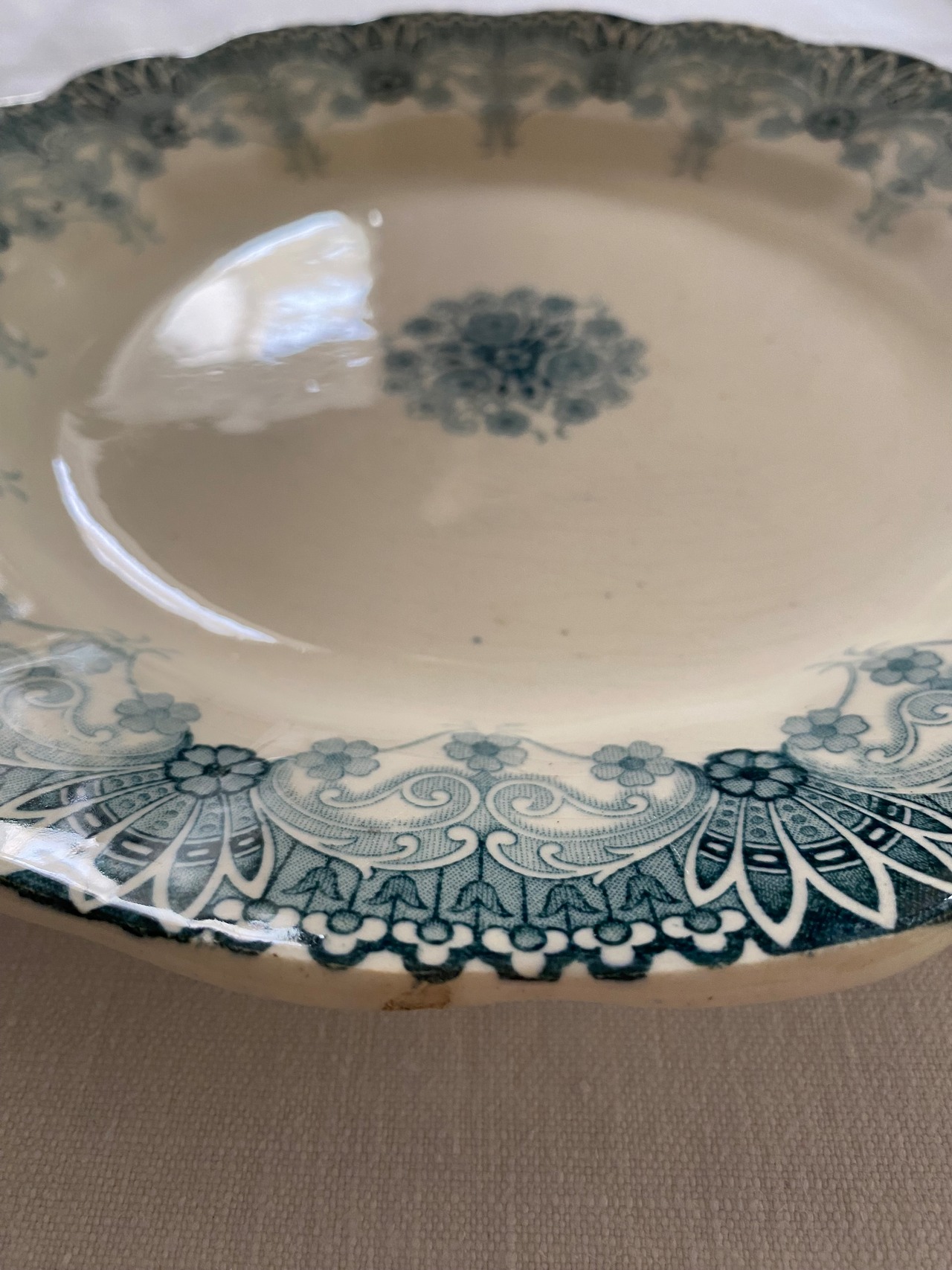 波打つリム、エクリュ色の陶肌に外側から内側に向かってグラデーションするトランスファー柄がとてもエレガントで美しいプレートです。